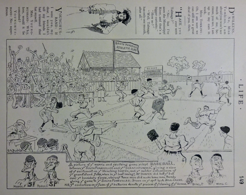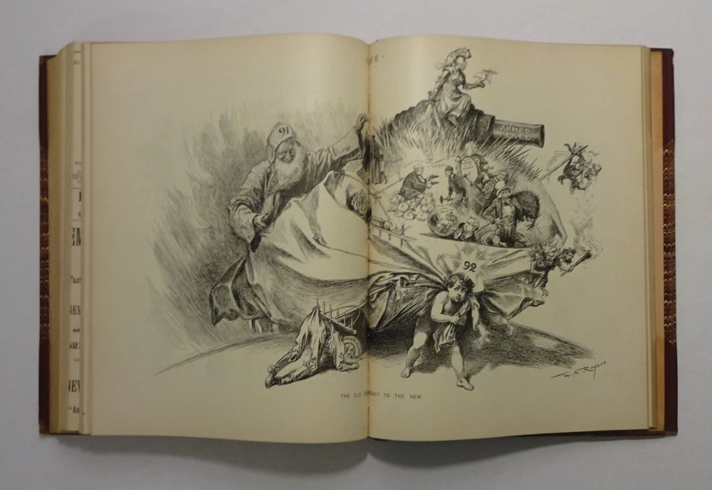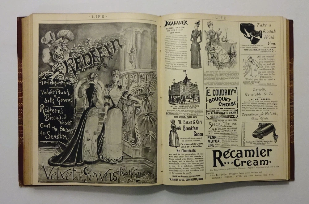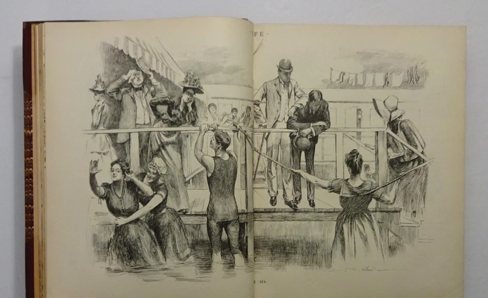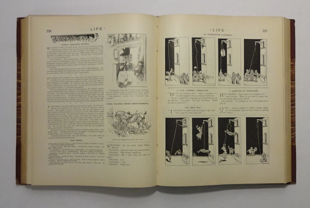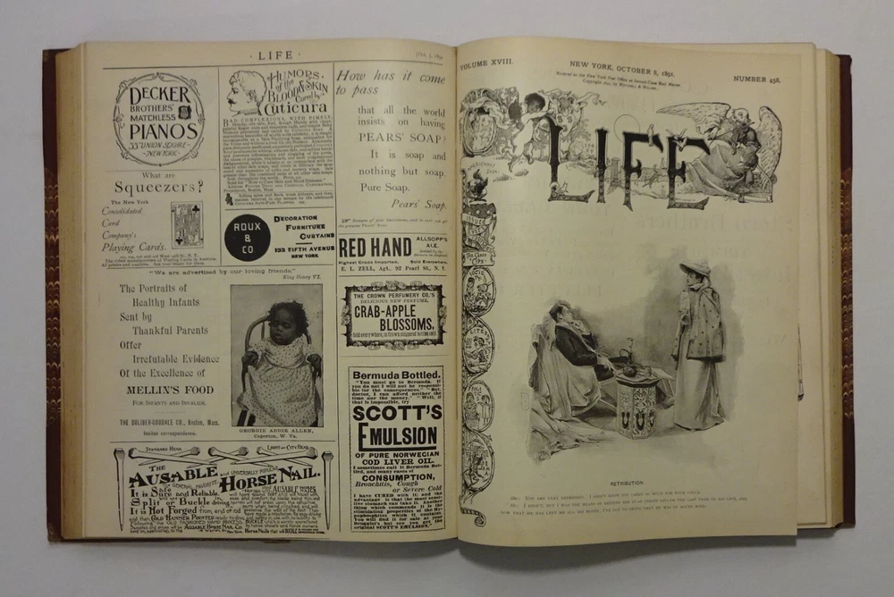 This is a bound volume of 27 issues of the publication "LIFE" magazine ranging in date from July 9, 1891 to December 31, 1891, plus a special "Christmas Number" at the back (which includes illustrations of Santa Claus). The November 19 issue and the "Christmas Number" each have color front covers. The issues are loaded with amazing illustrated advertisements. The New Year's and Christmas issues each contain a wonderful two-page illustration. The issues include works of fiction, non-fiction and poetry, most of which are illustrated. All issues come with their original front covers. Nicely bound in three-quarter leather with marbled covers, and four raised bands and gilt lettering on the spine. The following 27 issues are included: JULY: 9, 16, 23, 30. AUGUST: 6, 13, 20, 27. SEPTEMBER: 3, 10, 17, 24. OCTOBER: 1, 8, 15, 22, 29. NOVEMBER: 5, 12, 19, 26 DECEMBER: 3, 10, 17, 24, 31. Christmas Number.