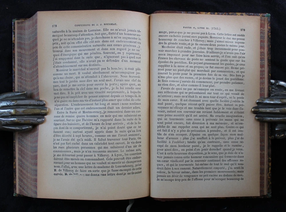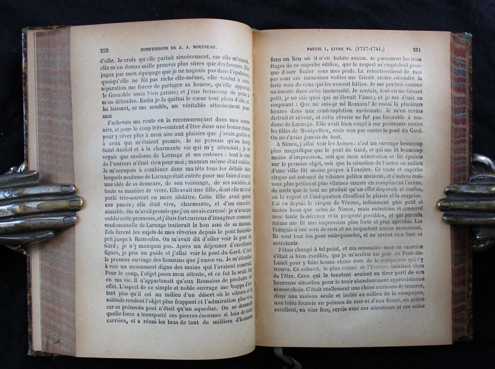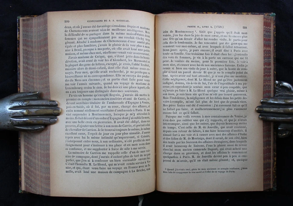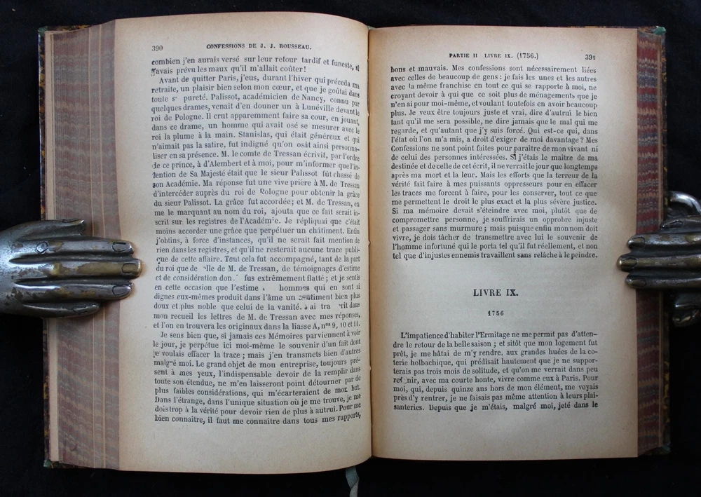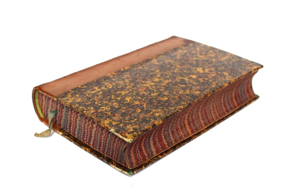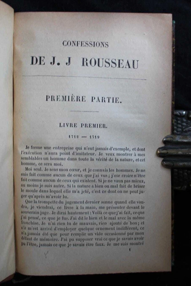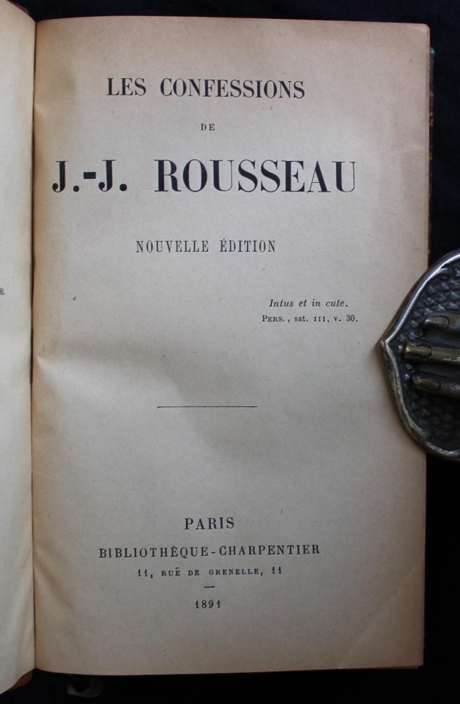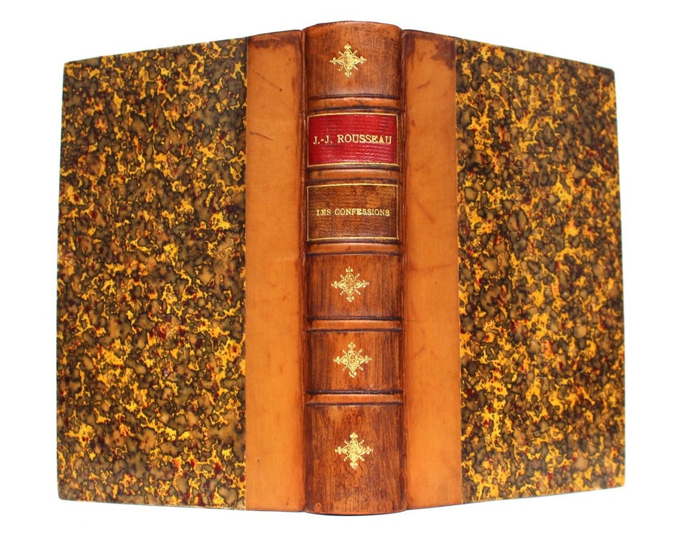 "Jean-Jacques Rousseau: Les Confessions". Paris, Bibliothèque-Charpentier, 1891. 18 x 12 cm., 650 pp. Text in French. Bound in period full leather over marbled boards, raised bands, gilt to spine, marbled endpapers, marbled edges. Age toning to paper, otherwise in very good condition. Jean-Jacques Rousseau (UK: /ˈruːsoʊ/, US: /ruːˈsoʊ/ French: [ʒɑ̃ ʒak ʁuso]; 28 June 1712 - 2 July 1778) was a Genevan philosopher, writer, and composer. His political philosophy influenced the progress of the Enlightenment throughout Europe, as well as aspects of the French Revolution and the development of modern political, economic, and educational thought. His Discourse on Inequality and The Social Contract are cornerstones in modern political and social thought. Rousseau's sentimental novel Julie, or the New Heloise (1761) was important to the development of preromanticism and romanticism in fiction. His Emile, or On Education (1762) is an educational treatise on the place of the individual in society. Rousseau's autobiographical writings-the posthumously published Confessions (composed in 1769), which initiated the modern autobiography, and the unfinished Reveries of the Solitary Walker (composed 1776-1778)-exemplified the late 18th-century "Age of Sensibility", and featured an increased focus on subjectivity and introspection that later characterized modern writing. Rousseau befriended fellow philosopher Denis Diderot in 1742, and would later write about Diderot's romantic troubles in his Confessions. During the period of the French Revolution, Rousseau was the most popular of the philosophers among members of the Jacobin Club. He was interred as a national hero in the Panthéon in Paris, in 1794, 16 years after his death.