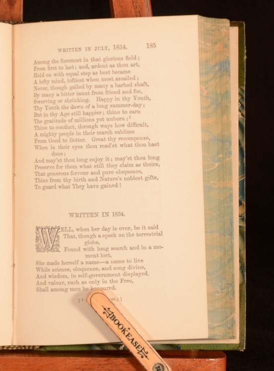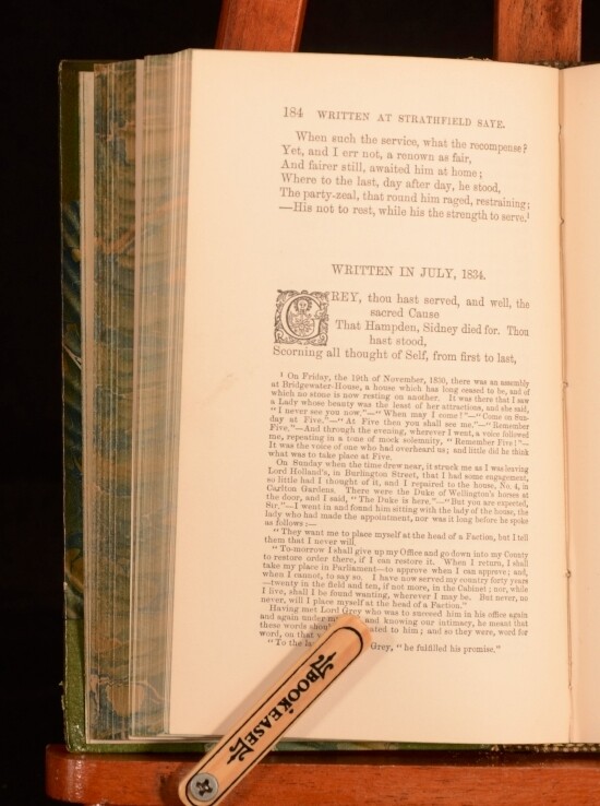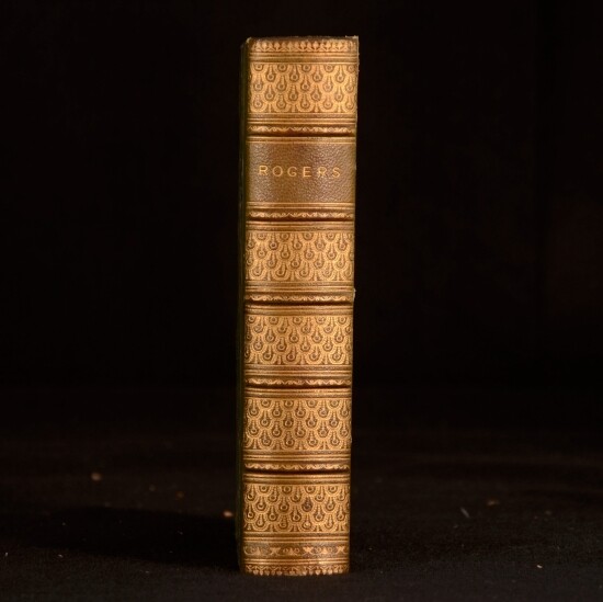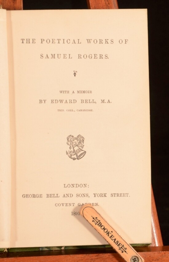 Click here to see our other books! The Poetical Works of Samuel Rogers Samuel Rogers; Edward Bell 1891 George Bell and Sons : London 7" by 4.5" xlvi, 392pp SUMMARY A poetical anthology of Samuel Rogers' work. Fine Binding,Leather Binding,Signed Binding Overall Condition: Near Fine This book weighs 0.75 KG when packed UK Postage: £ 3.99 US Postage: £ 19.99 EU Postage : £ 15.99 European Postage: £ 16.99 Asia Postage: £ 21.99 Worldwide Postage: £ 25.99 DESCRIPTION With a portrait frontispiece. With a memoir of the author by Edward Bell to the preface. In a Mudie binding, with binder's stamp to the verso of front endpaper. Samuel Rogers was a celebrated English poet. Rogers achieved much of his fame during his lifetime although today he is somewhat eclipsed by the popularity of his contemporaries Wordsworth, Coleridge and Byron. CONDITION In a half morocco binding with paper covered boards. Externally, very smart with light rubbing to the head and tail of joints and to the extremities. Binder's stamp to the verso of front endpaper. Front hinge is slightly strained but firm. Internally, firmly bound. Pages are generally bright and clean throughout. Overall Condition: Near Fine GLOSSARY OF TERMS Overall Condition (Dustwrapper condition rating is shown after that for the book itself, where a dustwrapper is present) Fine - Very well preserved copy showing very little wear Very Good Indeed - Only one or two minor faults, really a very attractive copy Very Good - Quite a wide term meaning no major faults but probably several smaller ones often expected given the age of the book, but still a respectable copy Good - Meaning not very good. Some more serious faults as will be described in the condition report under 'condition' Good Only - Meaning one or more faults that could really do with repair Fair - As with good only above but with other faults leaving a compromised copy even after repair Poor - Really bad and possibly seriously incomplete. We only sell books in this condition where their rarity or value makes them attractive none the less. Major defects will be described. GUARANTEE We offer a full money back guarantee on our descriptions. Please ask for details and conditions. We prefer PAYPAL. If you pay via PAYPAL we will post the item off the same or the next working day with the postage you have selected. Please note we cannot accept USD cheques