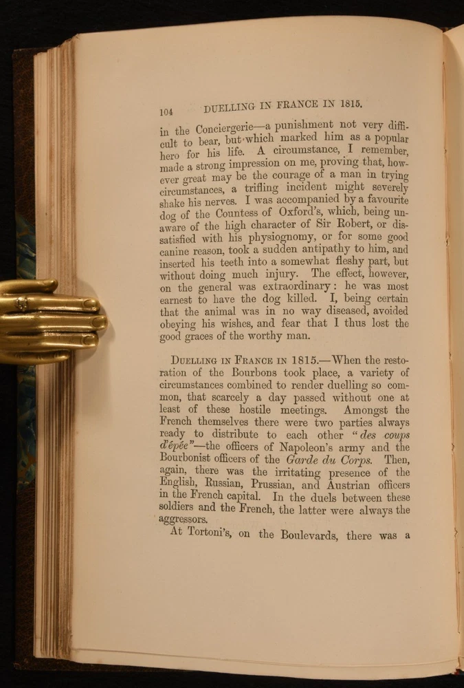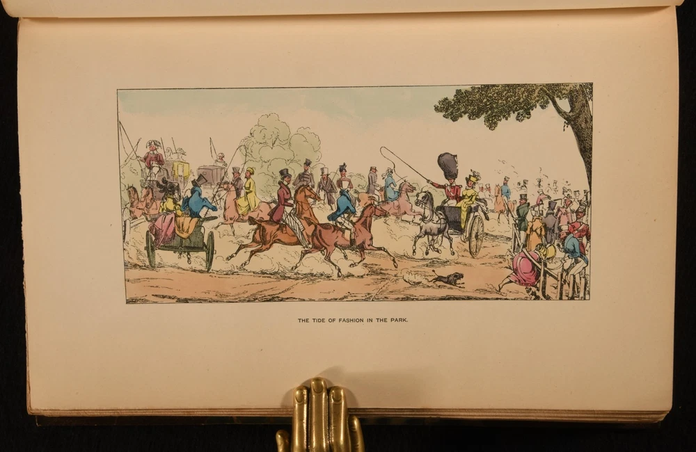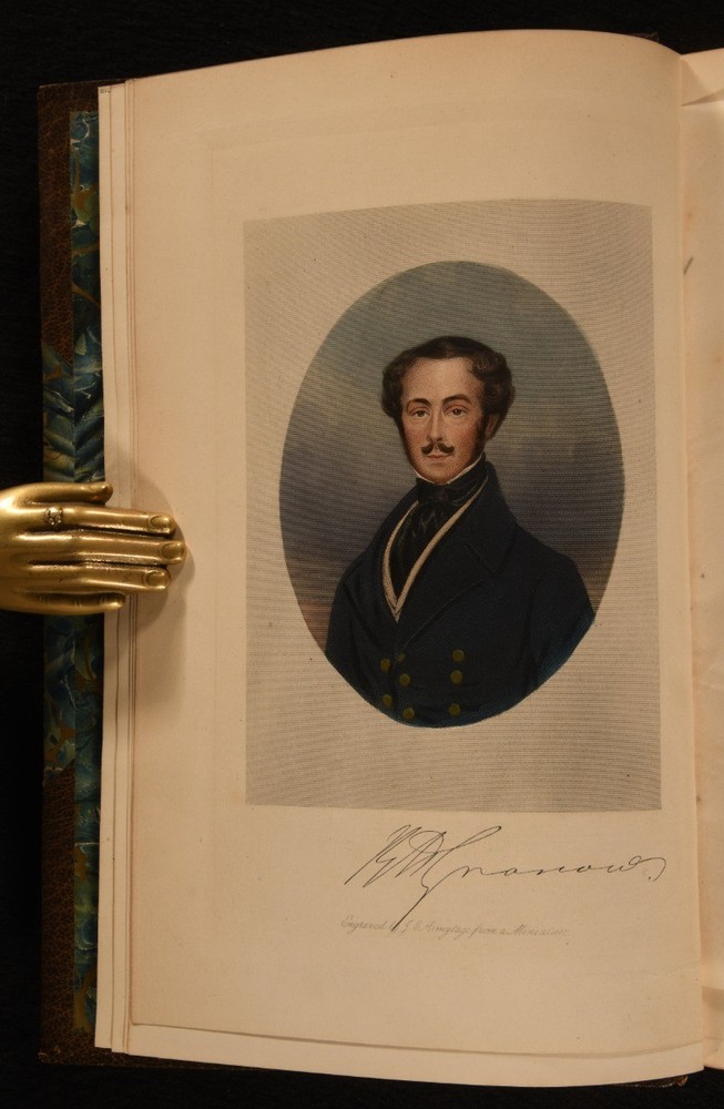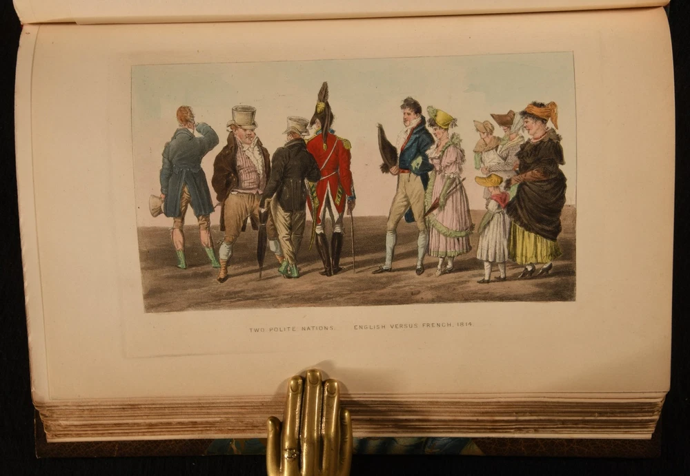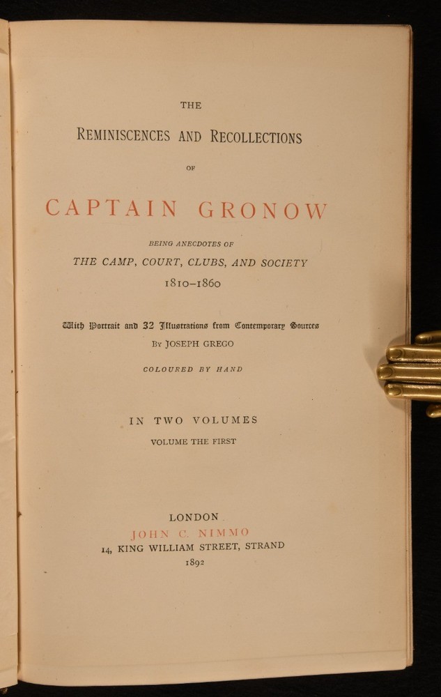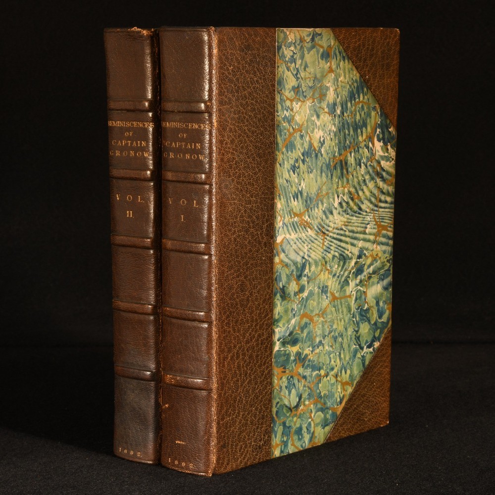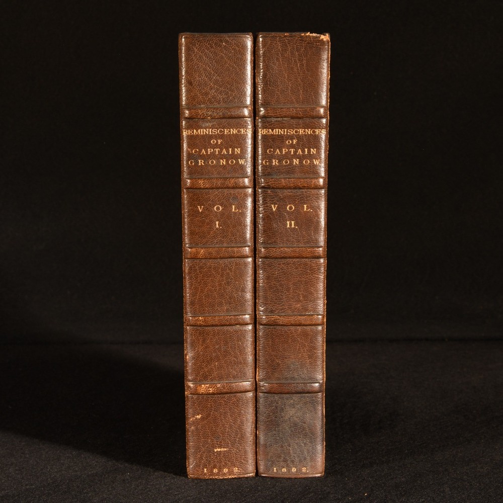 Click here to see our other books! The Reminiscences and Recollections of Captain Gronow Captain Gronow; Rees Howell Gronow 1892 John C. Nimmo : London 9" by 6" xxviii, 353; xiv, 340, [1pp] SUMMARY A Bickers bound set of the memoirs of Captain Gronow, a lovely edition complete with hand-coloured plates. Colour Plates,Illustrated,Leather Binding,Signed Binding Overall Condition: Very Good This book weighs 3 KG when packed UK Postage: £ 3.99 US Postage: £ 36.99 EU Postage : £ 25.99 European Postage: £ 27.99 Asia Postage: £ 47.99 Worldwide Postage: £ 69.99 DESCRIPTION Bound by Bickers. Complete in two volumes. The memoir and reminiscences of Captain Rees Howell Gronow, a Welsh Grenadier Guards officer and dandy. Gronow's memoirs recollect various anecdotes of the camp, court, clubs, and society, from 1810 to 1860. Volume I is illustrated with a hand-coloured frontispiece, and fifteen hand-coloured plates. Collated, complete. Volume II is illustrated with a hand-coloured frontispiece, and sixteen hand-coloured plates. Collated, complete. Bookplate of L. R. Rawlings to the recto of the front free endpapers. CONDITION In a half crushed morocco binding with marbled paper to the boards. Externally, smart. Light rubbing to the joints and extremities. Cracks to the head and tail of the front joint of Volume II. Spots to the fore edges. Bookplate to the recto of the front free endpapers. Internally, firmly bound. Pages are bright and clean. Overall Condition: Very Good GLOSSARY OF TERMS Overall Condition (Dustwrapper condition rating is shown after that for the book itself, where a dustwrapper is present) Fine - Very well preserved copy showing very little wear Very Good Indeed - Only one or two minor faults, really a very attractive copy Very Good - Quite a wide term meaning no major faults but probably several smaller ones often expected given the age of the book, but still a respectable copy Good - Meaning not very good. Some more serious faults as will be described in the condition report under 'condition' Good Only - Meaning one or more faults that could really do with repair Fair - As with good only above but with other faults leaving a compromised copy even after repair Poor - Really bad and possibly seriously incomplete. We only sell books in this condition where their rarity or value makes them attractive none the less. Major defects will be described. GUARANTEE We offer a full money back guarantee on our descriptions. Please ask for details and conditions. We prefer PAYPAL. If you pay via PAYPAL we will post the item off the same or the next working day with the postage you have selected. Please note we cannot accept USD cheques