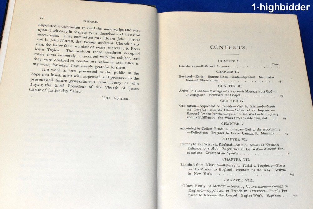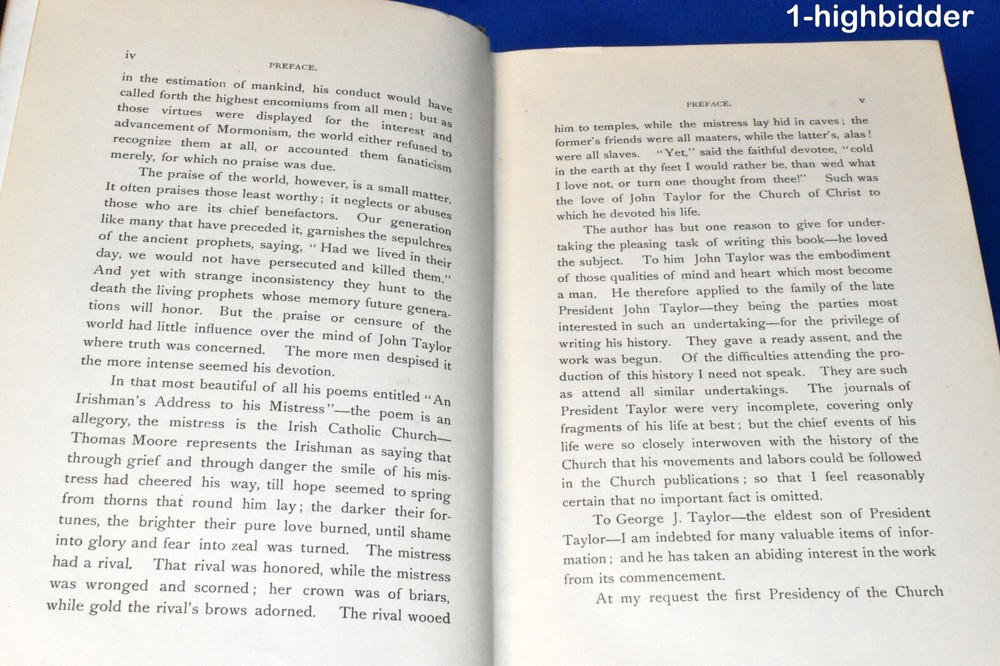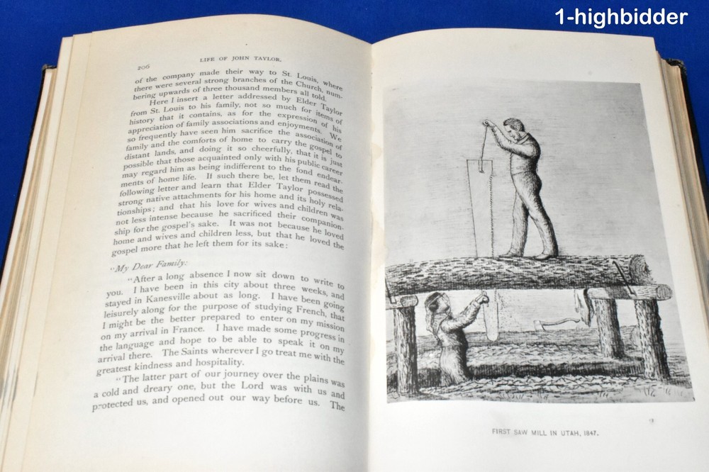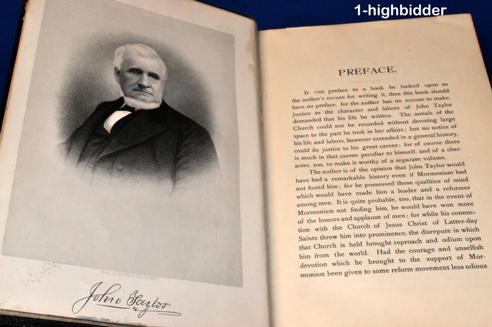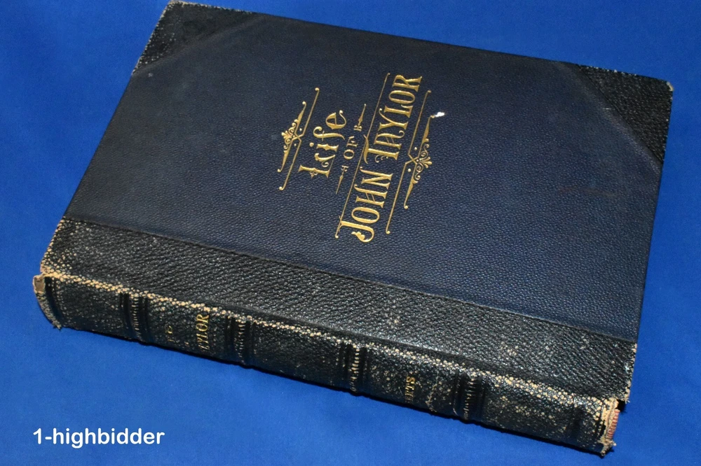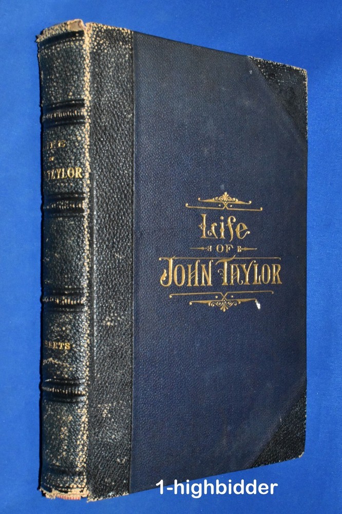 1892 Life of John Taylor 1st Ed 3/4 Leather Roberts 3rd President of the Church ____________________________________________ Life of John Taylor: Third President of the Church of Jesus Christ of Latter-day Saints by Brigham Henry Roberts Published by George Q. Cannon & Sons Co., Publishers, Salt Lake City, UT (1892) This is a rare first edition Biography of the third LDS President by Mormon intellectual and historian, B.H. Roberts. (Flake/Draper 7331). It's not perfect - please read details below. Condition: Excellent 1st Edition Hardcover Book bound in 3/4 pebbled brown leather! The binding is tight and all 468 pages within are bright white with NO writing, underlining, high-lighting, rips, tears, bends, or folds with the exception of one missing page: the title page. There is a very slight crack in the text block where this page used to be - apparently it has long since fallen out. All other pages are tightly bound in. The book contains eleven plates, including the double page Joseph and Hyrum - all of which are present and in great shape. The covers have wear, as can be seen in my photos - I have taken pictures of all sides. The bottom outter page edges have a gray stain (shown) Not sure what this is from since there is NO water or moisture damage. You will be happy with this one! It's not perfect, but priced according to condition. Always handled carefully and packaged securely! Buy with confidence from a seller who takes the time to show you the details and not use just stock photos. Please check out all my pictures and email with any questions! Thanks for looking! About the Book: If the preface to a book be looked upon as the author's excuse for writing it, then this book should have no preface, for the author has no excuse to make. Justice to the character and labors of John Taylor demanded that his life be written. The annals of the Church could not be recorded without devoting large space to the part he took in her affairs; but no notice of his life and labors, however extended in a general history, could do justice to his great career: for of course there is much in that career peculiar to himself, and of a character, too, to make it worthy of a separate volume. The author is of the opinion that John Taylor would have had a remarkable history even if Mormonism had not found him; for he possessed those qualities of mind which would have made him a leader and a reformer among men. It is quite probable, too, that in the event of Mormonism not finding him, he would have won more of the honors and applause of men; for while his connection with the Church of Jesus Christ of Latter-day Saints threw him into prominence, the disrepute in which that Church is held brought reproach and odium upon him from the world. Had the courage and unselfish devotion which he brought to the support of Mormonism been given to some reform movement less odious in the estimation of mankind, his conduct would have called forth the highest encomiums from all men; but as those virtues were displayed for the interest and advancement of Mormonism, the world either refused to recognize them at all, or accounted them fanaticism merely, for which no praise was due. The praise of the world, however, is a small matter. It often praises those least worthy; it neglects or abuses those who are its chief benefactors. Our generation like many that have preceded it, garnishes the sepulchers of the ancient prophets, saying, "Had we lived in their day, we would not have persecuted and killed them." And yet with strange inconsistency they hunt to the death the living prophets whose memory future generations will honor. But the praise or censure of the world had little influence over the mind of John Taylor where truth was concerned. The more men despised it the more intense seemed his devotion. In that most beautiful of all his poems entitled "An Irishman's Address to his Mistress"-the poem is an allegory, the mistress is the Irish Catholic Church-Thomas Moore represents the Irishman as saying that through grief and through danger the smile of his mistress had cheered his way, till hope seemed to spring from thorns that round him lay; the darker their fortunes, the brighter their pure love burned, until shame into glory and fear into zeal was turned. The mistress had a rival. That rival was honored, while the mistress was wronged and scorned; her crown was of briars, while gold the rival's brows adorned. The rival wooed him to temples, while the mistress lay hid in caves; the former's friends were all masters, while the latter's, alas! were all slaves. "Yet," said the faithful devotee, "cold in the earth at thy feet I would rather be, than wed what I love not, or turn one thought from thee!" Such was the love of John Taylor for the Church of Christ to which he devoted his life. About John Taylor: John Taylor (1 November 1808 – 25 July 1887) was an English-born religious leader who served as the third president of The Church of Jesus Christ of Latter-day Saints (LDS Church) from 1880 to 1887. He is the first and so far only president of the LDS Church to have been born outside the United States. Following Brigham Young's death in 1877, the Quorum of the Twelve Apostles governed the church, with John Taylor as the quorum's president. Taylor became the third president of the church in 1880. He chose as his counselors Joseph F. Smith and George Q. Cannon, the latter being the nephew of his wife, Leonora. As church president, Taylor oversaw the expansion of the Salt Lake community; the further organization of the church hierarchy; the establishment of Mormon colonies in Wyoming, Colorado, and Arizona as well as in Canada's Northwest Territories (now in Alberta) and the Mexican state of Chihuahua; and the defense of plural marriage against increasing government opposition. While he was church president, Taylor also established Zion's Central Board of Trade to coordinate local trade and production, which was done largely through