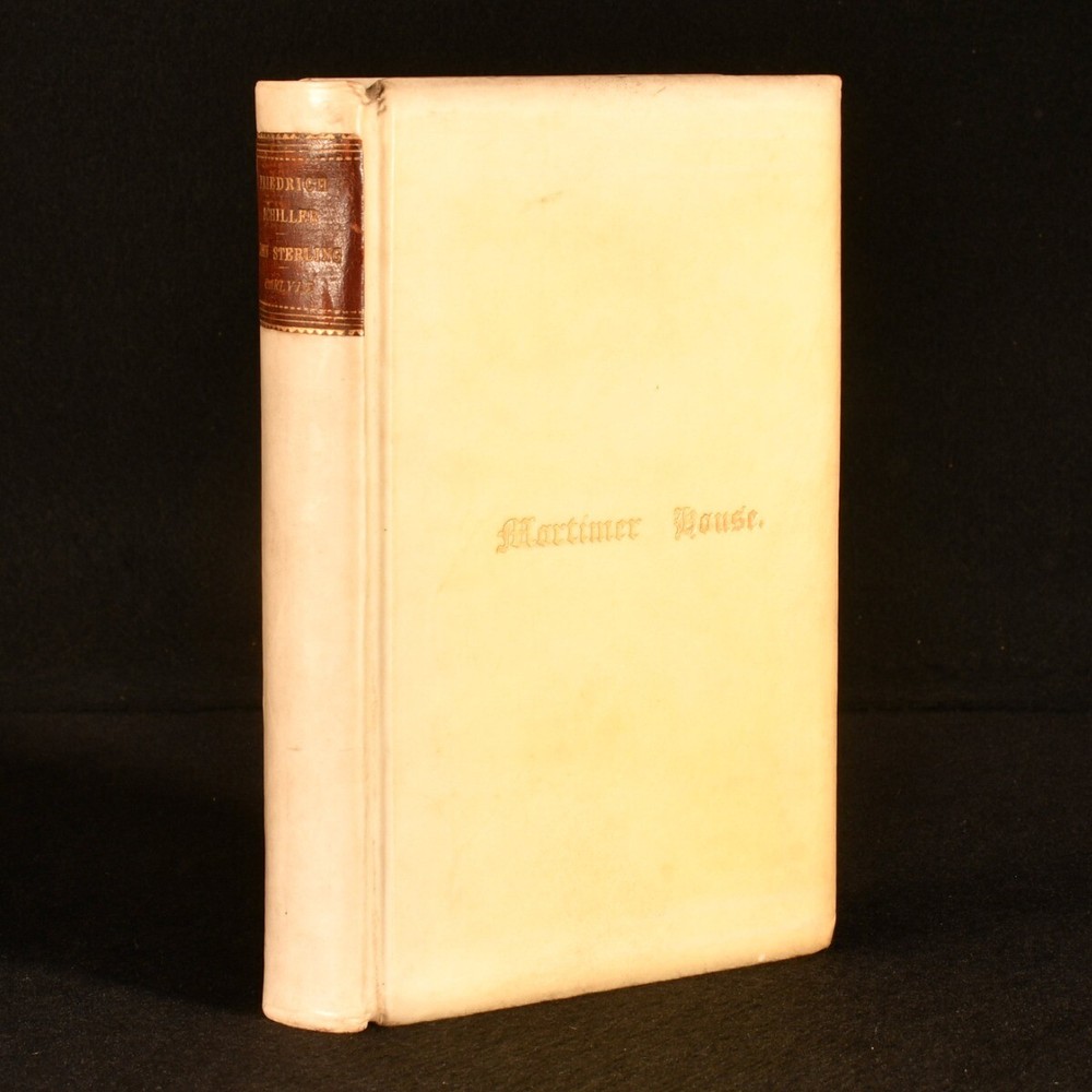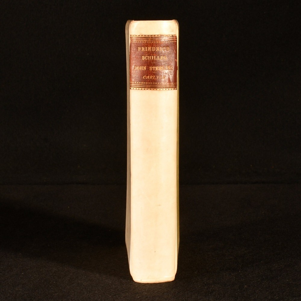 Click here to see our other books! Life of Friedrich Schiller (1825) Life of John Sterling (1851) Two Biographies Thomas Carlyle 1893 Chapman & Hall Ltd : London 7.5" by 4.5" 405pp. SUMMARY Two biographies on John Sterling and Frederick Schiller, written by Thomas Carlyle and bound by Baker & Son in full vellum. Illustrated,Leather Binding,Original Binding,Signed Binding Overall Condition: Very Good Indeed This book weighs 0.75 KG when packed UK Postage: £ 3.99 US Postage: £ 19.99 EU Postage : £ 15.99 European Postage: £ 16.99 Asia Postage: £ 21.99 Worldwide Postage: £ 25.99 DESCRIPTION Two biographies in one volume. Later editions of both biographies. Bound in full vellum by Baker & Son with their binder's stamp to the front pastedown. School binding for Mortimer House. Illustrated with a monochrome frontispiece and two monochrome plates. This work features two biographies written by Thomas Carlyle, a Scottish historian, philosopher and a leading writer from the Victorian era. The two biographies describe the lives of Friedrich Schiller, a German poet, historian and lawyer, and John Sterling, a British author. CONDITION Bound in full vellum. Externally very smart with slight fading to the spine, marks to the boards and slight bumping and wear to the extremities of the boards. Binder's stamp to the front pastedown. Internally firmly bound with bright and generally clean pages with light spotting to the front and rear. Prize ink inscription to the front blank dated 1899. Overall Condition: Very Good Indeed GLOSSARY OF TERMS Overall Condition (Dustwrapper condition rating is shown after that for the book itself, where a dustwrapper is present) Fine - Very well preserved copy showing very little wear Very Good Indeed - Only one or two minor faults, really a very attractive copy Very Good - Quite a wide term meaning no major faults but probably several smaller ones often expected given the age of the book, but still a respectable copy Good - Meaning not very good. Some more serious faults as will be described in the condition report under 'condition' Good Only - Meaning one or more faults that could really do with repair Fair - As with good only above but with other faults leaving a compromised copy even after repair Poor - Really bad and possibly seriously incomplete. We only sell books in this condition where their rarity or value makes them attractive none the less. Major defects will be described. GUARANTEE We offer a full money back guarantee on our descriptions. Please ask for details and conditions. We prefer PAYPAL. If you pay via PAYPAL we will post the item off the same or the next working day with the postage you have selected. Please note we cannot accept USD cheques