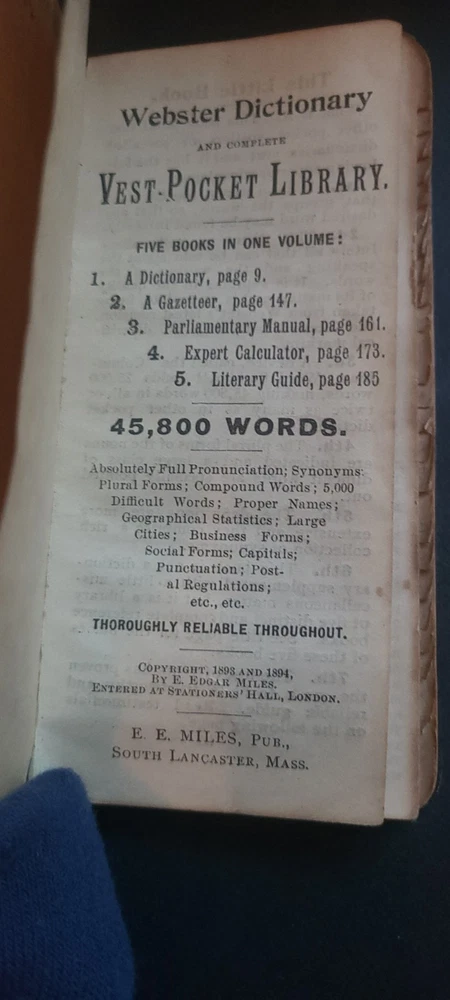 1894 The New Webster Dictionary and Complete Vest Pocket Library 45,800 Words This is a pre-owned antique book which has been used. As such, expect some wear and tear, but for it's age, the condition is beautifully antiqued.
