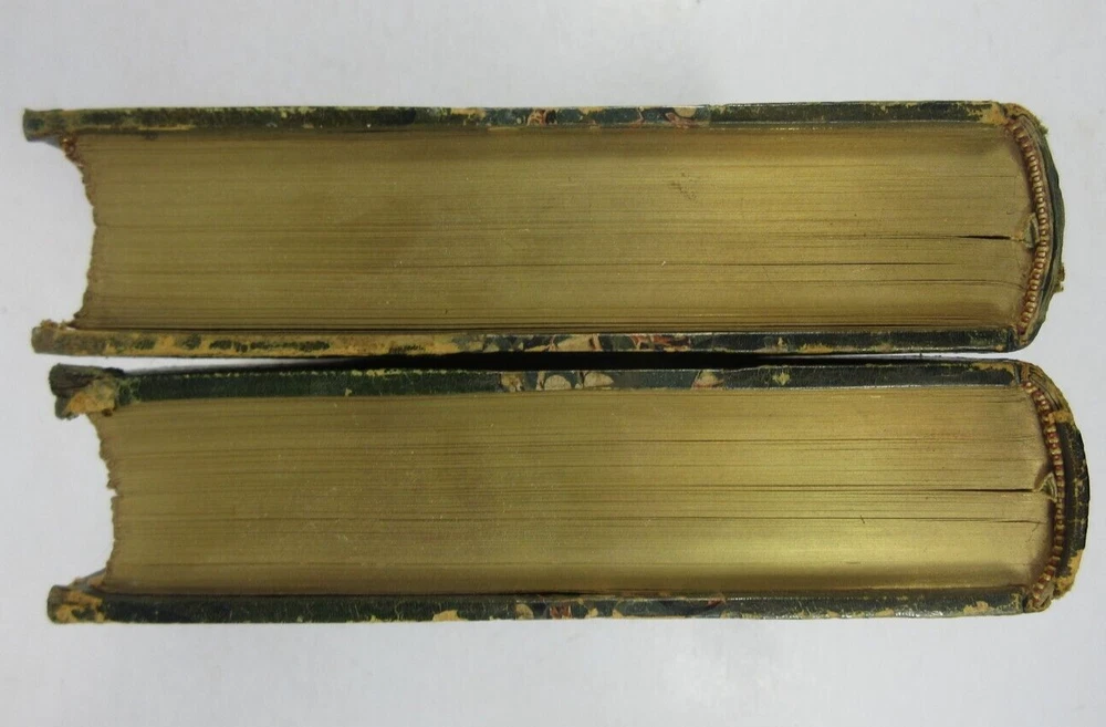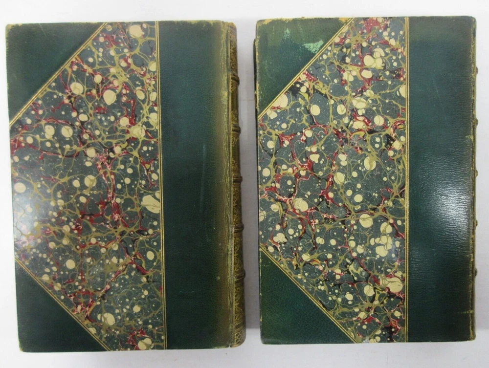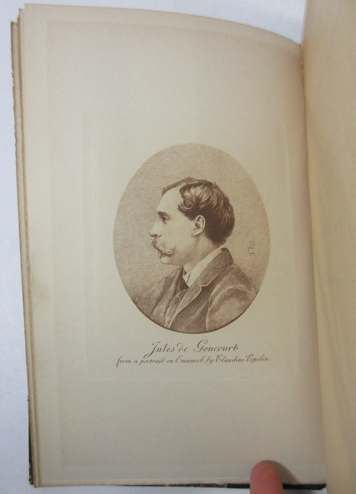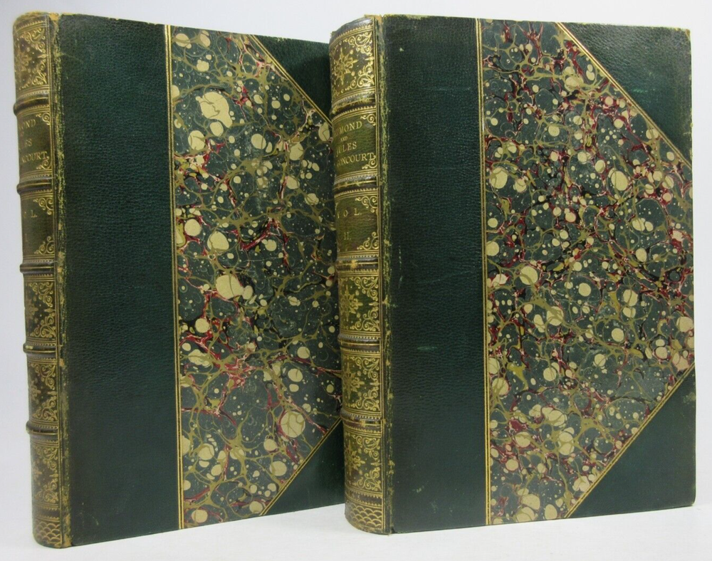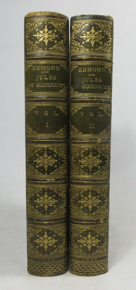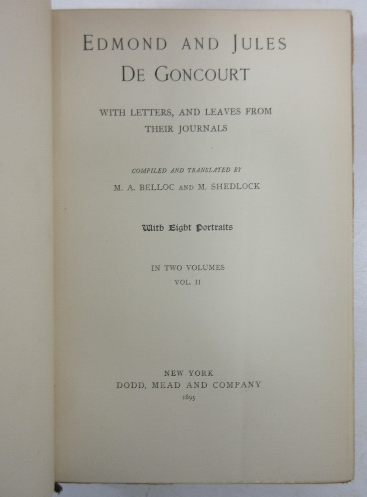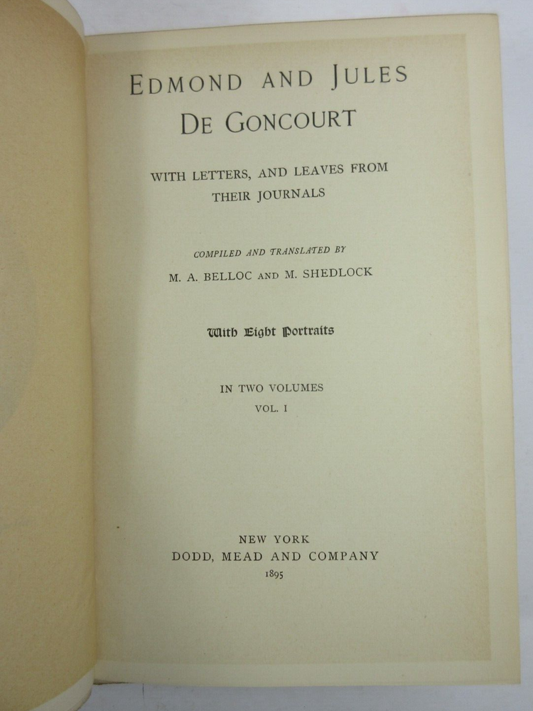 For sale is a very good condition, complete 2-Vol set 3/4 leather-bound hardcover titled Edmond and Jules De Goncourt with Letters, and Leaves from their Journals, compiled and translated by M.A. Belloc and M. Shedlock, in two volumes, each volume has 8 portrait illustrations. Published 1895 by Dodd, Mead & Company, US. Both volumes are bound in 3/4 leather with marbled boards, gilded decoration and spines with gold lettering. Both Volume 1 & 2 have sound binding and generally unmarked pages, with the exception of very minor age toning/spotting. Both boards are clean, but have minor bumping/scuffing to the corners, as well as light chipping around the edges & edges of the spine. Both volumes have marble endpapers and gilded edges. Please see photos for condition detail. shelf reference #L-2475