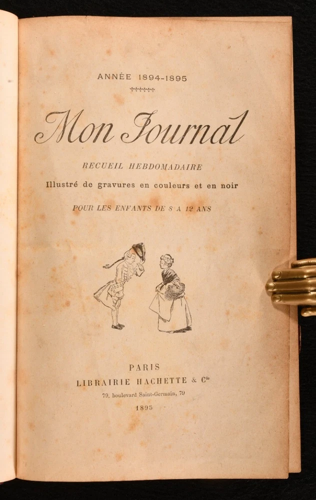 Click here to see our other books! mon Journal Recueil Hebomadaire Illustre de Gravures en Couleur et en Noir pour les Enfants de 8 a 12 Ans Various 1895-6 Librairie Hachette : Paris 10" by 6.5" [4], 608pp. SUMMARY A collection of the issues from October 1895 to June 1896 of this French weekly juvenile magazine, with illustrations both in colour and in black and white. Colour Plates,First Edition,Illustrated,Leather Binding,Pleasing Copy,Rebound Overall Condition: Very Good This book weighs 1.5 KG when packed UK Postage: £ 3.99 US Postage: £ 23.99 EU Postage : £ 18.99 European Postage: £ 19.99 Asia Postage: £ 31.99 Worldwide Postage: £ 32.99 DESCRIPTION A collection of thirty-eight issues from this weekly illustrated magazine for children bound in one. Containing a series of short stories, poetry and music by a variety of authors such as H. and C. Guy, Gonzague Privat, and Eugene Le Mouel among others. Each issue presents a full page colour title page and other illustrations in text both in colour and in black and white. Comprising all consecutive issues from 5 Octobre 1895 No. 1 to 20 June 1896 No. 38. Pagination is continuous. Bound in a lovely half morocco binding. Title page for the 1894-5 volume, with half title included. CONDITION In a half morocco binding over marbled boards and edges, gilt tooling to the spine. Externally very smart with only minor shelf wear, minor rubbing to the spine and boards. The front hinge is only lightly strained, holding firm. The volume firmly bound. Some spotting scattered to the leaves, which are also lightly age toned, as usual due to the type of paper used. Illustrated in text with both black and white and coloured illustrations. Overall Condition: Very Good GLOSSARY OF TERMS Overall Condition (Dustwrapper condition rating is shown after that for the book itself, where a dustwrapper is present) Fine - Very well preserved copy showing very little wear Very Good Indeed - Only one or two minor faults, really a very attractive copy Very Good - Quite a wide term meaning no major faults but probably several smaller ones often expected given the age of the book, but still a respectable copy Good - Meaning not very good. Some more serious faults as will be described in the condition report under 'condition' Good Only - Meaning one or more faults that could really do with repair Fair - As with good only above but with other faults leaving a compromised copy even after repair Poor - Really bad and possibly seriously incomplete. We only sell books in this condition where their rarity or value makes them attractive none the less. Major defects will be described. GUARANTEE We offer a full money back guarantee on our descriptions. Please ask for details and conditions. We prefer PAYPAL. If you pay via PAYPAL we will post the item off the same or the next working day with the postage you have selected. Please note we cannot accept USD cheques