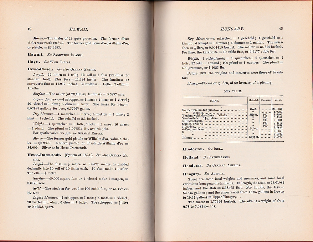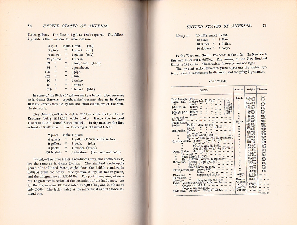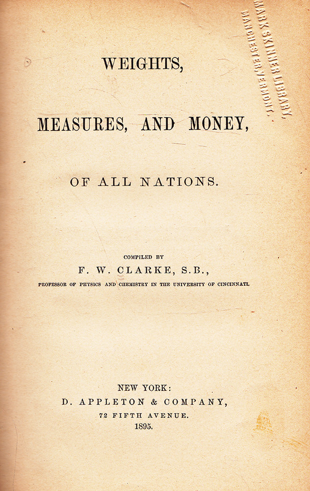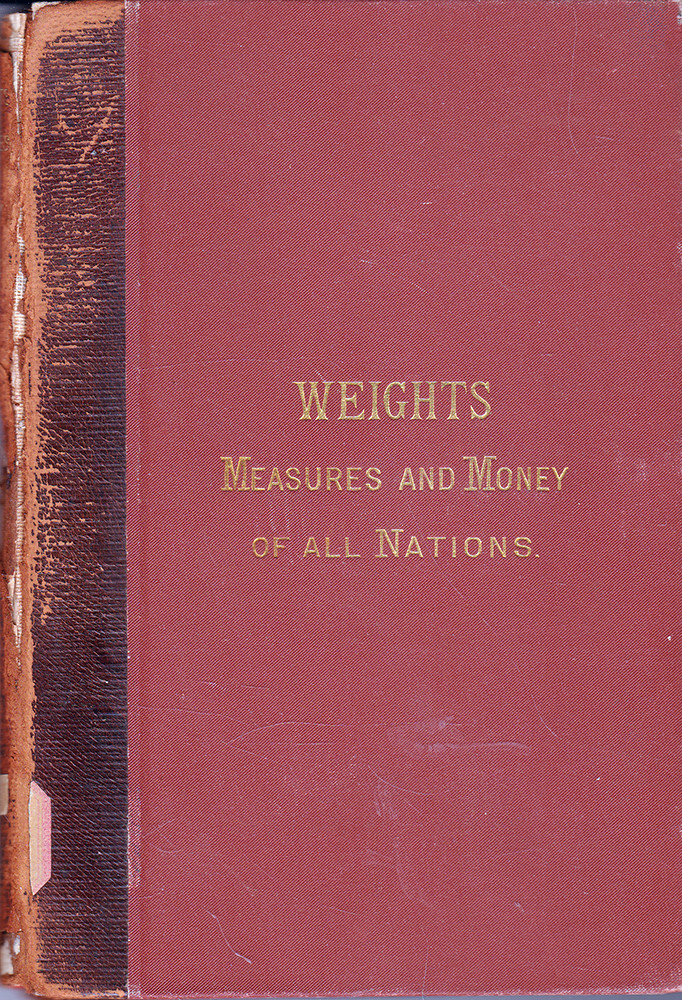 WEIGHTS, MEASURES AND MONEY OF ALL NATIONS Compiled by F. W. Clarke, S.B. PROFESSOR OF PHYSICS AND CHEMISTRY IN THE UNIVERSITY OF CINCINNATI 1895 D. Appleton & Company New York Hardcover with Leather Spine 117 pp plus 10 pp publisher's catalog First published in 1875. A still-useful useful reference for researching and comparing money, weights and measures throughout all known countries of the world at the time. Importers and exporters must have doted on this book. The leather spine has chipping and wear and there are some stain spots on the rear board but the binding is still good and the interior is very good. 5" x 7 1/2" x 1/2"