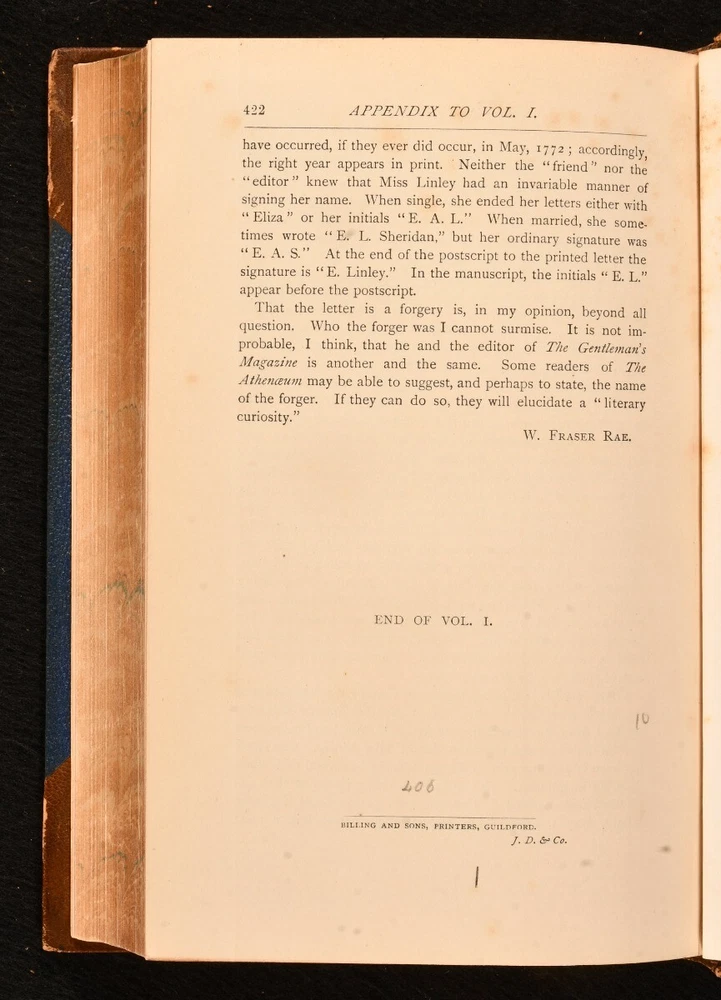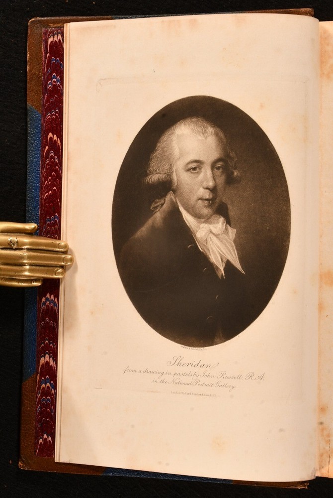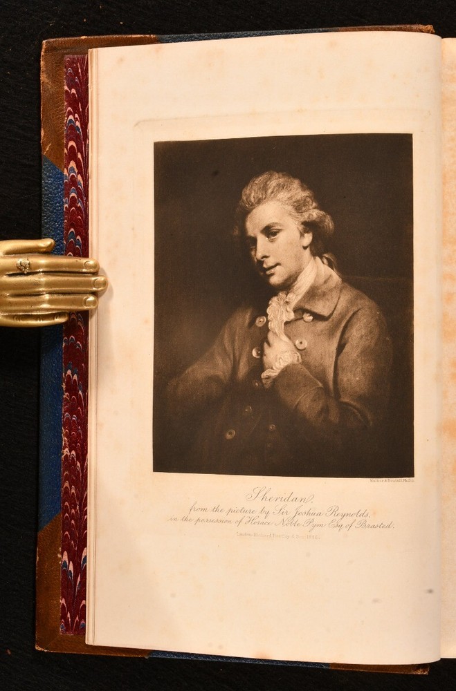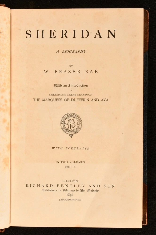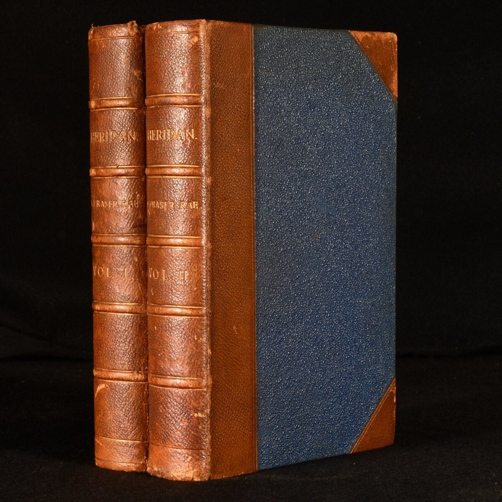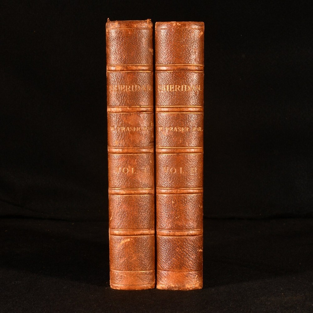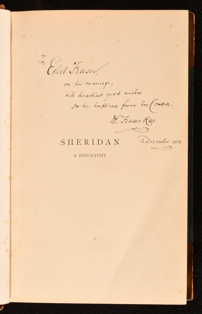 Click here to see our other books! Sheridan: a Biography W Fraser Rae 1896 Richard Bentley and Son : London 8.5" by 5.5" xxii, [4], 422; vii, 451pp. SUMMARY A signed presentation copy of W Fraser Rae's biography of Richard Brinsley Sheridan in two uniform volumes in Eyre & Spottiswoode binding. Author's Presentation Copy,Illustrated,Leather Binding,Rebound,Signed,Signed Binding Overall Condition: Very Good This book weighs 1.5 KG when packed UK Postage: £ 3.99 US Postage: £ 23.99 EU Postage : £ 18.99 European Postage: £ 19.99 Asia Postage: £ 31.99 Worldwide Postage: £ 32.99 DESCRIPTION The first edition of this work. Complete in two volumes. Inscribed by the author to half title vol. I 'To Ethel Fraser, on her marriage, with heartiest good wishes for her happiness from her Cousin, W Fraser Rae,' dated December 1902. Illustrated with frontispiece and eight further plates to volume I; and frontispiece and twelve plates to vol. II. Collated, complete. In Eyre & Spottiswoode signed half morocco bindings. With half titles. Complete biography of Richard Brinsley Butler Sheridan Irish satirist, politician, playwright, poet, known as long-term owner of the London Theatre Royal, Drury Lane. Some of his most popular plays include 'The Rivals' and 'The School for Scandal.' William Fraser Rae was a Scottish journalist and author. CONDITION In uniform half morocco bindings over cloth covered boards, five raised bands, gilt titles to spine, marbled edges and endpapers. Externally very smart with shelf wear, rubbed to back strip and extremities of boards. Ex libris stamp to front blank leaf. Internally, firmly bound. Light spotting to odd leaf, particularly tissue guard to frontispiece vol. I; pages otherwise generally bright and clean. Overall Condition: Very Good GLOSSARY OF TERMS Overall Condition (Dustwrapper condition rating is shown after that for the book itself, where a dustwrapper is present) Fine - Very well preserved copy showing very little wear Very Good Indeed - Only one or two minor faults, really a very attractive copy Very Good - Quite a wide term meaning no major faults but probably several smaller ones often expected given the age of the book, but still a respectable copy Good - Meaning not very good. Some more serious faults as will be described in the condition report under 'condition' Good Only - Meaning one or more faults that could really do with repair Fair - As with good only above but with other faults leaving a compromised copy even after repair Poor - Really bad and possibly seriously incomplete. We only sell books in this condition where their rarity or value makes them attractive none the less. Major defects will be described. GUARANTEE We offer a full money back guarantee on our descriptions. Please ask for details and conditions. We prefer PAYPAL. If you pay via PAYPAL we will post the item off the same or the next working day with the postage you have selected. Please note we cannot accept USD cheques