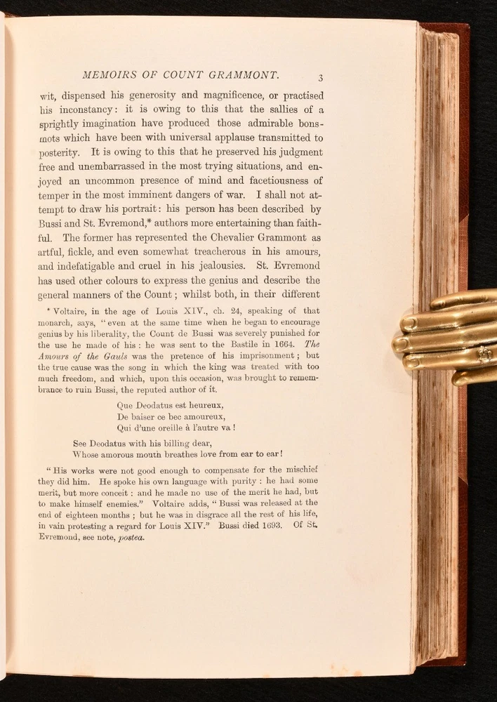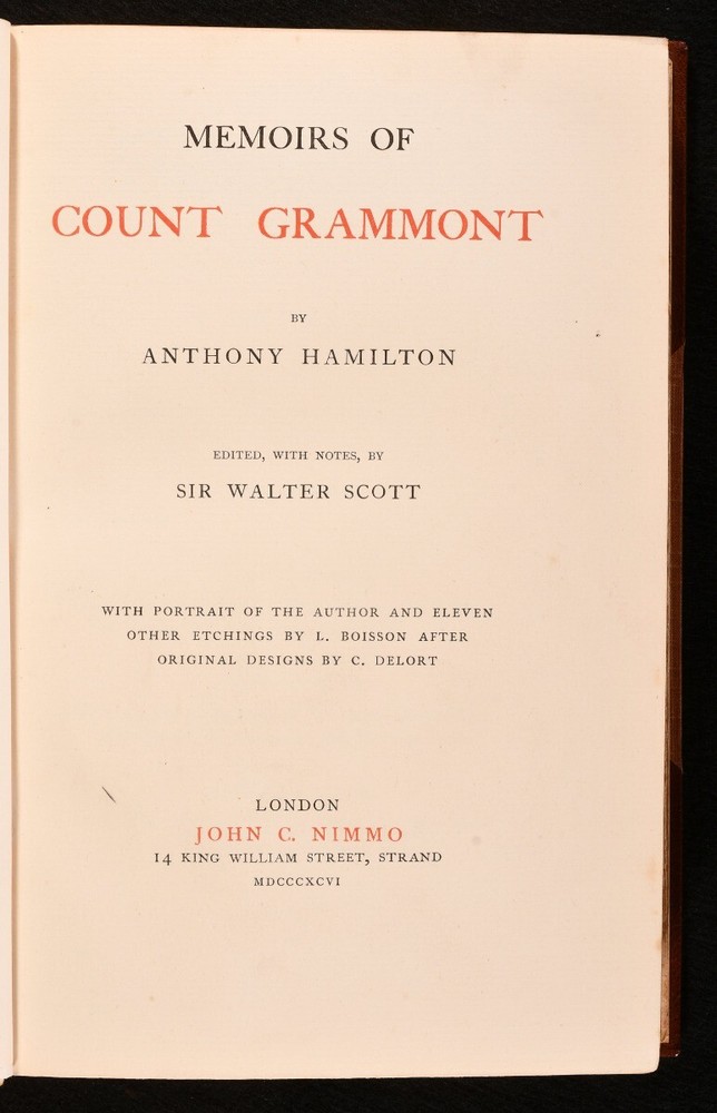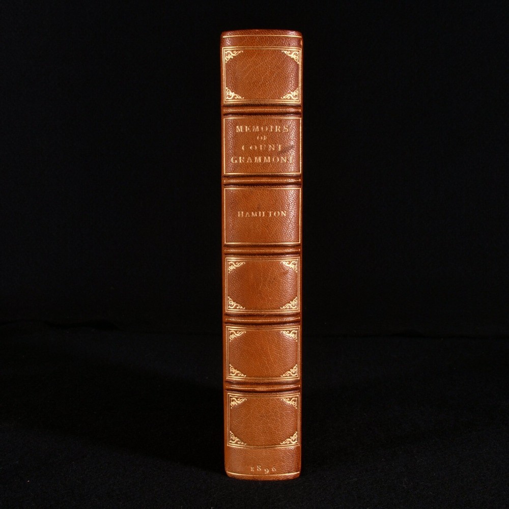 Click here to see our other books! Memoirs of Count Grammont Anthony Hamilton; Sir Walter Scott 1896 John C. Nimmo : London 9" by 6" [5], iv-xxxvi, [2], 396pp SUMMARY Anthony Hamilton's important memoir of the life of Count Grammont, a striking copy in a Zaehnsdorf binding from the library of Audrey Pleydell-Bouverie. Fine Binding,Illustrated,Leather Binding,Signed Binding Overall Condition: Near Fine This book weighs 1.5 KG when packed UK Postage: £ 3.99 US Postage: £ 23.99 EU Postage : £ 18.99 European Postage: £ 19.99 Asia Postage: £ 31.99 Worldwide Postage: £ 32.99 DESCRIPTION In a Zaehnsdorf binding. The memoir of the life of Philibert de Gramont, a French nobleman. Edited with notes by Walter Scott. In 1662, Gramont was exiled from France for paying attentions to one of the Louis XIV's mistresses. He escape to the new court of Louis' cousin, Charles II, where he found an environment of pleasure, gallantry, and intrigue. A fascinating memoir showing first-hand insight into the courts of two of the most well regarded 'fun' kings of history. Illustrated with a frontispiece, and eleven plates. Collated, complete. Written by Antoine Hamilton, a soldier and author who fled to France during the Interregnum. Hamilton was the brother-in-law of Gramont. Edited with notes by Sir Walter Scott. From the library of Audrey Pleydell-Bouverie, from her library at Julians Park, Hertfordshire. After being widowed at 25, Audrey married the fabulously wealthy American department store heir, Marshall Field III, later divorcing him and marrying the Honorable Peter Pleydell-Bouverie. In 1940 she bought Julians Park and redesigned the interior. Her library was impressive, with many examples of her own bookbinding. Audrey was an extravagant socialite and renowned beauty, the illegitimate granddaughter of King Edward VII (though she was also rumoured to be his daughter, or the lover of King Edward VIII), featured in the 'Book of Beauty' by Cecil Beaton. She had many high profile friends, such as Winston Churchill, Coco Chanel, Fred Astaire, and Nancy Mitford, a sparkling hostess of the Edwardian period, her hedonistic antics bringing her into the Bright Young Things. Audrey's bookplate to the recto to the front free endpaper, and upside down to the rear paste down. CONDITION In a half morocco Zaehnsdorf binding with cloth to the boards. Externally, fine. Spine is a little faded. Light spots to the fore edge. Bookplate to the recto to the front free endpaper, and to the rear paste down. Internally, firmly bound. Pages are bright and clean. Frontispiece is detaching a little to the tail. Overall Condition: Near Fine GLOSSARY OF TERMS Overall Condition (Dustwrapper condition rating is shown after that for the book itself, where a dustwrapper is present) Fine - Very well preserved copy showing very little wear Very Good Indeed - Only one or two minor faults, really a very attractive copy Very Good - Quite a wide term meaning no major faults but probably several smaller ones often expected given the age of the book, but still a respectable copy Good - Meaning not very good. Some more serious faults as will be described in the condition report under 'condition' Good Only - Meaning one or more faults that could really do with repair Fair - As with good only above but with other faults leaving a compromised copy even after repair Poor - Really bad and possibly seriously incomplete. We only sell books in this condition where their rarity or value makes them attractive none the less. Major defects will be described. GUARANTEE We offer a full money back guarantee on our descriptions. Please ask for details and conditions. We prefer PAYPAL. If you pay via PAYPAL we will post the item off the same or the next working day with the postage you have selected. Please note we cannot accept USD cheques