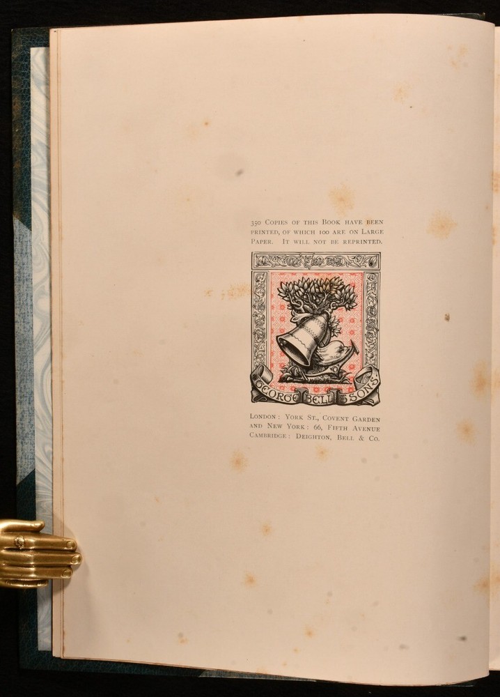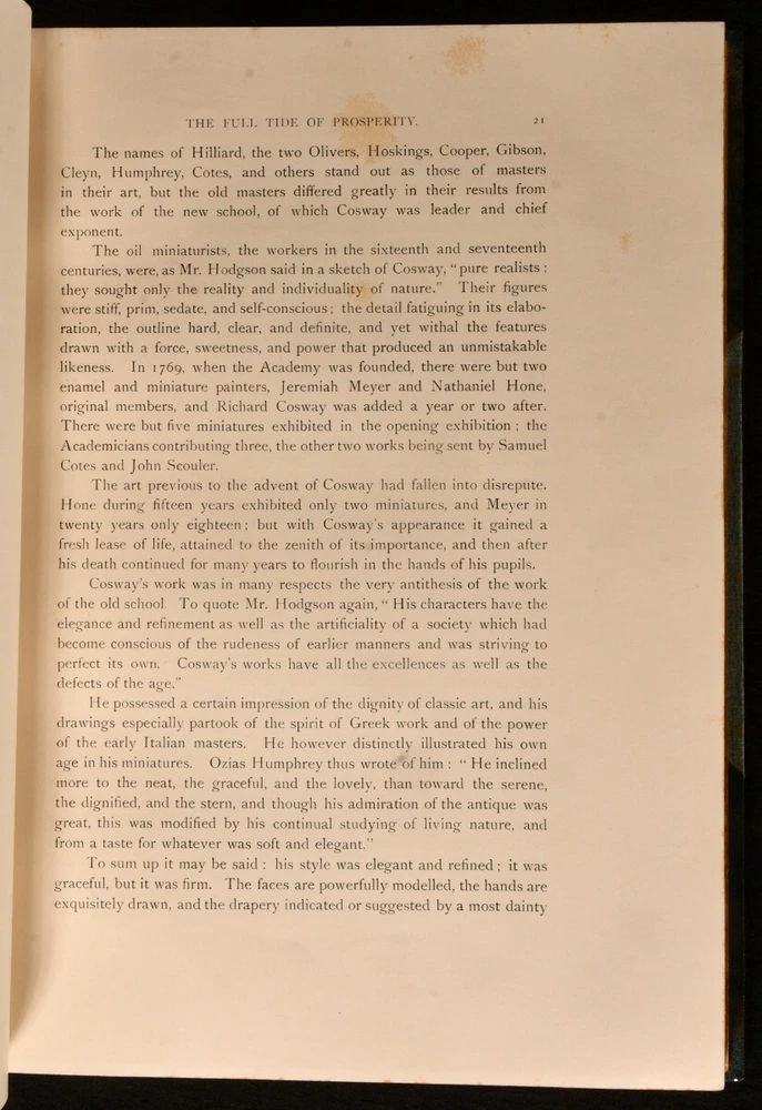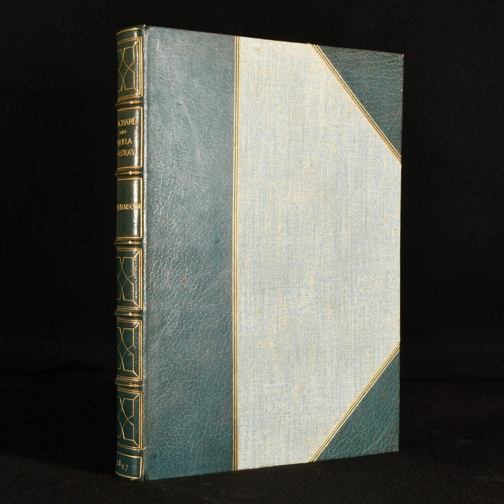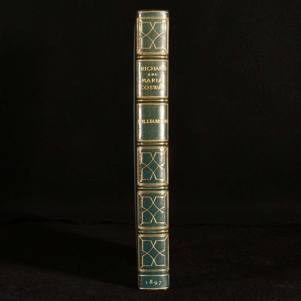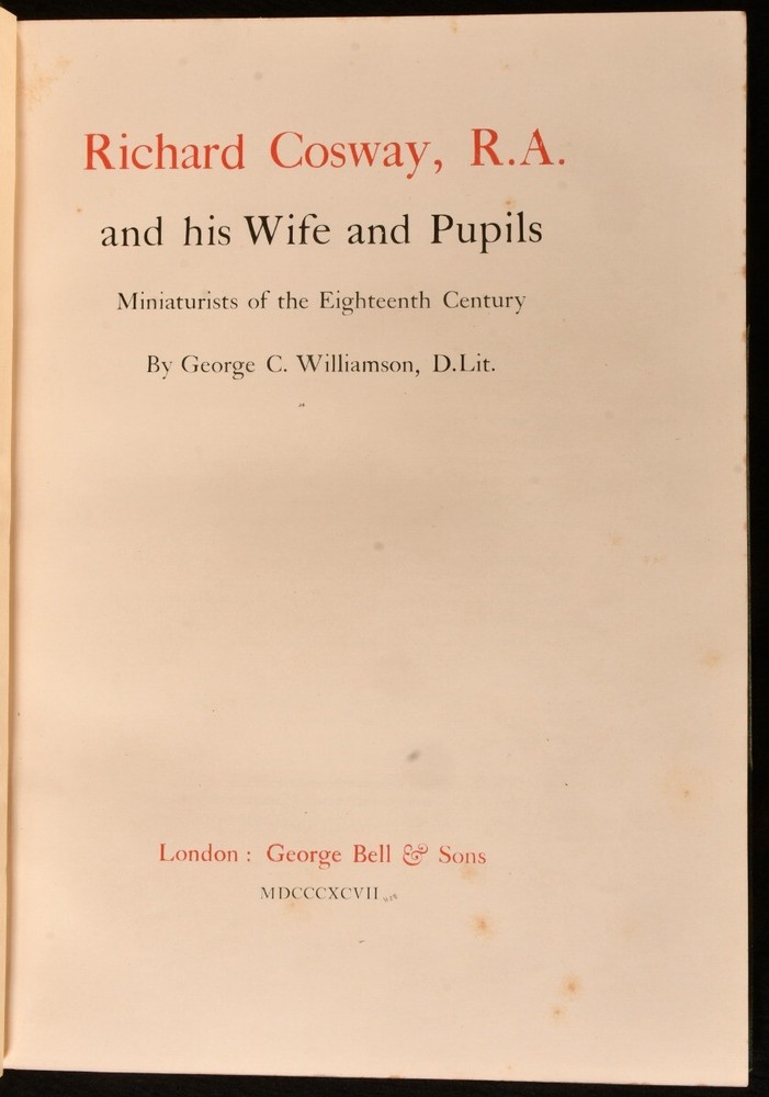 Click here to see our other books! Richard Cosway R. A. and His Wife and Pupils, Miniaturists of the Eighteenth Century George C. Williamson 1897 George Bell & Sons : London 11.5" by 8.5" xii, [2], 170pp SUMMARY A lovely limited edition of this biography and study of Richard Cosway and eighteenth century miniaturists in Hatchards signed leather binding. First Edition,Illustrated,Leather Binding,Limited Edition,Signed Binding,Uncommon Overall Condition: Very Good Indeed This book weighs 2 KG when packed UK Postage: £ 3.99 US Postage: £ 29.99 EU Postage : £ 21.99 European Postage: £ 23.99 Asia Postage: £ 37.99 Worldwide Postage: £ 38.99 DESCRIPTION Limited edition of Richard Cosway R. A. and His Wife and Pupils, Miniaturists of the Eighteenth Century by George C. Williamson in Hatchards signed half calf binding. The first limited edition of 350 copies printed, of which 100 are on large paper. It has not been reprinted. Densely illustrated with fifty three monochrome plates and a frontispiece and with many in text illustrations. Collated, complete. Richard Cosway was a well established portrait painter of the Regency era best known for his miniatures. CONDITION In Hatchards signed half calf binding and cloth binding. Externally, very smart. There is some slight rubbing to the extremities. Internally, firmly bound. The pages are bright and clean with some spotting throughout. Overall Condition: Very Good Indeed GLOSSARY OF TERMS Overall Condition (Dustwrapper condition rating is shown after that for the book itself, where a dustwrapper is present) Fine - Very well preserved copy showing very little wear Very Good Indeed - Only one or two minor faults, really a very attractive copy Very Good - Quite a wide term meaning no major faults but probably several smaller ones often expected given the age of the book, but still a respectable copy Good - Meaning not very good. Some more serious faults as will be described in the condition report under 'condition' Good Only - Meaning one or more faults that could really do with repair Fair - As with good only above but with other faults leaving a compromised copy even after repair Poor - Really bad and possibly seriously incomplete. We only sell books in this condition where their rarity or value makes them attractive none the less. Major defects will be described. GUARANTEE We offer a full money back guarantee on our descriptions. Please ask for details and conditions. We prefer PAYPAL. If you pay via PAYPAL we will post the item off the same or the next working day with the postage you have selected. Please note we cannot accept USD cheques