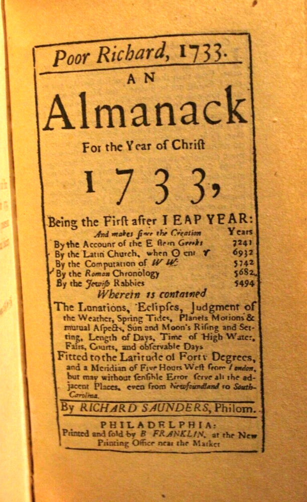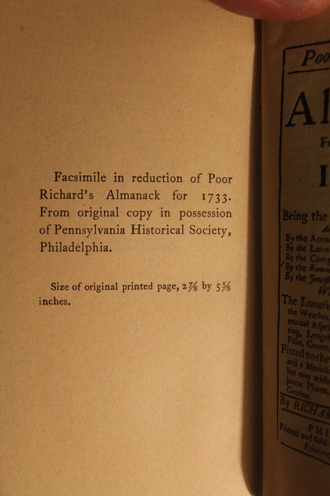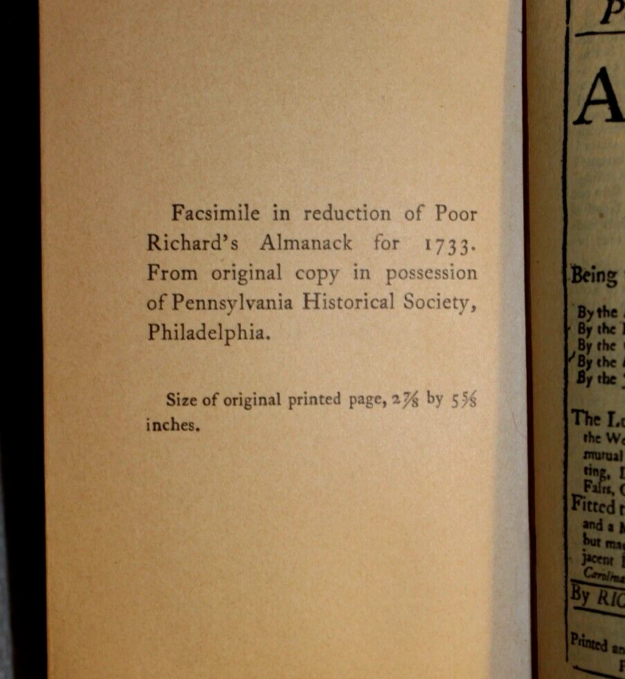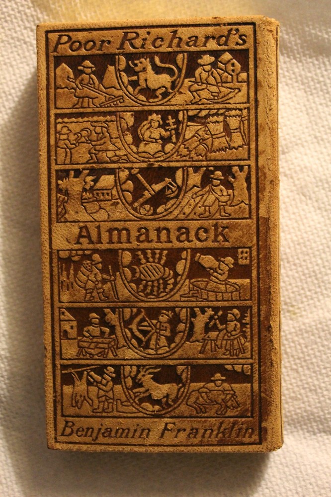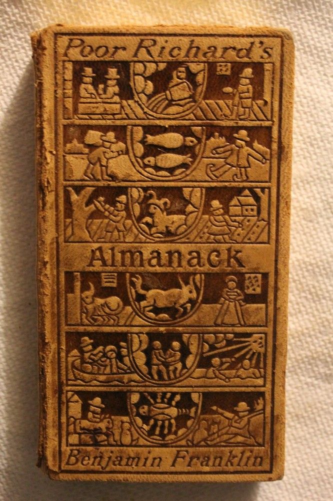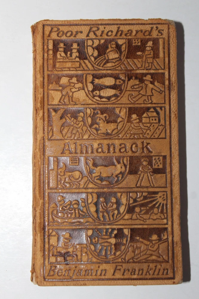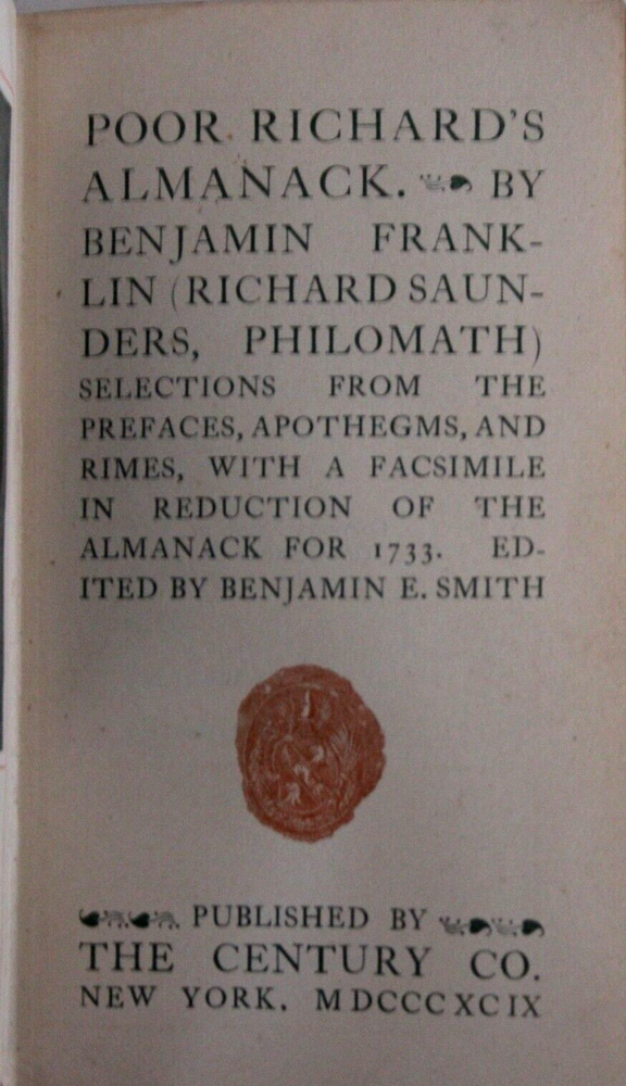 Benjamin Franklin POOR RICHARD’S ALMANACK 1898 Edition Fine tooled Leather with gold gilt page edges all around Published by The Century Company, New York, 1899 printing (very uncommon). Size is ~3”x5”x5/8”. "With a facsimile in reduction of the Almanack for 1733" Good condition. Edge wear and rubbing. Bidding solid. Front hinge more worn. Pages nice. Former owners bookplate on the back of the front cover.