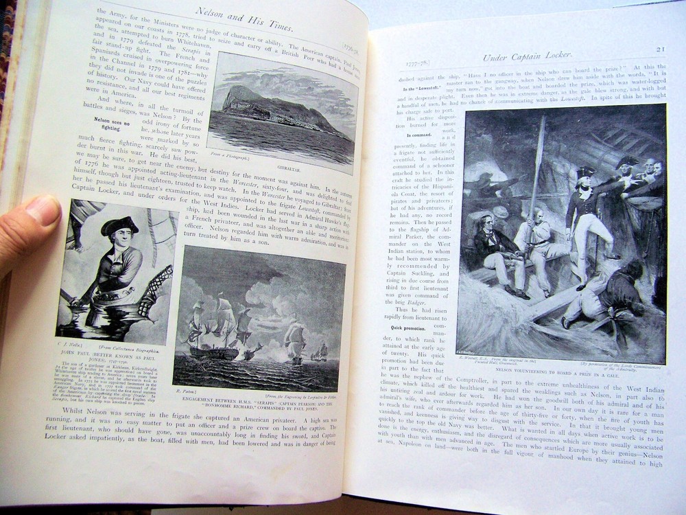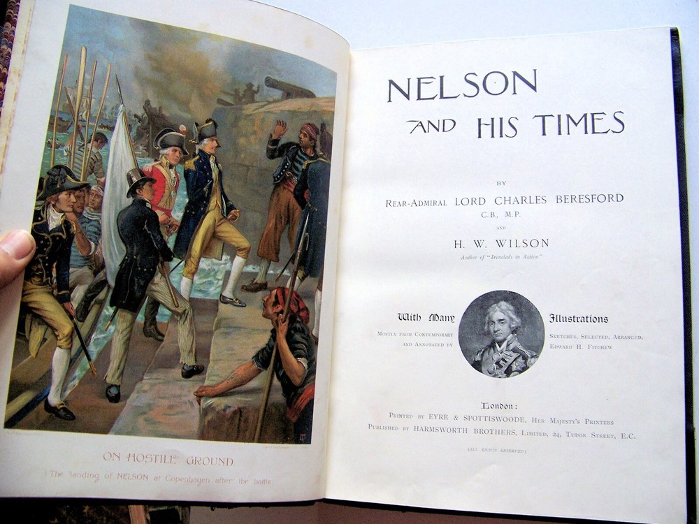 WE'VE PURCHASED ANOTHER TERRIFIC COLLECTION OF BOOKS A GREAT LIBRARY FULL OF VINTAGE MARITIME THEMED BOOKS! MANY FIRST EDITIONS SCARCE TITLES SO GET COMFORTABLE...GRAB A CUP OF COFFEE...AND ENJOY SHOPPING FOR THESE WONDERFUL OLD BOOKS ON THE HIGH SEAS FOR THE NEXT MONTH OR SO. SCARCE COPY OF THE 1898 U. K. EDITION LARGE VOLUME MEASURING 13" X 9-3/4" ILLUSTRATED THROUGHOUT BRITISH ROYAL NAVY HISTORY HALF-LEATHER BINDING NELSON AND HIS TIMES BY: REAR-ADM. LORD CHAS. BERESFORD PUBLISHED BY: EYRE & SPOTTISWOODE