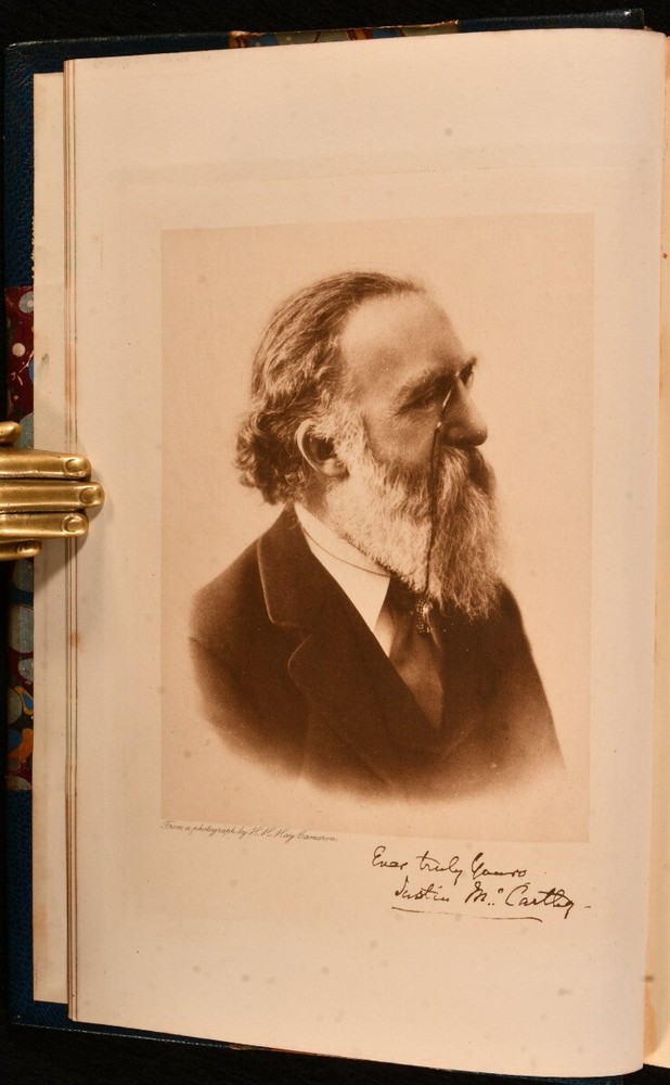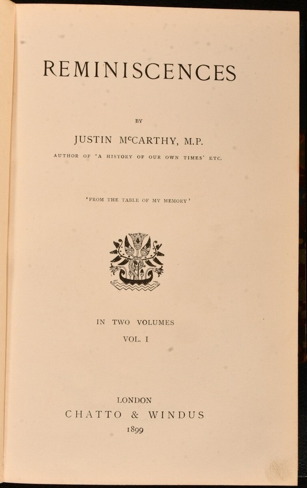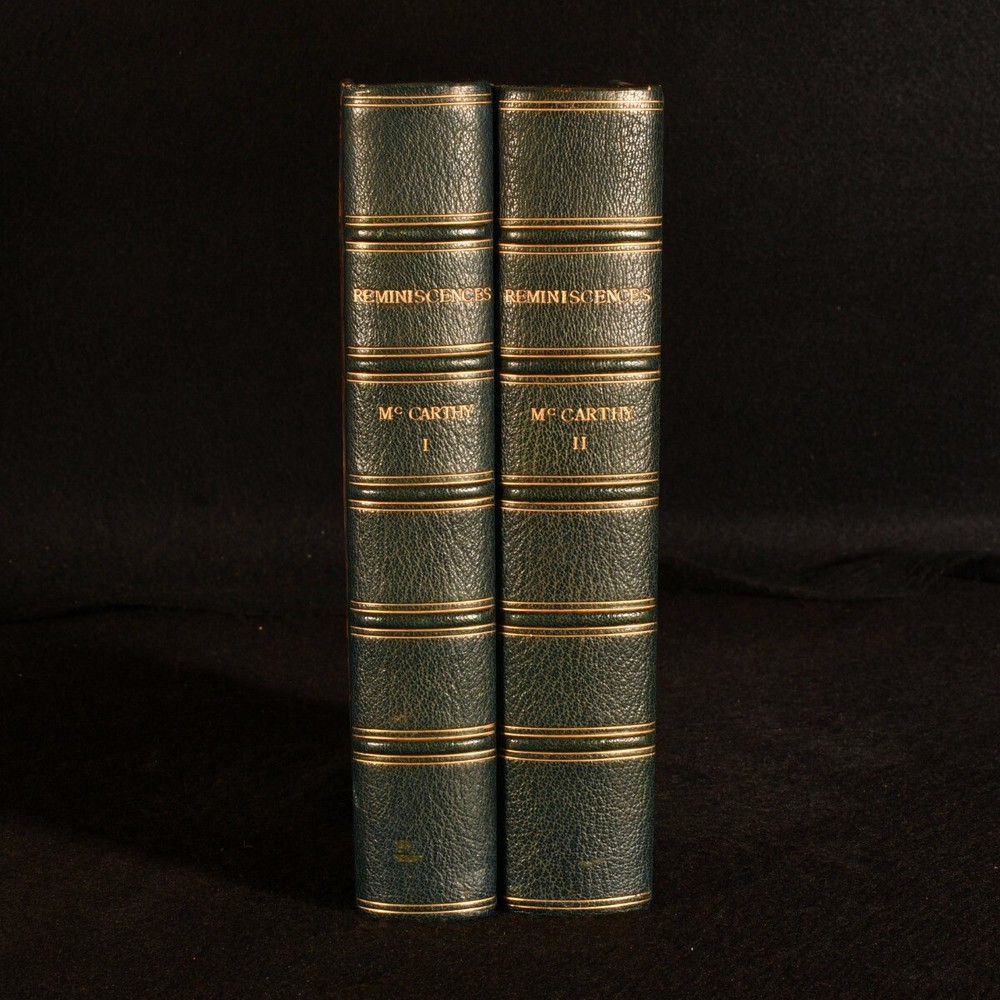 Click here to see our other books! Reminiscences Justin McCarthy 1899 Chatto and Windus : London 8.5" by 5.5" xii, 444pp; vi, 489pp SUMMARY An attractive two-volume set recounting the various notable figures met by Irish nationalist politician, Justin McCarthy. Overall Condition: Near Fine This book weighs 2 KG when packed UK Postage: £ 3.99 US Postage: £ 29.99 EU Postage : £ 21.99 European Postage: £ 23.99 Asia Postage: £ 37.99 Worldwide Postage: £ 38.99 DESCRIPTION The first edition of this collection of memoirs from Irish nationalist, politician and historian, Justin McCarthy. Complete in two volumes, uncommon to find. Attractively bound in half morocco with marble boards. Containing recollections of important men and women who McCarthy has met during his life as an author, historian and member of the Irish parliament, where he chaired the Anti-Parnellite wing of the Nationalist Party. Those mentioned include George Eliot, Napoleon, Rudyard Kipling and William Gladstone. From the library of Alexander Stone (1907-1998), a banker and philanthropist who founded his own law firm, Alexander Stone & Co, in 1932. In 1993 he donated a library of around 1500 antiquarian books to the University of Glasgow, designated the Alexander Stone Library. With a frontispiece portrait of McCarthy to Vol I. CONDITION In half morocco binding with marble boards. Externally, very smart with shelf wear and rubbing to the boards. Ex libris bookplate of one Alexander Stone to the front pastedowns. Internally, firmly bound. Pages are bright and clean. Overall Condition: Near Fine GLOSSARY OF TERMS Overall Condition (Dustwrapper condition rating is shown after that for the book itself, where a dustwrapper is present) Fine - Very well preserved copy showing very little wear Very Good Indeed - Only one or two minor faults, really a very attractive copy Very Good - Quite a wide term meaning no major faults but probably several smaller ones often expected given the age of the book, but still a respectable copy Good - Meaning not very good. Some more serious faults as will be described in the condition report under 'condition' Good Only - Meaning one or more faults that could really do with repair Fair - As with good only above but with other faults leaving a compromised copy even after repair Poor - Really bad and possibly seriously incomplete. We only sell books in this condition where their rarity or value makes them attractive none the less. Major defects will be described. GUARANTEE We offer a full money back guarantee on our descriptions. Please ask for details and conditions. We prefer PAYPAL. If you pay via PAYPAL we will post the item off the same or the next working day with the postage you have selected. Please note we cannot accept USD cheques