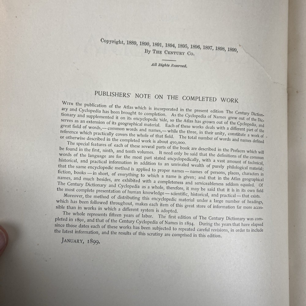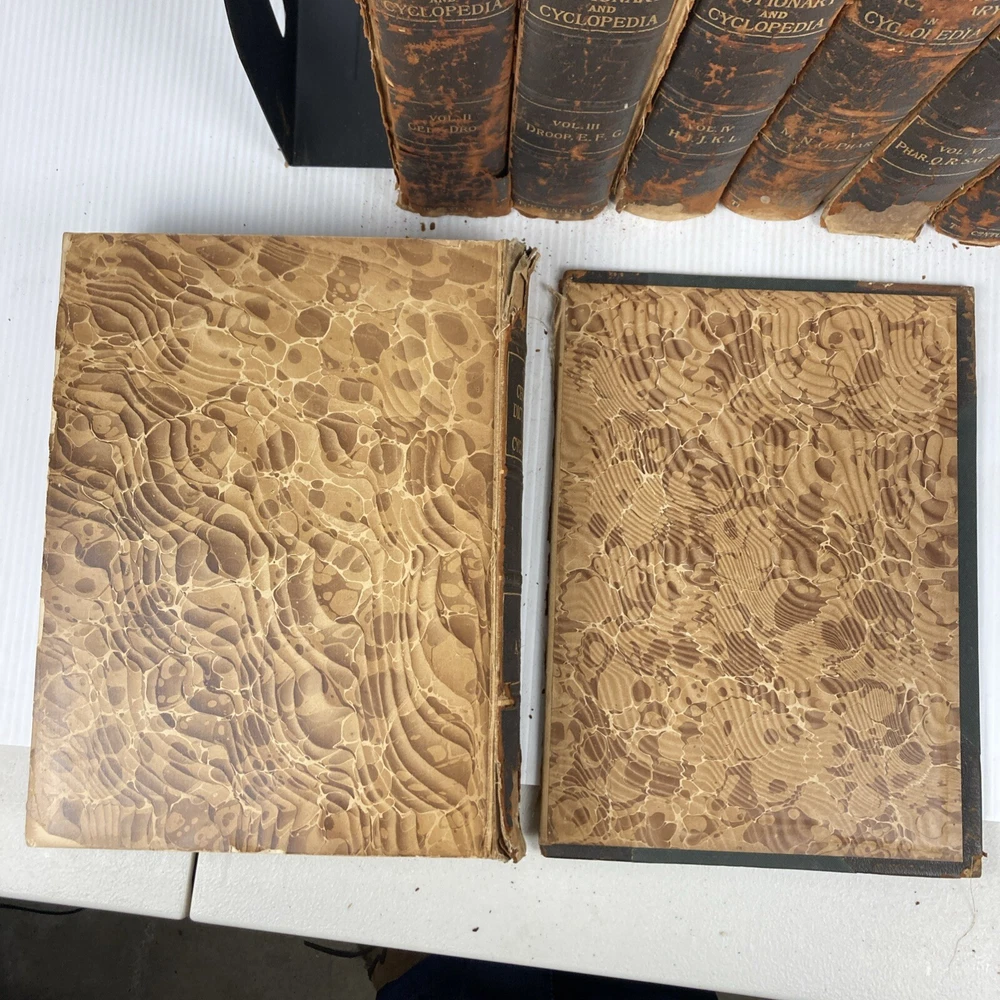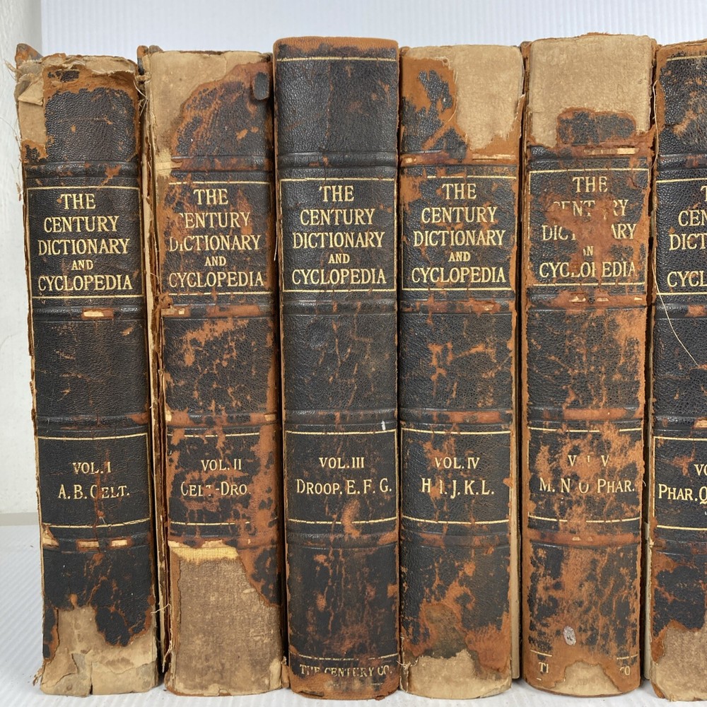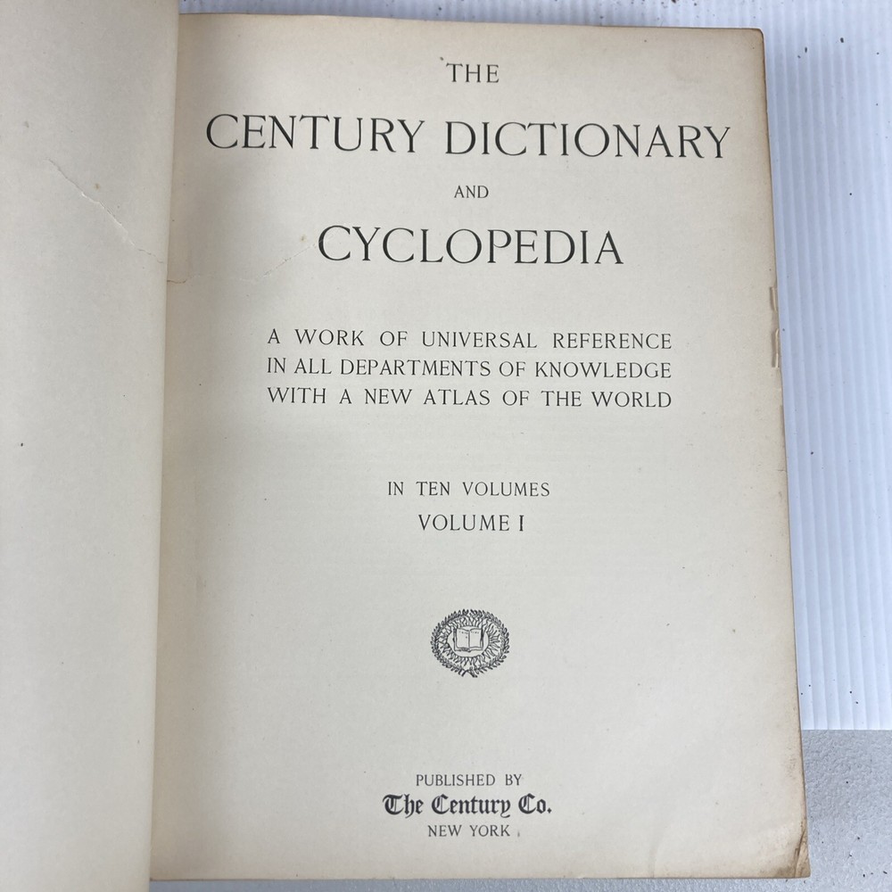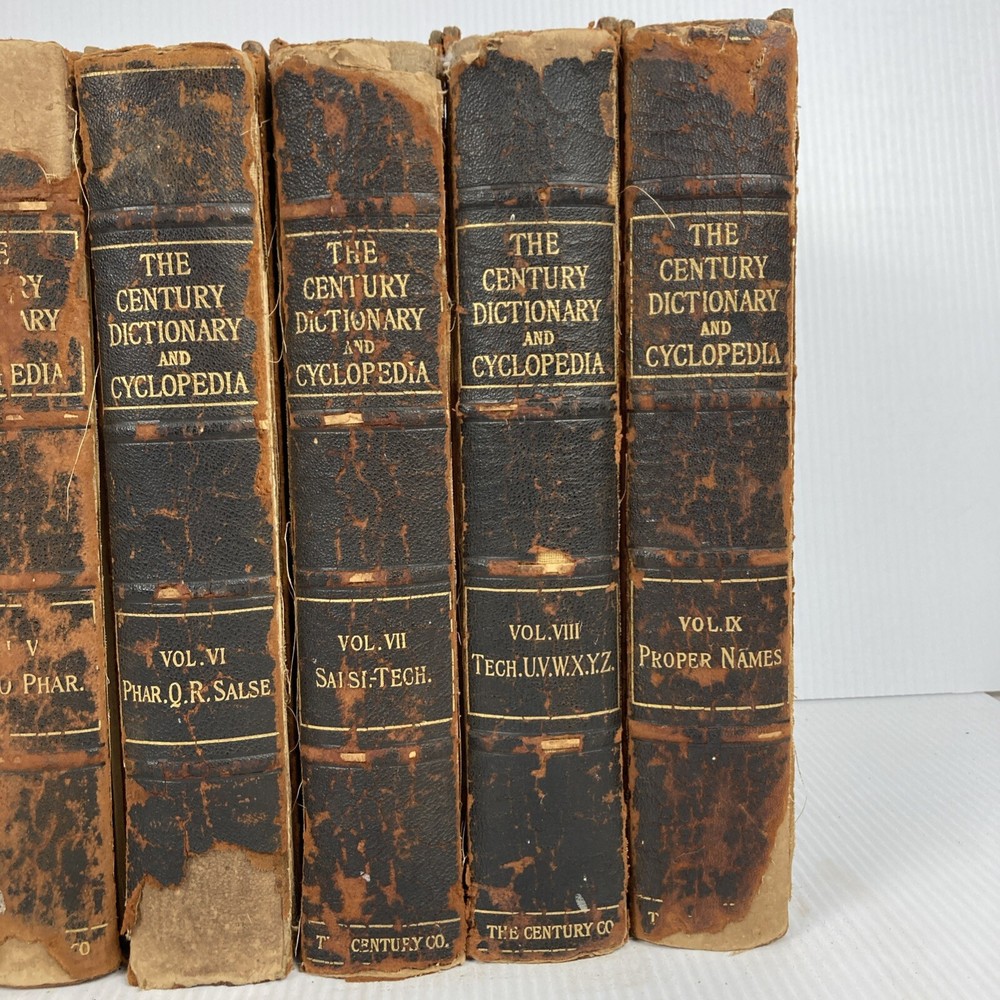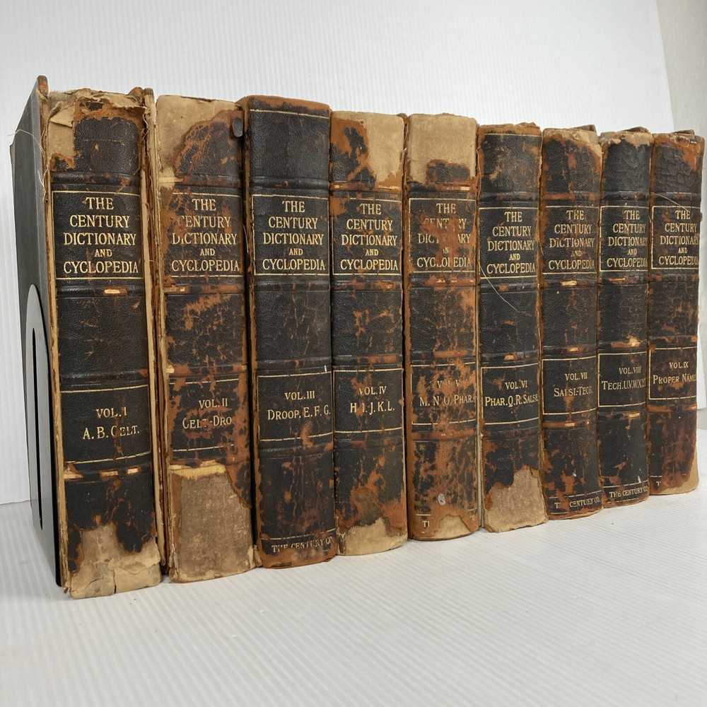This is a rare, antique, 9-volume set of The Century Dictionary and Cyclopedia: A Work of Universal Reference in All Departments of Knowledge with a New Atlas of the World , published by The Century Company in 1899. The books are bound in leather. Please note condition issues described above. The set contains: 8 profusely illustrated A to Z volumes. The plan for the dictionary and cyclopedia was described as including "three things: the construction of a general dictionary for every literary and practical use; a more complete collection of the technical terms of the various sciences, arts, trades, and professions than has yet been attempted; and the addition to the definitions proper of such related encyclopedic matterk, with pictorial illustrations as shall constitute a convenient book of general reference." The 9th volume addresses Proper Names of prominent historic individuals and places. The set provides a fascinating look at the state of the world's knowledge and perspectives at the turn of the century. The volumes are 12" tall x 9" wide and about 2" thick. See photos for content examples. (The 10th atlas volume is not included.) I ship books carefully and securely in protective boxes.
