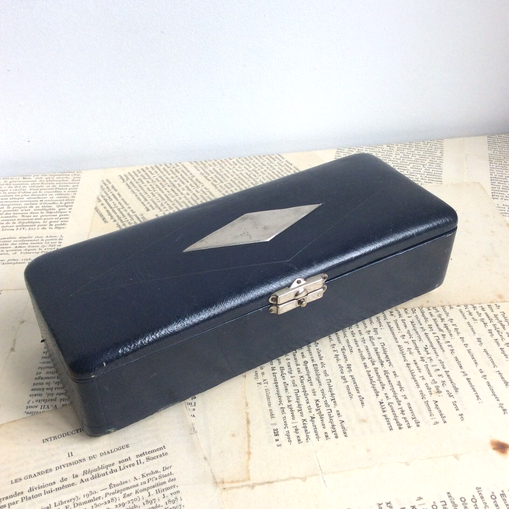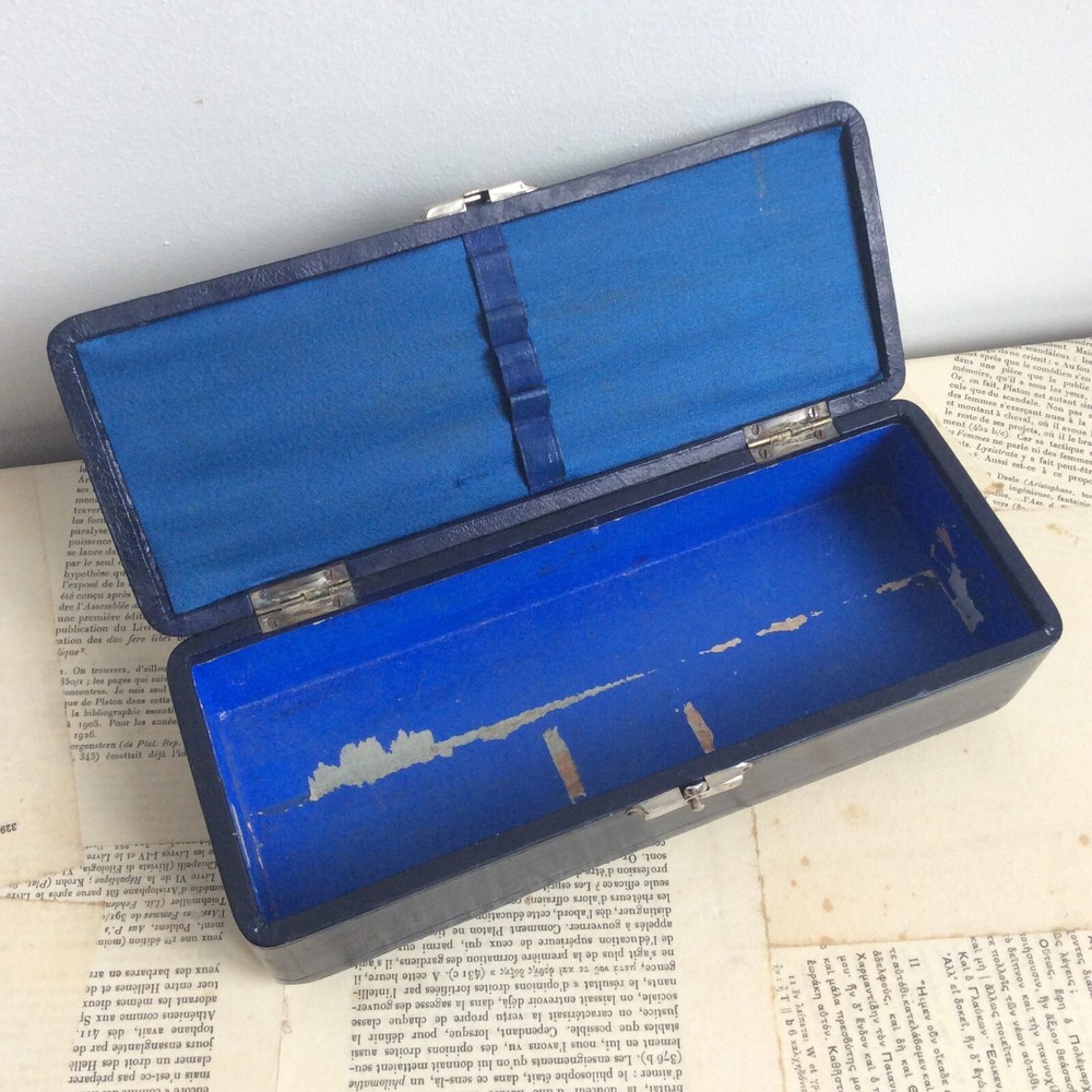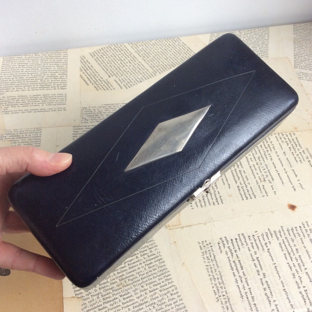 Box 1900 covered in dark blue leather with metal inlay Fabric and paper interior 22.5 x 8.5 cm - Height 6 cm Good condition, micro friction and wear inside Bulk postage upon request - Extended Producer Responsibility, REP Unique ID: FR332459_01OBWE