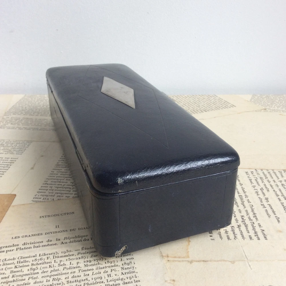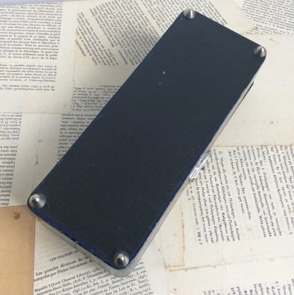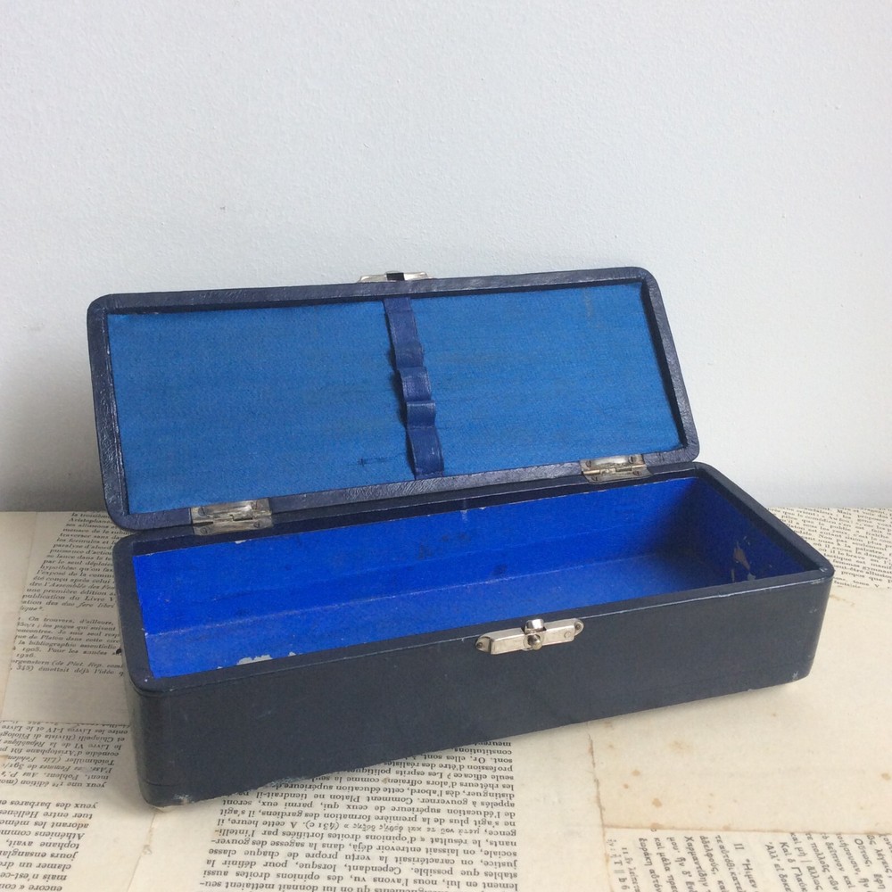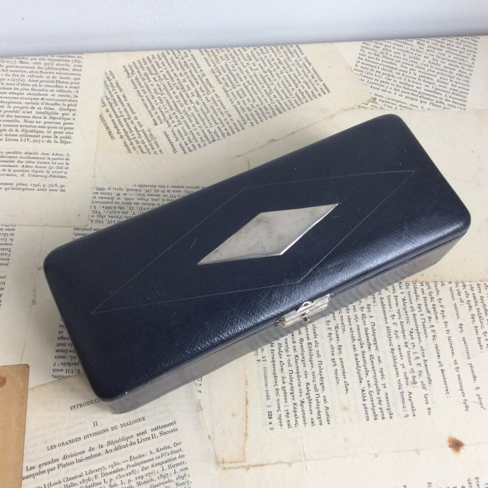 Box 1900 covered in dark blue leather with metal inlay Fabric and paper interior 22.5 x 8.5 cm - Height 6 cm Good condition, micro friction and wear inside Bulk postage upon request - Extended Producer Responsibility, REP Unique ID: FR332459_01OBWE