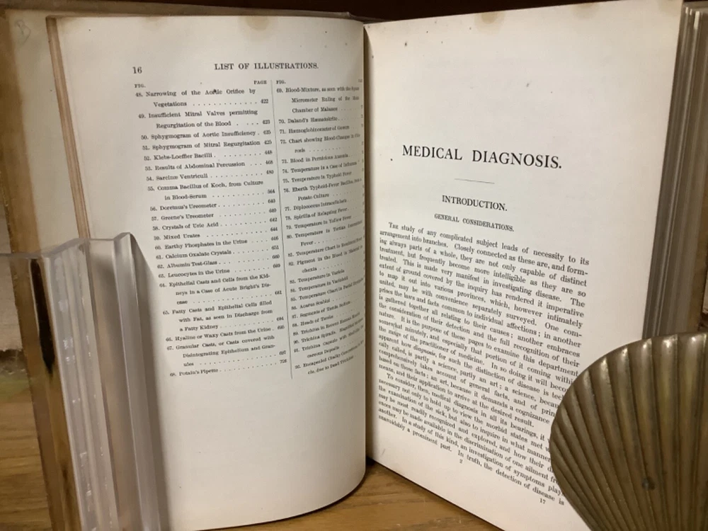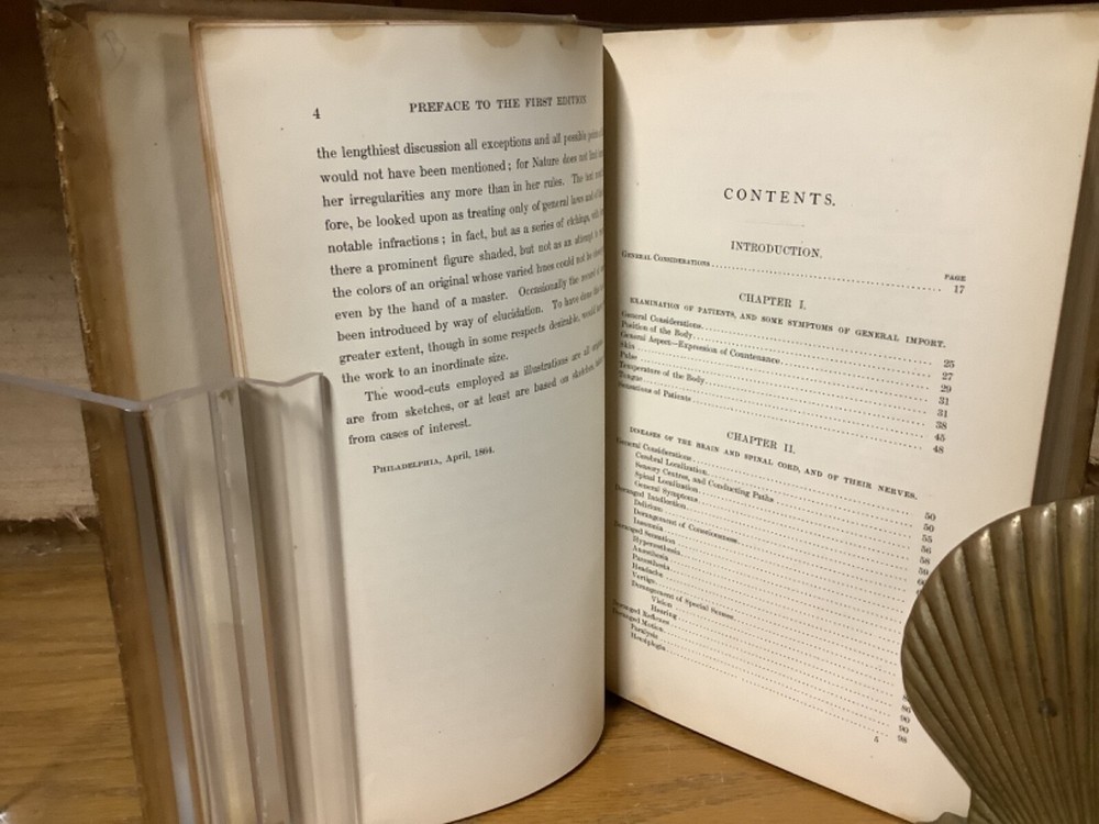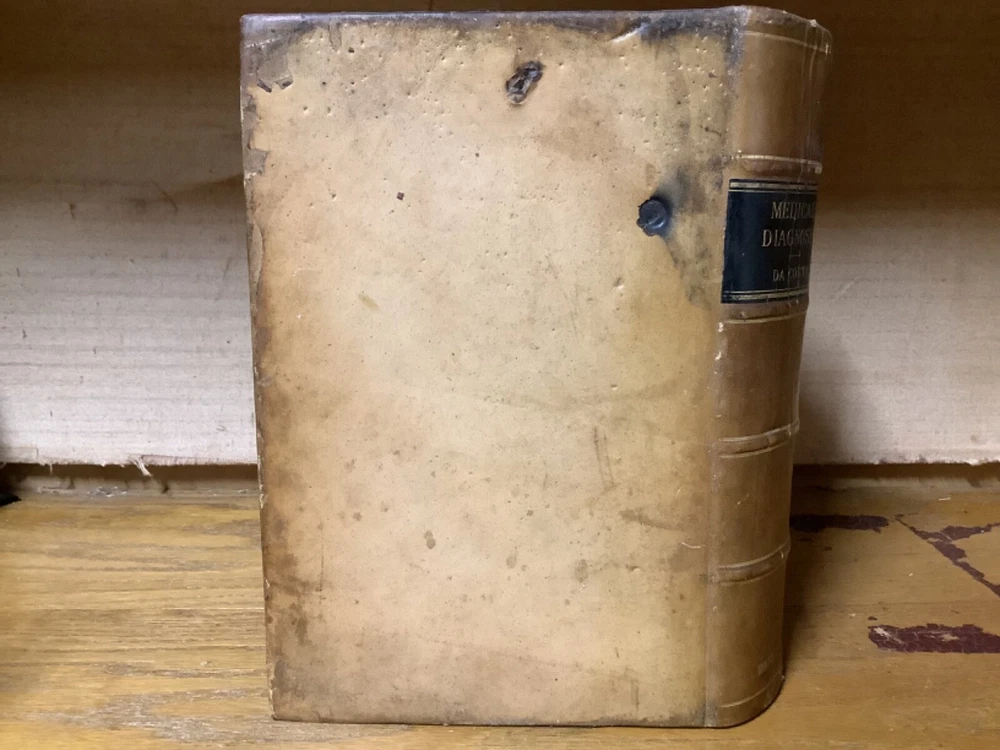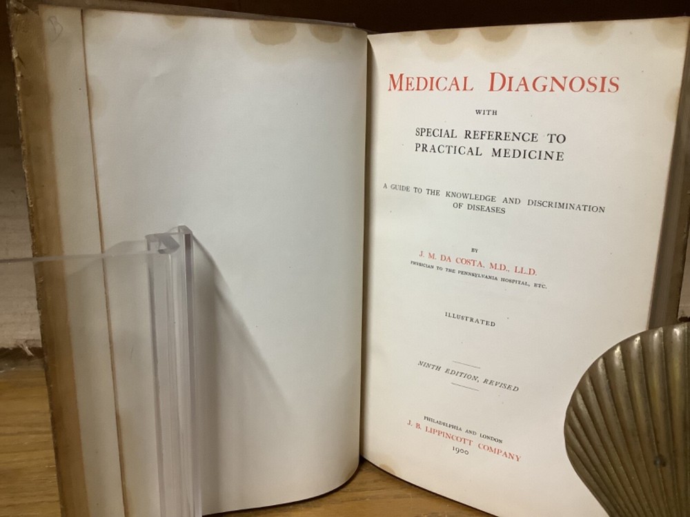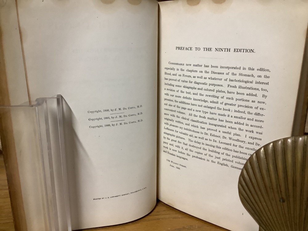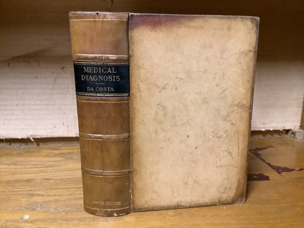 Medical Diagnosis with Special Reference to Practical Medicine. A Guide to the Knowledge and Discrimination of Diseases. By J.M. Da Costa and printed in Philadelphia by J.B. Lippincott. 1900, 966 pp, 9.5” x 6.5”, 8vo, hardcover full leather. In good condition, with light rubbing and wear to exterior, primarily along perimeter. Two indents on rear board. Some cracking to title label on spine. Hinges remain in good condition and text block remains bound well. Staining around edges and corners of some pages. Light markings and marginalia. Nicely illustrated with a variety of sketches, photographs, and plates throughout. General age-related toning to pages, along with periodic foxing and wear. Please see photographs and ask any questions prior to purchasing. A nice copy and later edition by Jacob Mendes Da Costa (1833-1900), an American physician best known for his documentation of Da Costa’s Syndrome, also known as Soldier’s Heart, an anxiety and heart condition that was often documented in soldiers. COLN1900BFJB-0524-aj1551