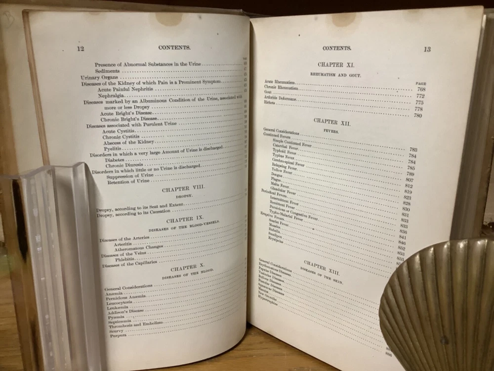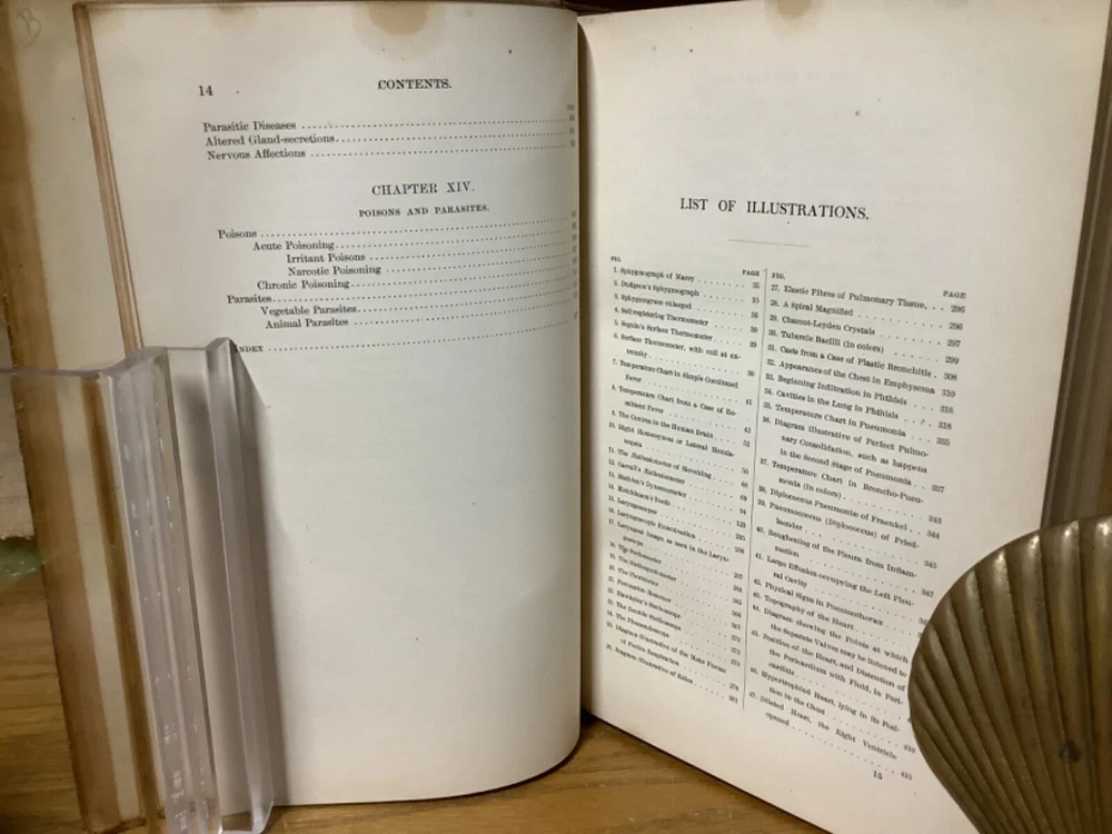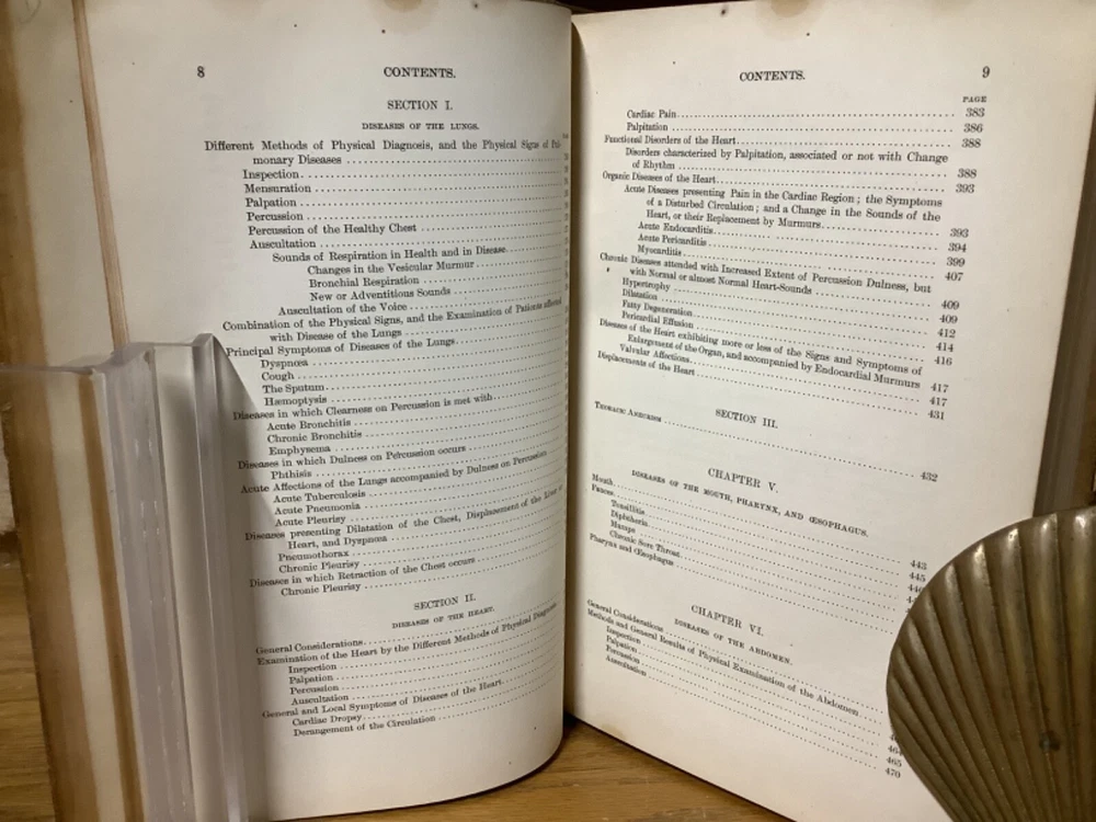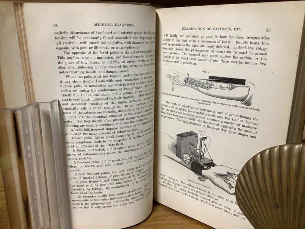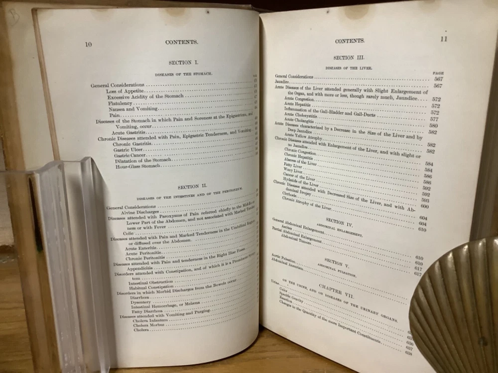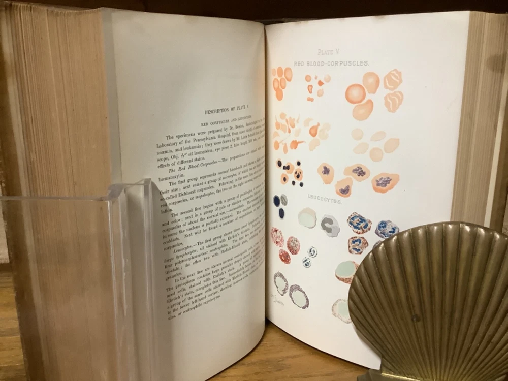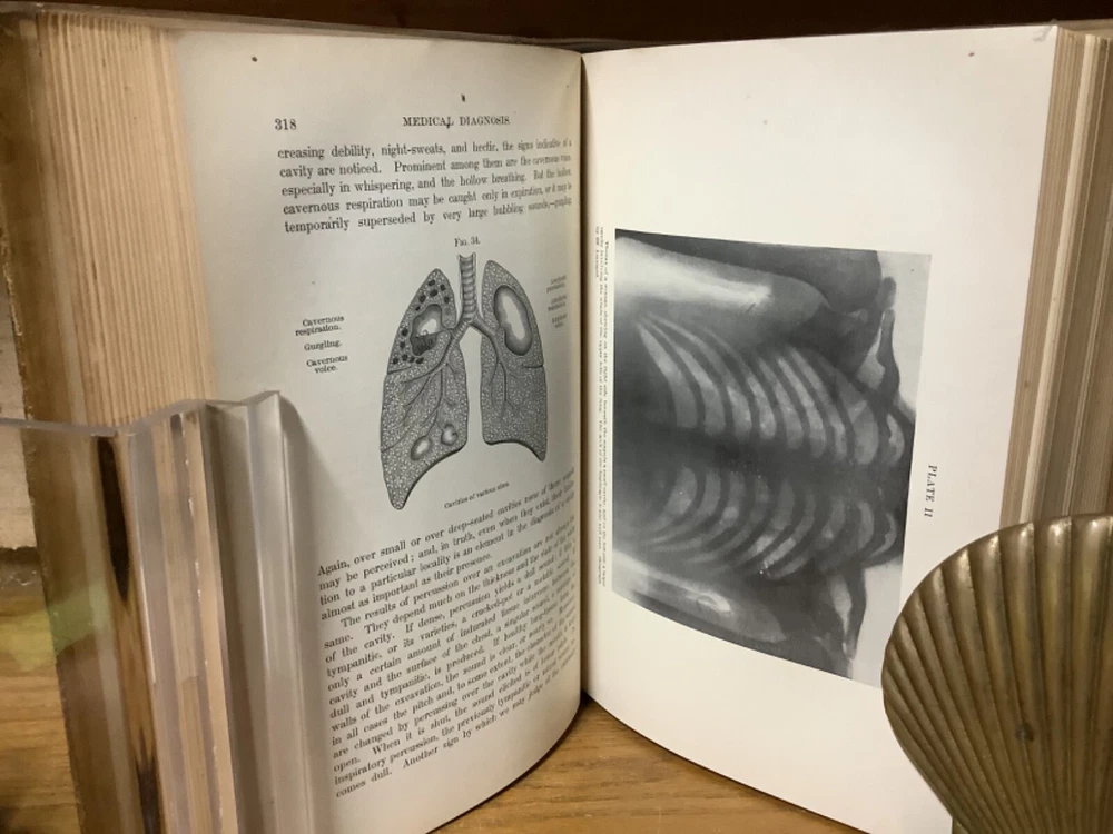 Medical Diagnosis with Special Reference to Practical Medicine. A Guide to the Knowledge and Discrimination of Diseases. By J.M. Da Costa and printed in Philadelphia by J.B. Lippincott. 1900, 966 pp, 9.5” x 6.5”, 8vo, hardcover full leather. In good condition, with light rubbing and wear to exterior, primarily along perimeter. Two indents on rear board. Some cracking to title label on spine. Hinges remain in good condition and text block remains bound well. Staining around edges and corners of some pages. Light markings and marginalia. Nicely illustrated with a variety of sketches, photographs, and plates throughout. General age-related toning to pages, along with periodic foxing and wear. Please see photographs and ask any questions prior to purchasing. A nice copy and later edition by Jacob Mendes Da Costa (1833-1900), an American physician best known for his documentation of Da Costa’s Syndrome, also known as Soldier’s Heart, an anxiety and heart condition that was often documented in soldiers. COLN1900BFJB-0524-aj1551
