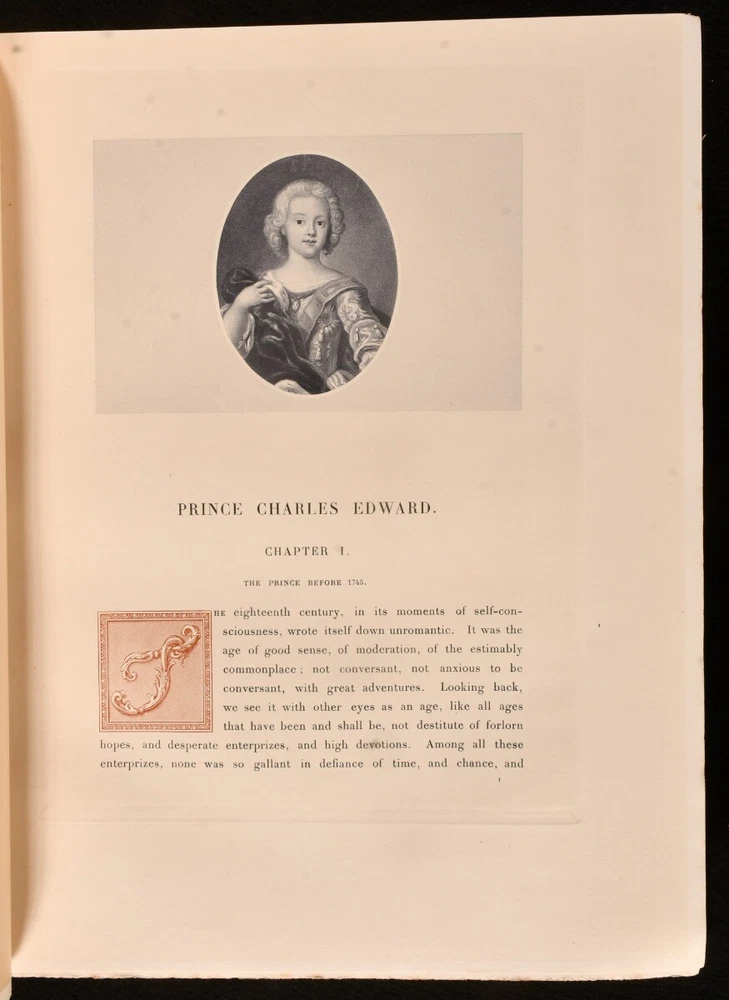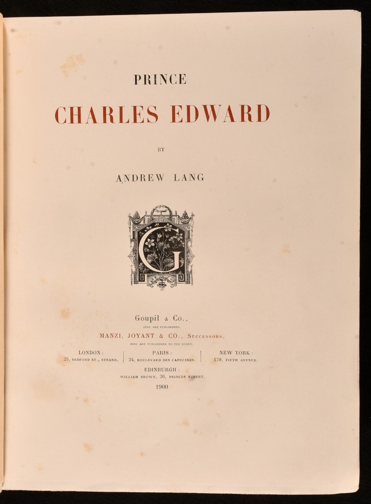 Click here to see our other books! Prince Charles Edward Andrew Lang 1900 Goupil & Co. : London, Paris & New York 13" by 10" vii, 300pp SUMMARY A lovely Bumpus signed leather bound limited edition of this biography of Prince Charles Edward. Colour Plates,First Edition,Illustrated,Leather Binding,Limited Edition,Signed Binding Overall Condition: Very Good Indeed This book weighs 5 KG when packed UK Postage: £ 4.49 US Postage: £ 42.99 EU Postage : £ 27.99 European Postage: £ 45.99 Asia Postage: £ 74.99 Worldwide Postage: £ 129.99 DESCRIPTION Limited edition of Prince Charles Edward by Andrew Lang in Bumpus signed half morocco binding and cloth boards. A limited edition of one thousand five hundred copies on fine paper of which this is number 414. A lovely densely illustrated biography based on the Stuart Papers held at Windsor Castle. Prince Charles Edward Stuart was known as 'the Young Pretender' and 'the Young Chevalier' during his lifetime. With forty seven monochrome plates and a bright colour plate as the frontispiece. Collated, complete. Prior owner's book plate to the first free endpaper. CONDITION In Bumpus signed half morocco binding and cloth boards. Externally, very smart. There is some minor rubbing to the extremities. Prior owner's book plate to the first free endpaper. Internally, firmly bound. The pages are bright and clean with the odd spot. Overall Condition: Very Good Indeed GLOSSARY OF TERMS Overall Condition (Dustwrapper condition rating is shown after that for the book itself, where a dustwrapper is present) Fine - Very well preserved copy showing very little wear Very Good Indeed - Only one or two minor faults, really a very attractive copy Very Good - Quite a wide term meaning no major faults but probably several smaller ones often expected given the age of the book, but still a respectable copy Good - Meaning not very good. Some more serious faults as will be described in the condition report under 'condition' Good Only - Meaning one or more faults that could really do with repair Fair - As with good only above but with other faults leaving a compromised copy even after repair Poor - Really bad and possibly seriously incomplete. We only sell books in this condition where their rarity or value makes them attractive none the less. Major defects will be described. GUARANTEE We offer a full money back guarantee on our descriptions. Please ask for details and conditions. We prefer PAYPAL. If you pay via PAYPAL we will post the item off the same or the next working day with the postage you have selected. Please note we cannot accept USD cheques