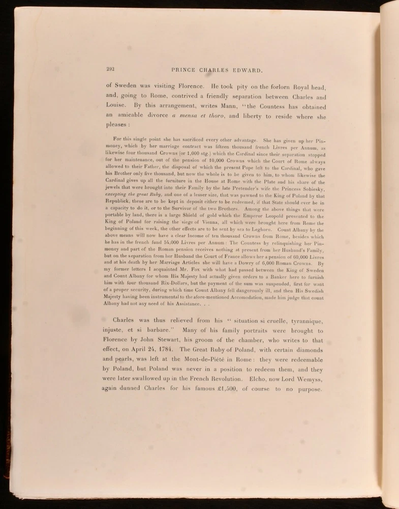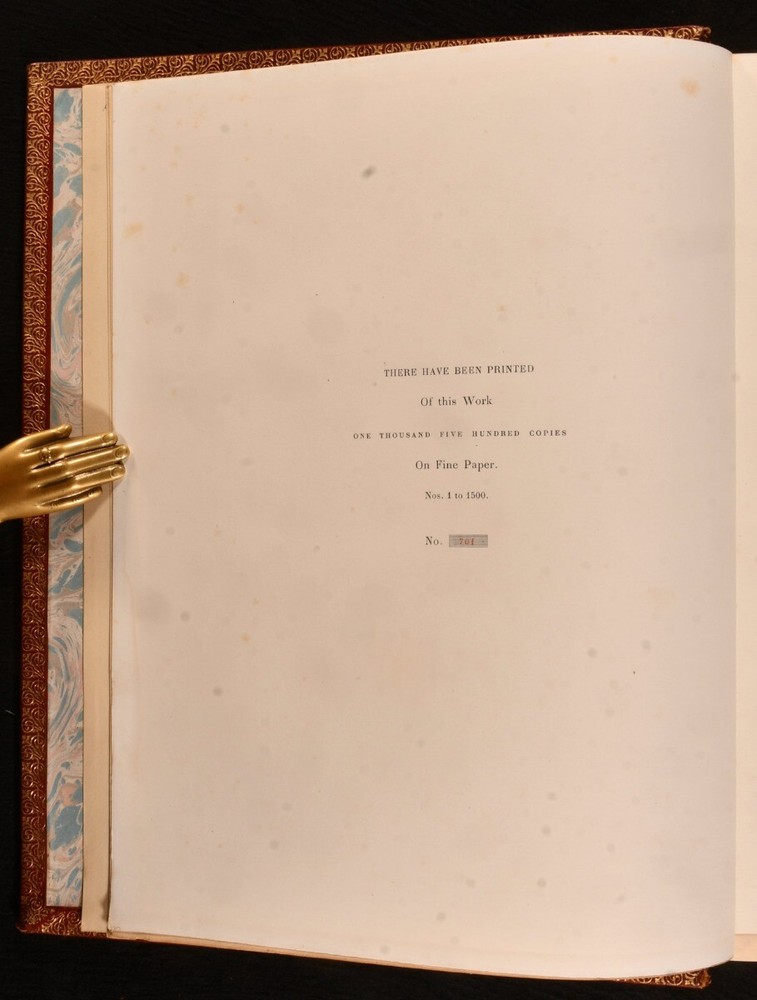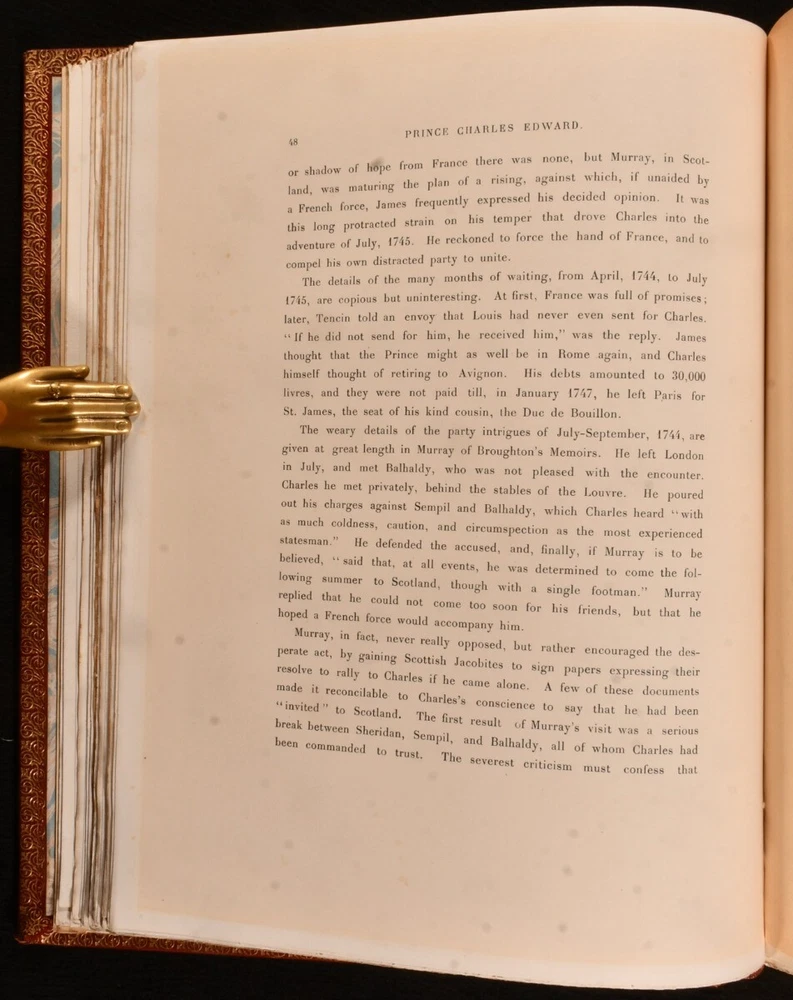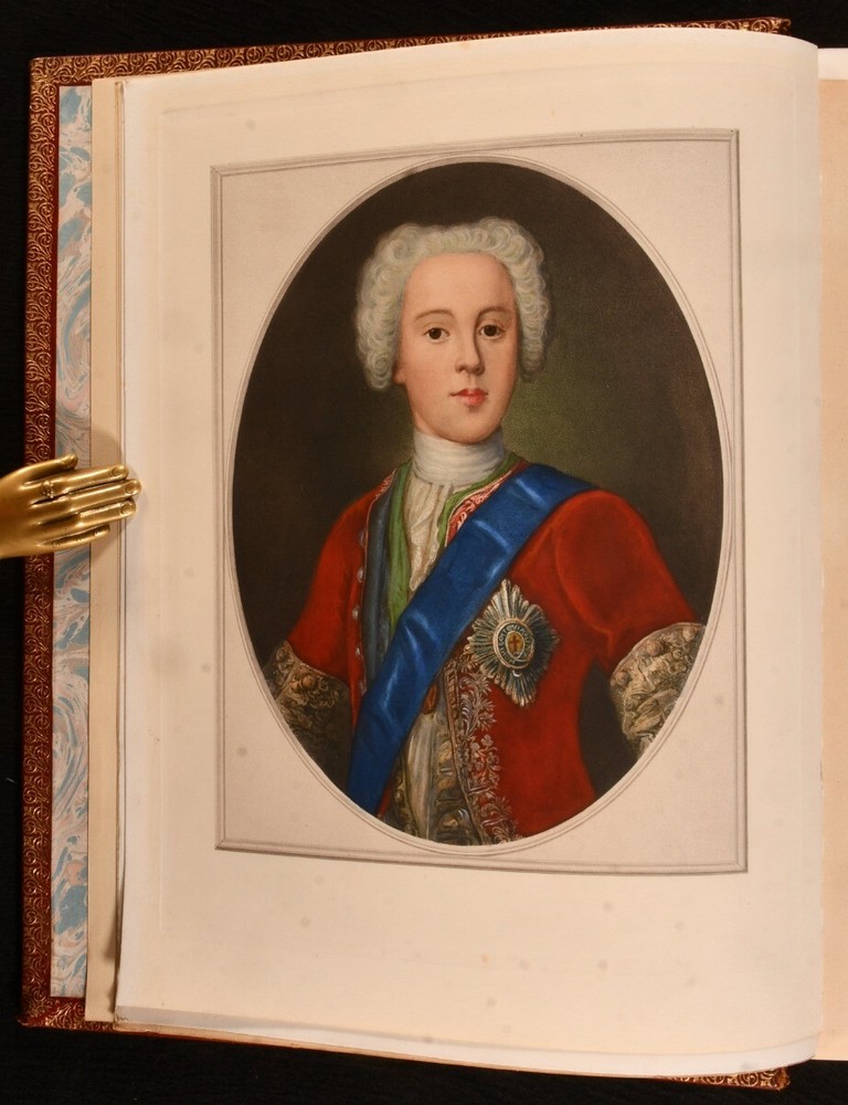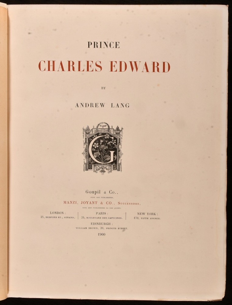 Click here to see our other books! Prince Charles Edward Andrew Lang 1900 Goupil & Co; Manzi, Joyant & Co : London 13.5" by 11" viii, 2-300 [1]pp SUMMARY A beautifully bound, full morocco, limited edition biography of Prince Charles Edward, illustrated throughout. Colour Plates,First Edition,Illustrated,Leather Binding,Limited Edition Overall Condition: Very Good Indeed This book weighs 3 KG when packed UK Postage: £ 3.99 US Postage: £ 36.99 EU Postage : £ 25.99 European Postage: £ 27.99 Asia Postage: £ 47.99 Worldwide Postage: £ 69.99 DESCRIPTION Number 701 of 1,500 copies of this limited edition work produced. Illustrated with a hand-coloured portrait frontispiece and forty-seven further plates, each retaining the original tissue guard. Collated, complete. A biographical study of the life of Prince Charles Edward Stuart was known as 'the Young Pretender' and 'the Young Chevalier' during his lifetime. In popular memory, he is known as Bonnie Prince Charlie. The work of Scottish poet, novelist, critic and folklore collector Andrew Lang. With the bookplate of W. D. Mackenzie of Fawley Court to the front pastedown. A lovely and densely illustrated biography based on the Stuart Papers held at Windsor Castle. CONDITION In a full morocco signed binding, with gilt detailing. Front board and back strip exceptionally bright, with light tide marks to fore edge and tail of rear board. Bookplate to front pastedown. Internally, firmly bound. Pages exceptionally bright, with only the odd area of spotting. Overall Condition: Very Good Indeed GLOSSARY OF TERMS Overall Condition (Dustwrapper condition rating is shown after that for the book itself, where a dustwrapper is present) Fine - Very well preserved copy showing very little wear Very Good Indeed - Only one or two minor faults, really a very attractive copy Very Good - Quite a wide term meaning no major faults but probably several smaller ones often expected given the age of the book, but still a respectable copy Good - Meaning not very good. Some more serious faults as will be described in the condition report under 'condition' Good Only - Meaning one or more faults that could really do with repair Fair - As with good only above but with other faults leaving a compromised copy even after repair Poor - Really bad and possibly seriously incomplete. We only sell books in this condition where their rarity or value makes them attractive none the less. Major defects will be described. GUARANTEE We offer a full money back guarantee on our descriptions. Please ask for details and conditions. We prefer PAYPAL. If you pay via PAYPAL we will post the item off the same or the next working day with the postage you have selected. Please note we cannot accept USD cheques