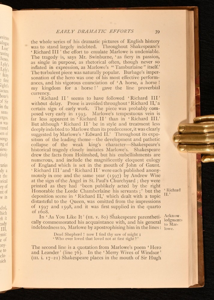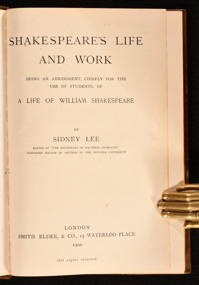 Click here to see our other books! Shakespeare's Life and Work Sidney Lee 1900 Smith Elder & Co. : London 7" by 4.5" xiv, [2], 232pp. SUMMARY Handsome biographical sketch of the life and work of William Shakespeare by Sidney Lee. Leather Binding,Rebound Overall Condition: Very Good Indeed This book weighs 0.5 KG when packed UK Postage: £ 3.99 US Postage: £ 15.99 EU Postage : £ 13.99 European Postage: £ 14.99 Asia Postage: £ 18.99 Worldwide Postage: £ 19.99 DESCRIPTION A biographical sketch of the life and work of William Shakespeare, abridged for students from 1898 A Life of William Shakespeare by Sidney Lee, English biographer, writer, and critic. First edition thus. Illustrated with a frontispiece and four further full page plates. Collated, complete. CONDITION Rebound in half calf over marbled boards, marbled endpapers. Externally very smart with minor shelf wear only, rubbed to spine. Internally, firmly bound. Pages bright and clean. Overall Condition: Very Good Indeed GLOSSARY OF TERMS Overall Condition (Dustwrapper condition rating is shown after that for the book itself, where a dustwrapper is present) Fine - Very well preserved copy showing very little wear Very Good Indeed - Only one or two minor faults, really a very attractive copy Very Good - Quite a wide term meaning no major faults but probably several smaller ones often expected given the age of the book, but still a respectable copy Good - Meaning not very good. Some more serious faults as will be described in the condition report under 'condition' Good Only - Meaning one or more faults that could really do with repair Fair - As with good only above but with other faults leaving a compromised copy even after repair Poor - Really bad and possibly seriously incomplete. We only sell books in this condition where their rarity or value makes them attractive none the less. Major defects will be described. GUARANTEE We offer a full money back guarantee on our descriptions. Please ask for details and conditions. We prefer PAYPAL. If you pay via PAYPAL we will post the item off the same or the next working day with the postage you have selected. Please note we cannot accept USD cheques