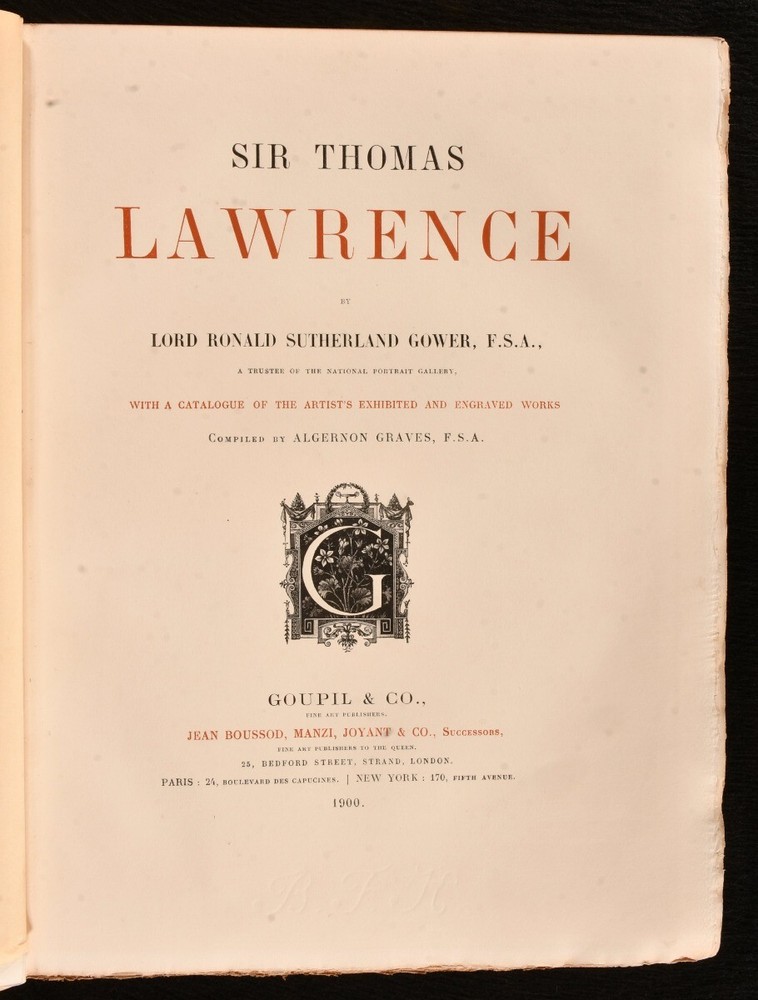 Click here to see our other books! Sir Thomas Lawrence Lord Ronald Sutherland Gower 1900 Goupil & Co : Paris; New York 13" by 10.5" [4], iv, 181pp SUMMARY A Maclehose bound limited edition volume looking at the beautiful portraits painted by Sir Thomas Lawrence. Colour Plates,Illustrated,Leather Binding,Limited Edition Overall Condition: Very Good Indeed This book weighs 4 KG when packed UK Postage: £ 4.49 US Postage: £ 39.99 EU Postage : £ 26.99 European Postage: £ 36.99 Asia Postage: £ 65.99 Worldwide Postage: £ 99.99 DESCRIPTION A limited edition of six hundred copies, of which this is numbered seventeen. Bound by Maclehose. Illustrated with hand-coloured frontispiece, two hand-coloured plates, and fifty-one monochrome plates. Collated, complete. A beautiful work looking at the portraits painted by Sir Thomas Lawrence. Lawrence was an immensely popular and fashionable artist during his lifetime; he acquired the patronage of the Prince Regent and had numerous luminaries of the day sit for him, the portraits of whom are included in this volume, such as Princess Charlotte of Wales, King George IV, Sir Walter Scott, Sarah Siddons, the Duke of Wellington, Pope Pius VII, Lady Emma Hamilton, and more. By Lord Ronald Sutherland Gower, with a catalogue compiled by Algernon Graves. CONDITION In a full crushed morocco binding, bound by Maclehose. Externally, smart, with light marks, including ring marks to the front board. Internally, firmly bound. Pages are bright and clean, with a few scattered spots. Overall Condition: Very Good Indeed GLOSSARY OF TERMS Overall Condition (Dustwrapper condition rating is shown after that for the book itself, where a dustwrapper is present) Fine - Very well preserved copy showing very little wear Very Good Indeed - Only one or two minor faults, really a very attractive copy Very Good - Quite a wide term meaning no major faults but probably several smaller ones often expected given the age of the book, but still a respectable copy Good - Meaning not very good. Some more serious faults as will be described in the condition report under 'condition' Good Only - Meaning one or more faults that could really do with repair Fair - As with good only above but with other faults leaving a compromised copy even after repair Poor - Really bad and possibly seriously incomplete. We only sell books in this condition where their rarity or value makes them attractive none the less. Major defects will be described. GUARANTEE We offer a full money back guarantee on our descriptions. Please ask for details and conditions. We prefer PAYPAL. If you pay via PAYPAL we will post the item off the same or the next working day with the postage you have selected. Please note we cannot accept USD cheques