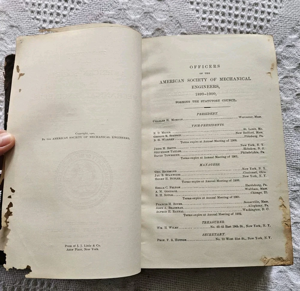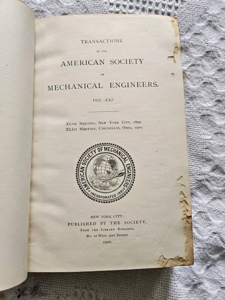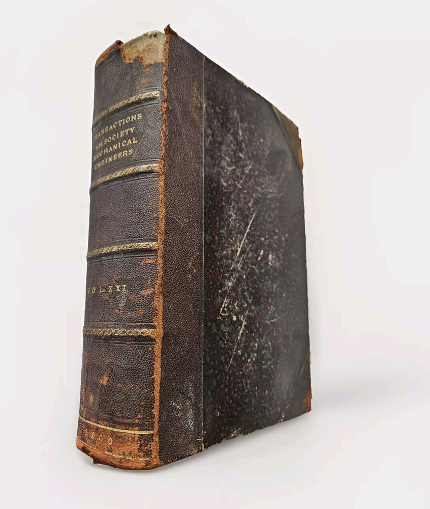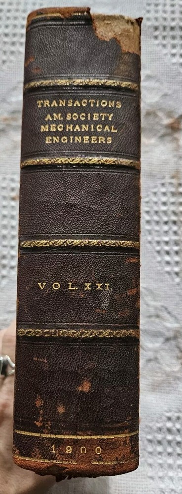 VERY RARE. 1900. Transactions of the American Society of Mechanical Engineers Vol XXI RARE. Antique Leather Hardcover book in good condition. It has edgewear, leather wear, chipping to first introduction pages, some cracking to hinging, and crisp and clean pages. It includes tons of illustrations, pull outs, and folders. See photos for specific details and wear.