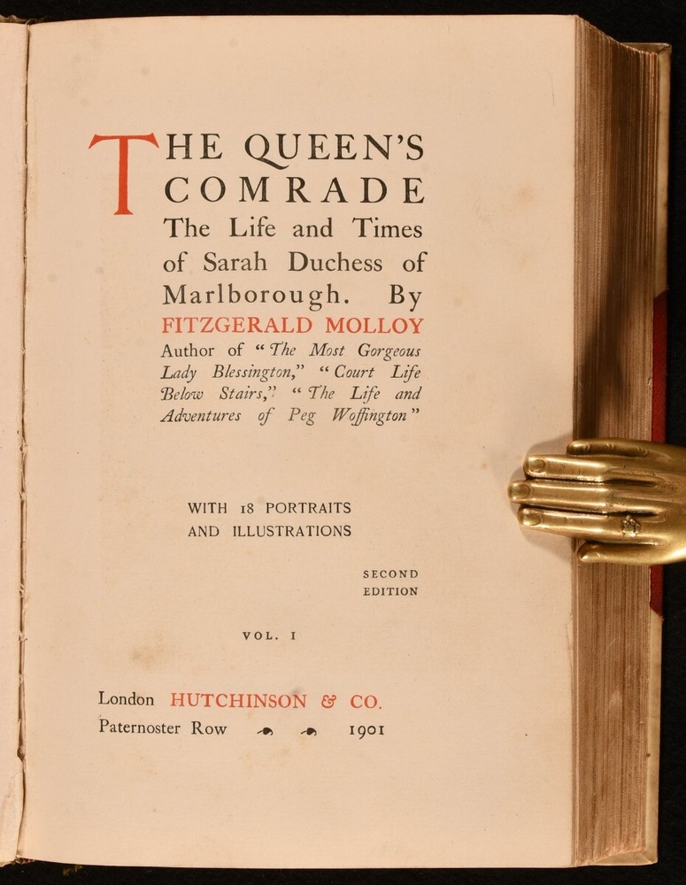 Click here to see our other books! The Queen's Comrade, The Life and Times of Sarah Duchess of Marlborough Fitzgerald Molloy 1901 Hutchinson & Co. : London 8.5" by 5.5" xii, 326; vii, 327-658pp. SUMMARY The second edition of this illustrated biography of Sarah, Duchess of Marlborough. Illustrated,Original Binding,Publishers' Original Binding Overall Condition: Very Good This book weighs 1.5 KG when packed UK Postage: £ 3.99 US Postage: £ 23.99 EU Postage : £ 18.99 European Postage: £ 19.99 Asia Postage: £ 31.99 Worldwide Postage: £ 32.99 DESCRIPTION Second edition. Illustrated with ten plates in volume one and eight plates in volume two. Collated complete. The biography of Sarah Churchill, Duchess of Marlborough and former Keeper of the Privy Purse. The Duchess was an English courtier who rose to become one of the most influential women of the time through her relationship with Anne, Queen of Great Britain. Written by Fitzgerald Molloy. Bound by Blackwell's, Oxford. CONDITION In the original half vellum binding with red cloth boards. Externally, smart with light shelf wear to the extremities and the odd small mark. Internally, firmly bound. Pages are very bright and clean with the odd spot. Overall Condition: Very Good GLOSSARY OF TERMS Overall Condition (Dustwrapper condition rating is shown after that for the book itself, where a dustwrapper is present) Fine - Very well preserved copy showing very little wear Very Good Indeed - Only one or two minor faults, really a very attractive copy Very Good - Quite a wide term meaning no major faults but probably several smaller ones often expected given the age of the book, but still a respectable copy Good - Meaning not very good. Some more serious faults as will be described in the condition report under 'condition' Good Only - Meaning one or more faults that could really do with repair Fair - As with good only above but with other faults leaving a compromised copy even after repair Poor - Really bad and possibly seriously incomplete. We only sell books in this condition where their rarity or value makes them attractive none the less. Major defects will be described. GUARANTEE We offer a full money back guarantee on our descriptions. Please ask for details and conditions. We prefer PAYPAL. If you pay via PAYPAL we will post the item off the same or the next working day with the postage you have selected. Please note we cannot accept USD cheques