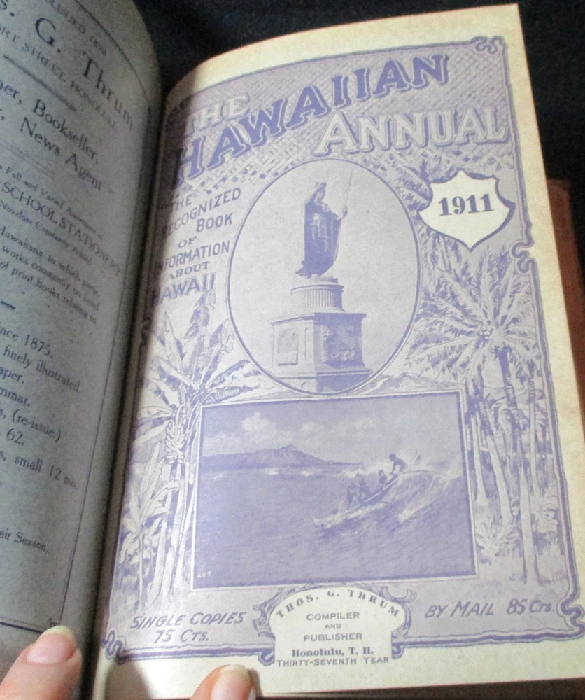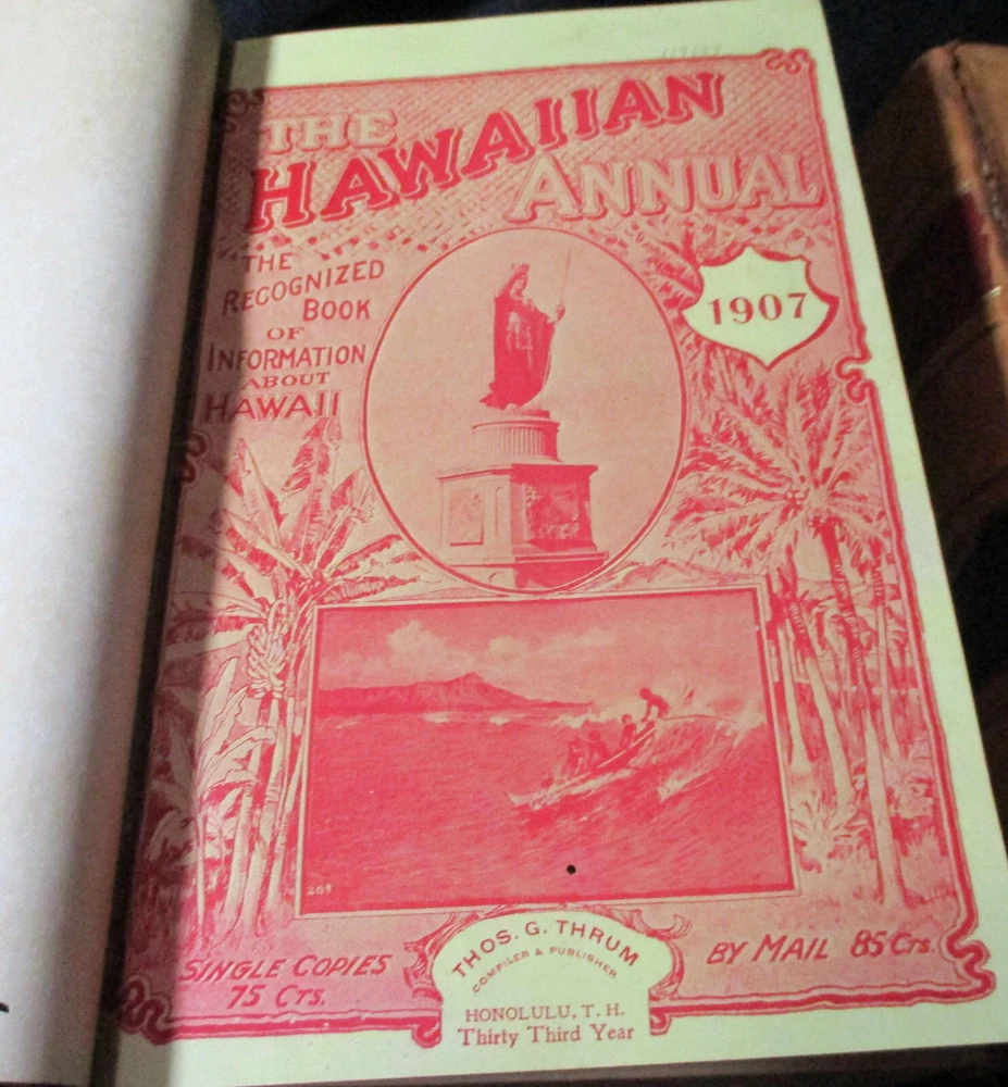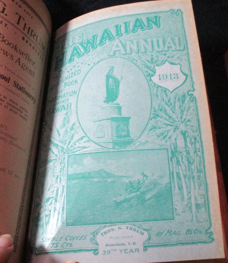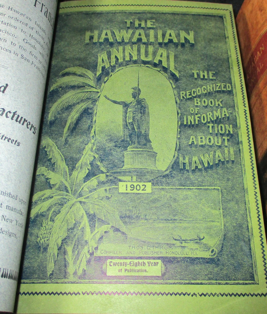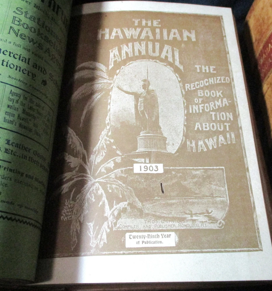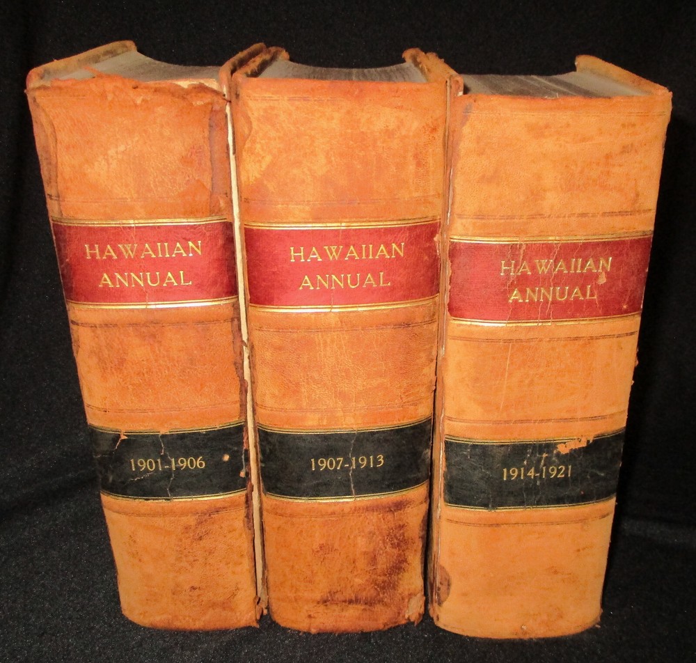 Hawaiian Almanac and Annual Set 1901-1921 Leather Bound 21 Issues RARE A Handbook of Information on Matters Relating the the Hawaiian Islands, Original and Selected, of Value to Merchants, Tourists and Others Thomas G. Thrum, Compiler and Publisher Fold-out map and tables A number of adverts in a book primarily of statistics of the time A number of photos included Includes topics: Hawaiian silver coin - Plantations - Land values - Geology - Hawaiian fish stories and superstitions - Ku-ula the Fish God - Moana Hotel - Railroad - Steamers - Postal service - Taxes - Imports and exports - Census - Registered Vesseals - list of birds - First display of Hawaiian flag in Europe - Wireless telegraphy - Calabashes - Laws passed each year - Ancient farming - Kilauea volcano - Wahiawa ditch - Kahoolawe - Awa - Numerous stories and legends of Hawaii and articles - Waialua - Rock carvings - Kapiolani Park - Sandalwood trade - Algae collecting - Irrigation - Lahainaluna - Mamalahola ancient Hawaiian law - Heiau and temples - Pa'u riders -Wizard stones - Development of Wahiawa - Lava trees and lava flows - Wainiha electric power plant - Nuuanu - Journals and Logs - Mission printing press - Notable visitors - Punahou - College of Hawaii - halley's comets - Hawaii at Seattle Exposition - Portuguese in Hawaii - John Young - Kalakaua dynasty tomb - Hamakua ditch - Ancient religious beliefs and ceremonies - Cook's monument at Kealakekua - Mid_pacific Institute - Pineapple - Rice - Sugar - Cotton - Tobacco - Hudson Bay Agency in Honolulu - Kukaniloko, famed birthplace of alii's - Nat Day - Honolulu's German colony of the fifties -Hilo development - Water rights - Rulers of Hawaii - Moanalua Gardens - Ancient Hawaiian music - Defeat of Kamehameha's army - Kauai's Historical Society - Charles Reed Bishop - Kawaiahao - Corals of Kaneohe Bay - Waiahole Tunnel Project - Kamehameha Day observances - Hawaii in War Time - Red Cross - Queen Liliuokalani lying in state - Hana - Castle and Dillingham - Waikiki Beach project - Opening of Pearl Harbor Drydock - Hawaii's War Memorial - University of Hawaii - Fighting leprosy - Hina's of Hawaiian Folklore - Menehunes Each volume 51/2" x 8 1/2" with varying thicknesses, largest being 2 1/2" 2 volumes have one cover detached, text blocks intact but for one with title page and free endpaper, fly detached but present, foxing inside covers while majority of text is bright and clean; there is some insect damage to one cover and a few pages (does not affect readability), some flaking of top or bottom spine on 2 volumes, two pages have a light blue haze of ink? in a small area, bumped corners.