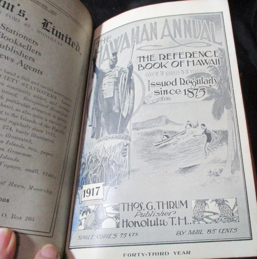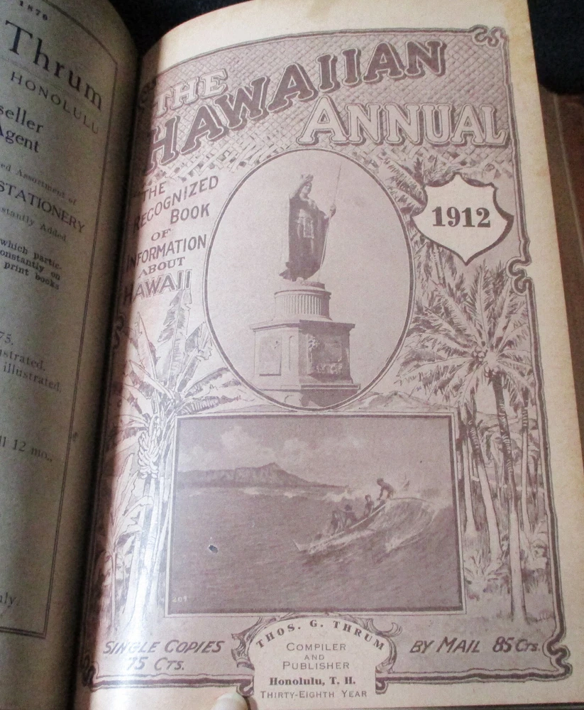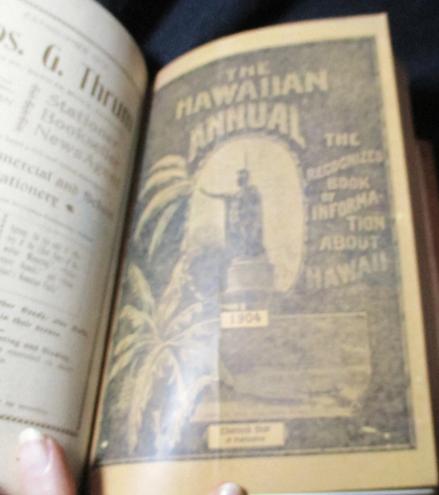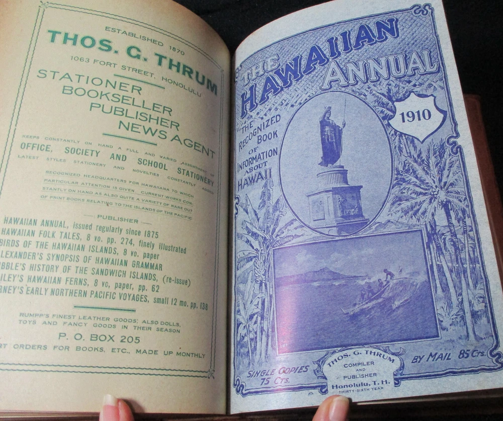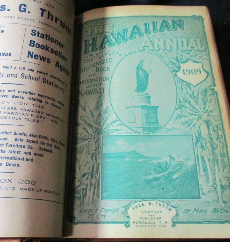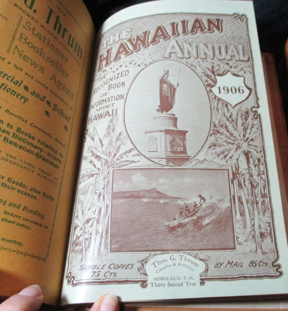 Hawaiian Almanac and Annual Set 1901-1921 Leather Bound 21 Issues RARE A Handbook of Information on Matters Relating the the Hawaiian Islands, Original and Selected, of Value to Merchants, Tourists and Others Thomas G. Thrum, Compiler and Publisher Fold-out map and tables A number of adverts in a book primarily of statistics of the time A number of photos included Includes topics: Hawaiian silver coin - Plantations - Land values - Geology - Hawaiian fish stories and superstitions - Ku-ula the Fish God - Moana Hotel - Railroad - Steamers - Postal service - Taxes - Imports and exports - Census - Registered Vesseals - list of birds - First display of Hawaiian flag in Europe - Wireless telegraphy - Calabashes - Laws passed each year - Ancient farming - Kilauea volcano - Wahiawa ditch - Kahoolawe - Awa - Numerous stories and legends of Hawaii and articles - Waialua - Rock carvings - Kapiolani Park - Sandalwood trade - Algae collecting - Irrigation - Lahainaluna - Mamalahola ancient Hawaiian law - Heiau and temples - Pa'u riders -Wizard stones - Development of Wahiawa - Lava trees and lava flows - Wainiha electric power plant - Nuuanu - Journals and Logs - Mission printing press - Notable visitors - Punahou - College of Hawaii - halley's comets - Hawaii at Seattle Exposition - Portuguese in Hawaii - John Young - Kalakaua dynasty tomb - Hamakua ditch - Ancient religious beliefs and ceremonies - Cook's monument at Kealakekua - Mid_pacific Institute - Pineapple - Rice - Sugar - Cotton - Tobacco - Hudson Bay Agency in Honolulu - Kukaniloko, famed birthplace of alii's - Nat Day - Honolulu's German colony of the fifties -Hilo development - Water rights - Rulers of Hawaii - Moanalua Gardens - Ancient Hawaiian music - Defeat of Kamehameha's army - Kauai's Historical Society - Charles Reed Bishop - Kawaiahao - Corals of Kaneohe Bay - Waiahole Tunnel Project - Kamehameha Day observances - Hawaii in War Time - Red Cross - Queen Liliuokalani lying in state - Hana - Castle and Dillingham - Waikiki Beach project - Opening of Pearl Harbor Drydock - Hawaii's War Memorial - University of Hawaii - Fighting leprosy - Hina's of Hawaiian Folklore - Menehunes Each volume 51/2" x 8 1/2" with varying thicknesses, largest being 2 1/2" 2 volumes have one cover detached, text blocks intact but for one with title page and free endpaper, fly detached but present, foxing inside covers while majority of text is bright and clean; there is some insect damage to one cover and a few pages (does not affect readability), some flaking of top or bottom spine on 2 volumes, two pages have a light blue haze of ink? in a small area, bumped corners.