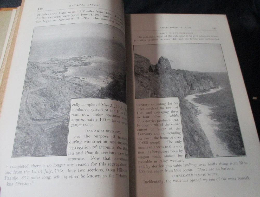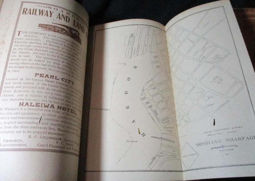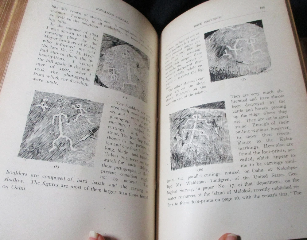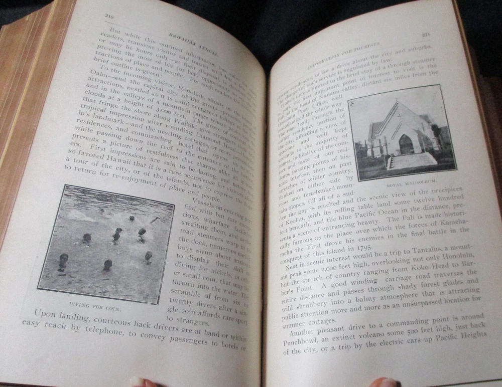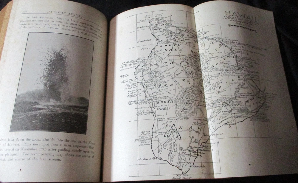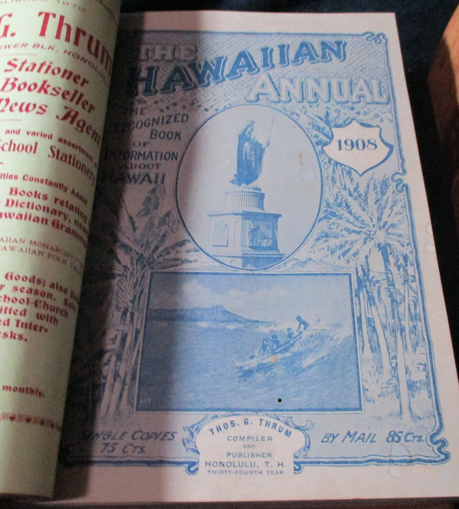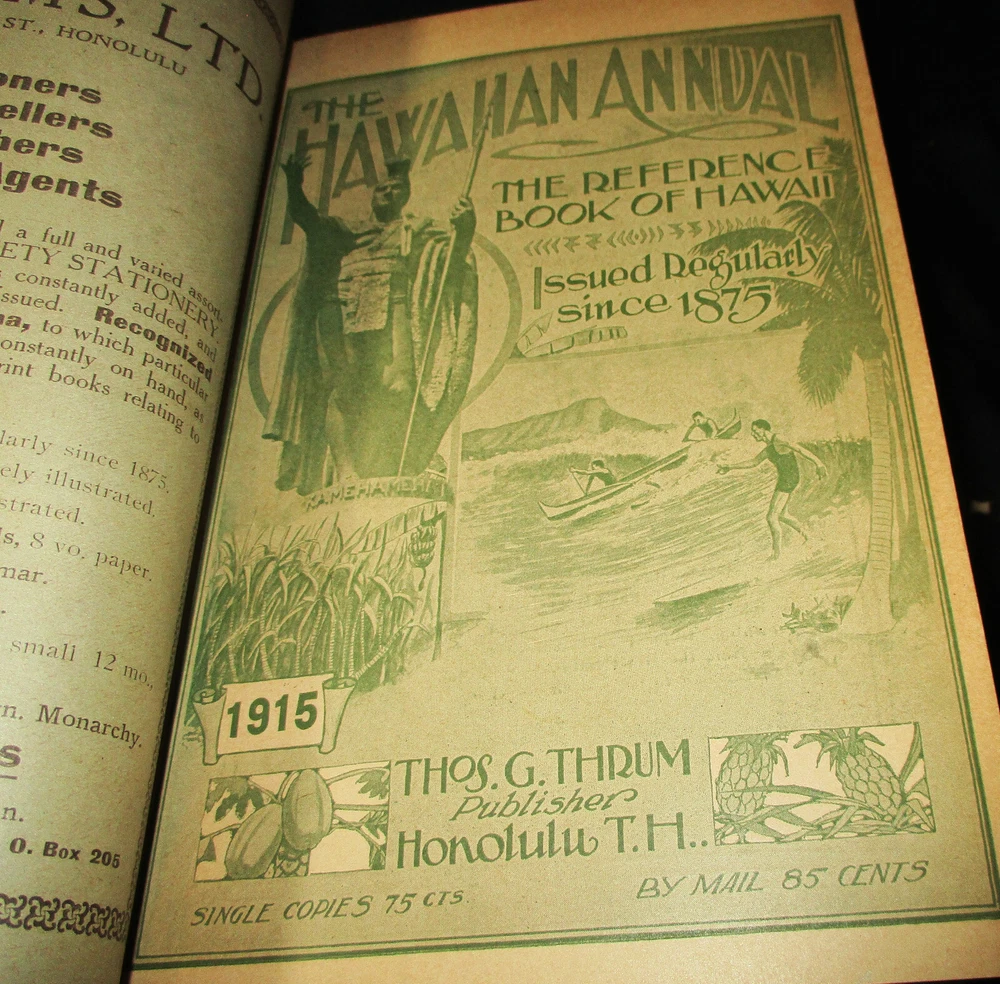 Hawaiian Almanac and Annual Set 1901-1921 Leather Bound 21 Issues RARE A Handbook of Information on Matters Relating the the Hawaiian Islands, Original and Selected, of Value to Merchants, Tourists and Others Thomas G. Thrum, Compiler and Publisher Fold-out map and tables A number of adverts in a book primarily of statistics of the time A number of photos included Includes topics: Hawaiian silver coin - Plantations - Land values - Geology - Hawaiian fish stories and superstitions - Ku-ula the Fish God - Moana Hotel - Railroad - Steamers - Postal service - Taxes - Imports and exports - Census - Registered Vesseals - list of birds - First display of Hawaiian flag in Europe - Wireless telegraphy - Calabashes - Laws passed each year - Ancient farming - Kilauea volcano - Wahiawa ditch - Kahoolawe - Awa - Numerous stories and legends of Hawaii and articles - Waialua - Rock carvings - Kapiolani Park - Sandalwood trade - Algae collecting - Irrigation - Lahainaluna - Mamalahola ancient Hawaiian law - Heiau and temples - Pa'u riders -Wizard stones - Development of Wahiawa - Lava trees and lava flows - Wainiha electric power plant - Nuuanu - Journals and Logs - Mission printing press - Notable visitors - Punahou - College of Hawaii - halley's comets - Hawaii at Seattle Exposition - Portuguese in Hawaii - John Young - Kalakaua dynasty tomb - Hamakua ditch - Ancient religious beliefs and ceremonies - Cook's monument at Kealakekua - Mid_pacific Institute - Pineapple - Rice - Sugar - Cotton - Tobacco - Hudson Bay Agency in Honolulu - Kukaniloko, famed birthplace of alii's - Nat Day - Honolulu's German colony of the fifties -Hilo development - Water rights - Rulers of Hawaii - Moanalua Gardens - Ancient Hawaiian music - Defeat of Kamehameha's army - Kauai's Historical Society - Charles Reed Bishop - Kawaiahao - Corals of Kaneohe Bay - Waiahole Tunnel Project - Kamehameha Day observances - Hawaii in War Time - Red Cross - Queen Liliuokalani lying in state - Hana - Castle and Dillingham - Waikiki Beach project - Opening of Pearl Harbor Drydock - Hawaii's War Memorial - University of Hawaii - Fighting leprosy - Hina's of Hawaiian Folklore - Menehunes Each volume 51/2" x 8 1/2" with varying thicknesses, largest being 2 1/2" 2 volumes have one cover detached, text blocks intact but for one with title page and free endpaper, fly detached but present, foxing inside covers while majority of text is bright and clean; there is some insect damage to one cover and a few pages (does not affect readability), some flaking of top or bottom spine on 2 volumes, two pages have a light blue haze of ink? in a small area, bumped corners.