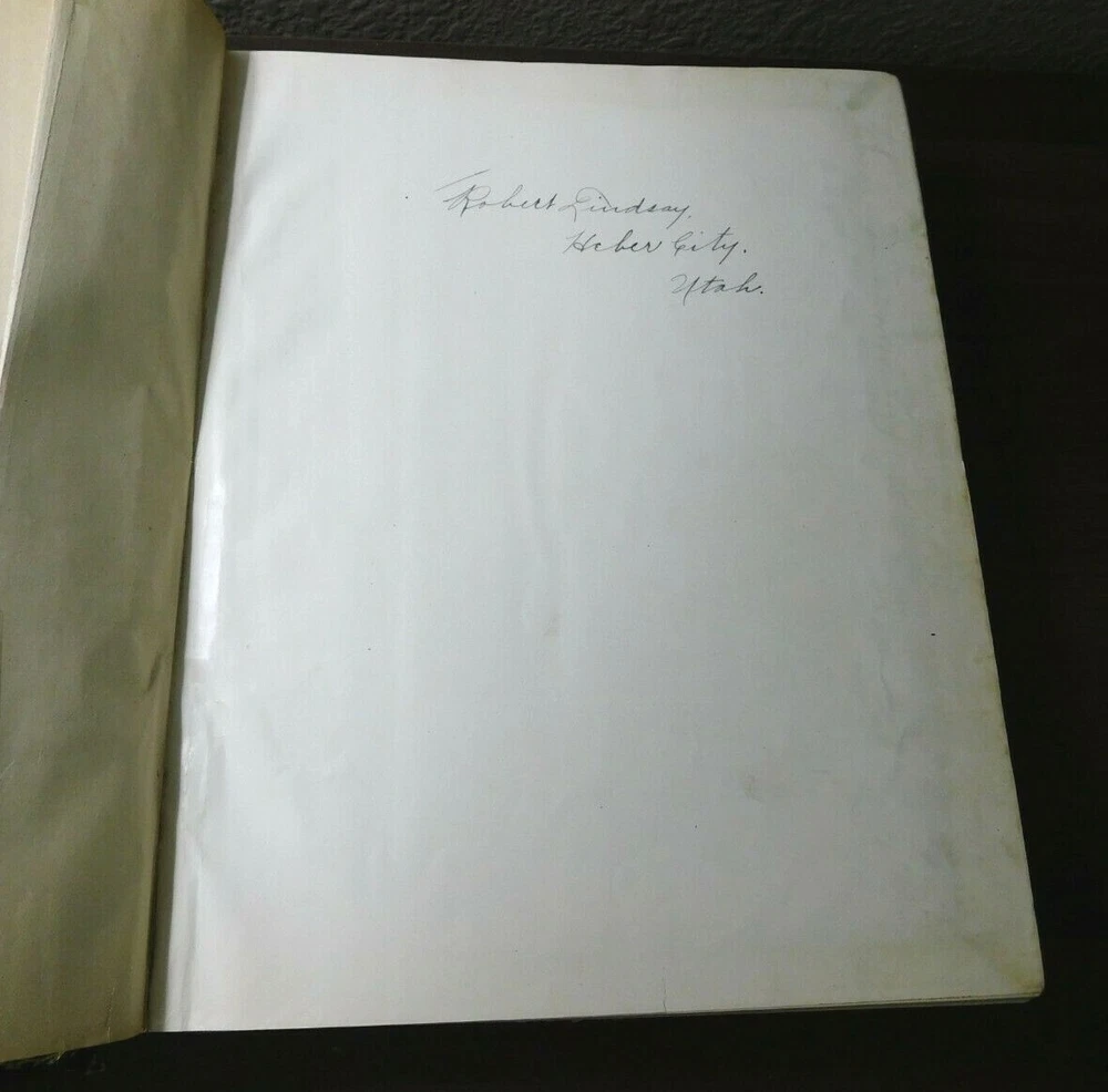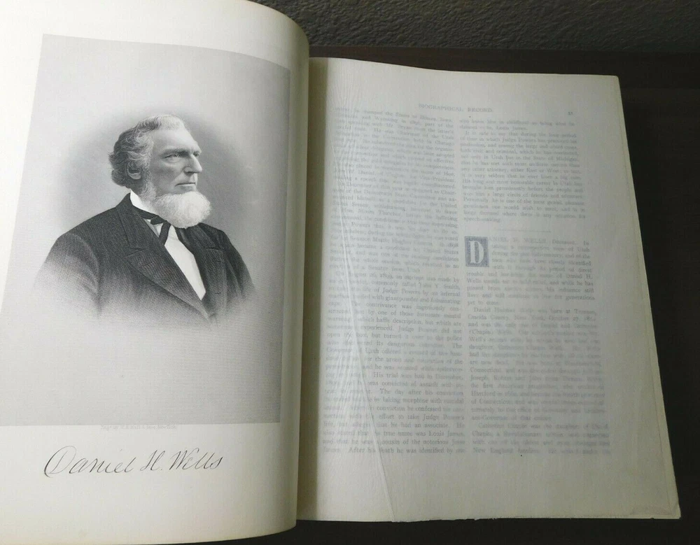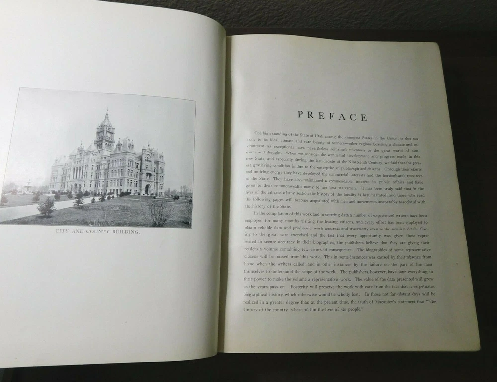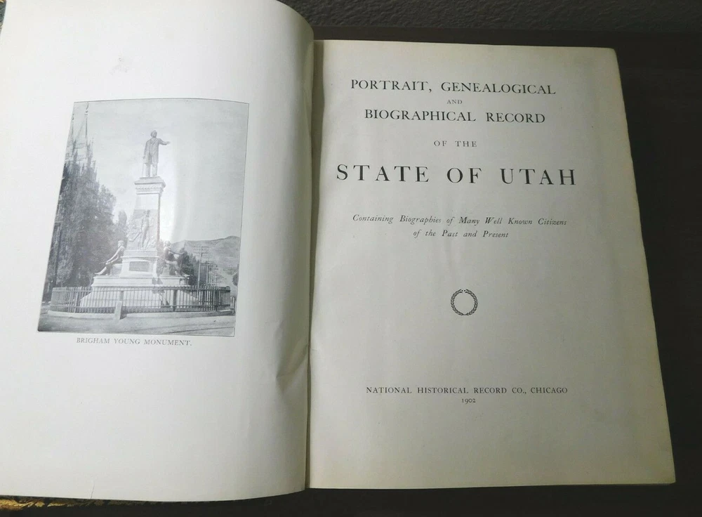 PORTRAIT, GENEALOGICAL AND BIOGRAPHICAL RECORD OF THE STATE OF UTAH Containing Biographies of Many Well Known Citizens of the Past and Present National Historical Record Co., Chicago 1902 Measures 9" x 11 1/2" and is 499 pages Condition: The hardback leather cover has bright gold gilt lettering on the front board and spine. The leather has light over all rubbing and wear including, chipping to the bottom corners and spine ends. The binding is in very good condition. The gold gilt front fly page is creased and torn, the back gold gilt fly page is missing half the page. It has a name written in pen on the white front fly page "Robert Lindsay Heber City, Utah". The pages are in very good condition, no noticed writing, tears, or creases. SEE MY STORE FOR MORE GREAT ITEMS Please read description carefully and look closely at all pictures. If you have questions or concerns ALWAYS send messages through Ebay messaging and NOT my email address. I am happy to entertain offers but NEVER include shipping in your offer price. Shipping cost is always as stated in item listing. Shipping and Handling Shipping is figured by exact USPS shipping cost, delivery confirmation cost, and $2.00 packaging and handling fee. * I do offer combined shipping based on the weight of the books. To receive the shipping discount items MUST be paid for together. This is an Ebay rule, not mine . To do this, please place items in your Ebay cart and then you will be invoiced for all items together * If item is extremely large or needs special attention the packaging and handling fee might be more, this is very rare!
