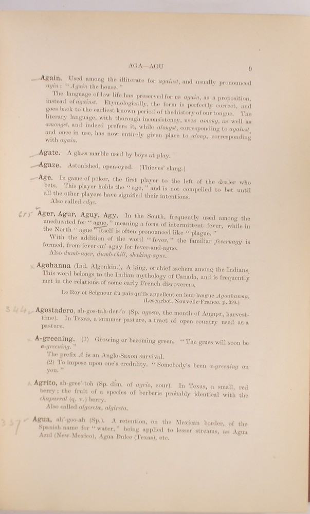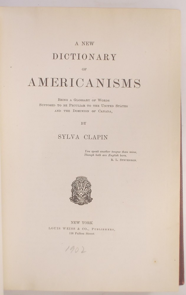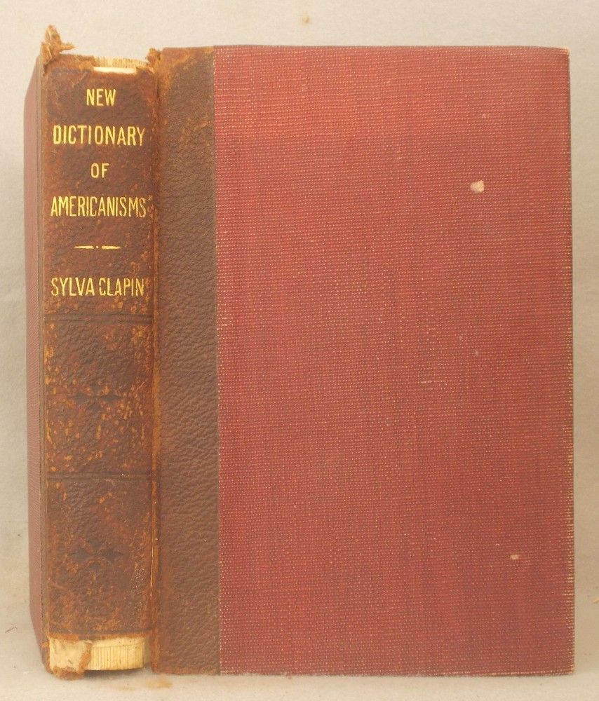 Clapin, Sylva. A New Dictionary of Americanisms: Being a Glossary of Words Supposed to be Peculiar to the United States and the Dominion of Canada. NY : Louis Weiss & Co., 1902. Quarter Leather: The leather is worn and scuffed, the cover is nearly detached. Contents are in good condition with many words marked with a small check mark or number in the margin.