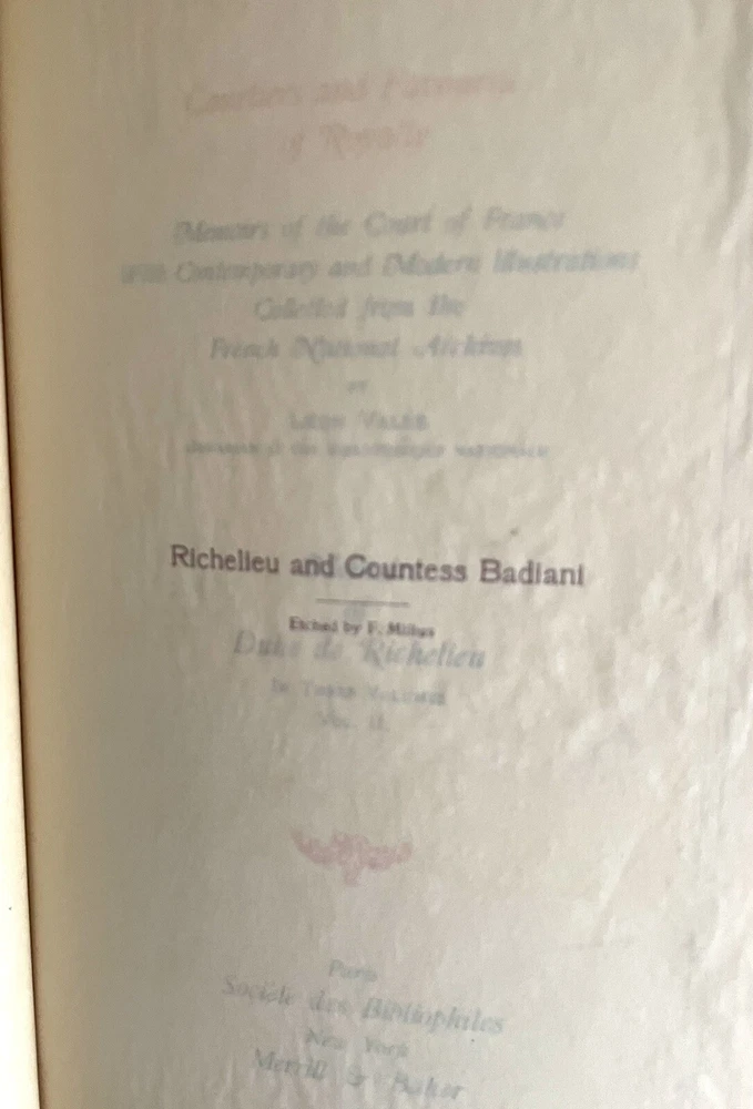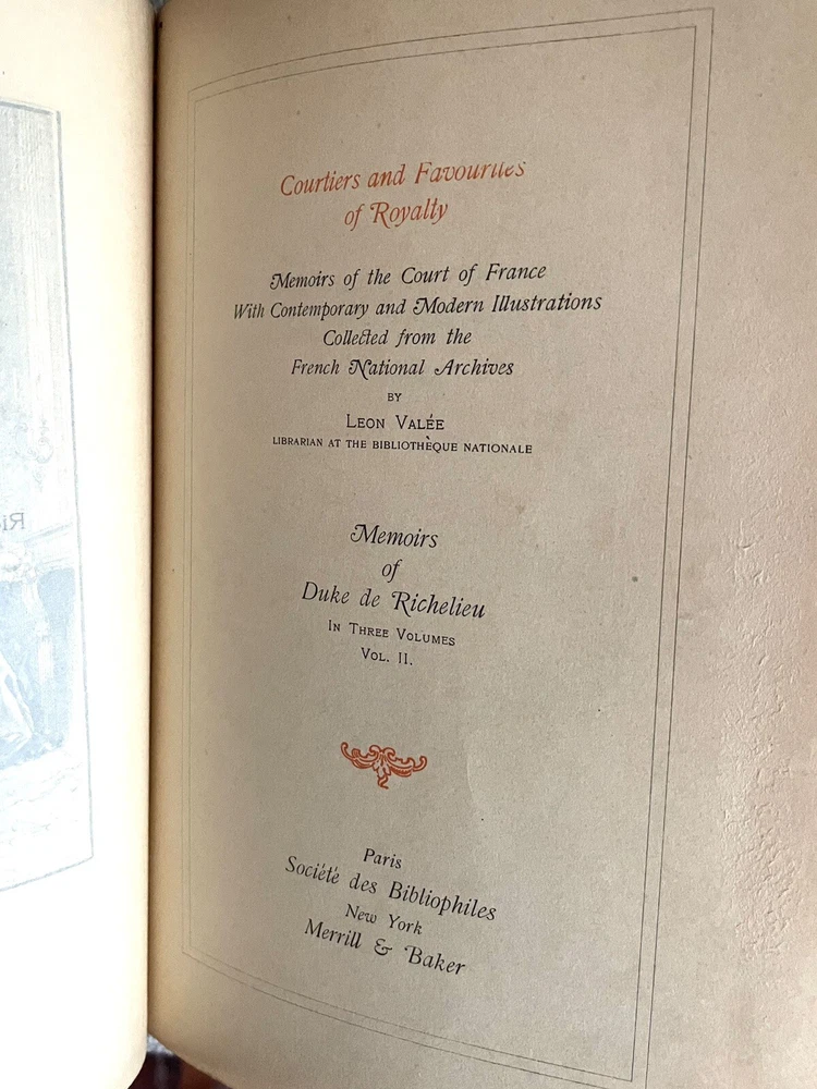 This is a rare and exquisite book titled "Courtiers & Favourites of Royalty Duke De Richelieu Volume2 Number 41/1k" written by Leon Valée. It is a luxury collector's edition with numbered pages and color illustrations. The book was printed in 1903 by Société Des Bibliophiles in Paris, France, and has gold gilded top page edges. There is some shelf wear and minor foxing but pages and illustrations are clean. The book is a 1st edition with color plates and memoirs of the favorite courtiers and politicians of royalty. It is a perfect addition to any collection of antiquarian and collectible books. The book is written in English and has special attributes such as being a limited edition and a biography & autobiography subject.