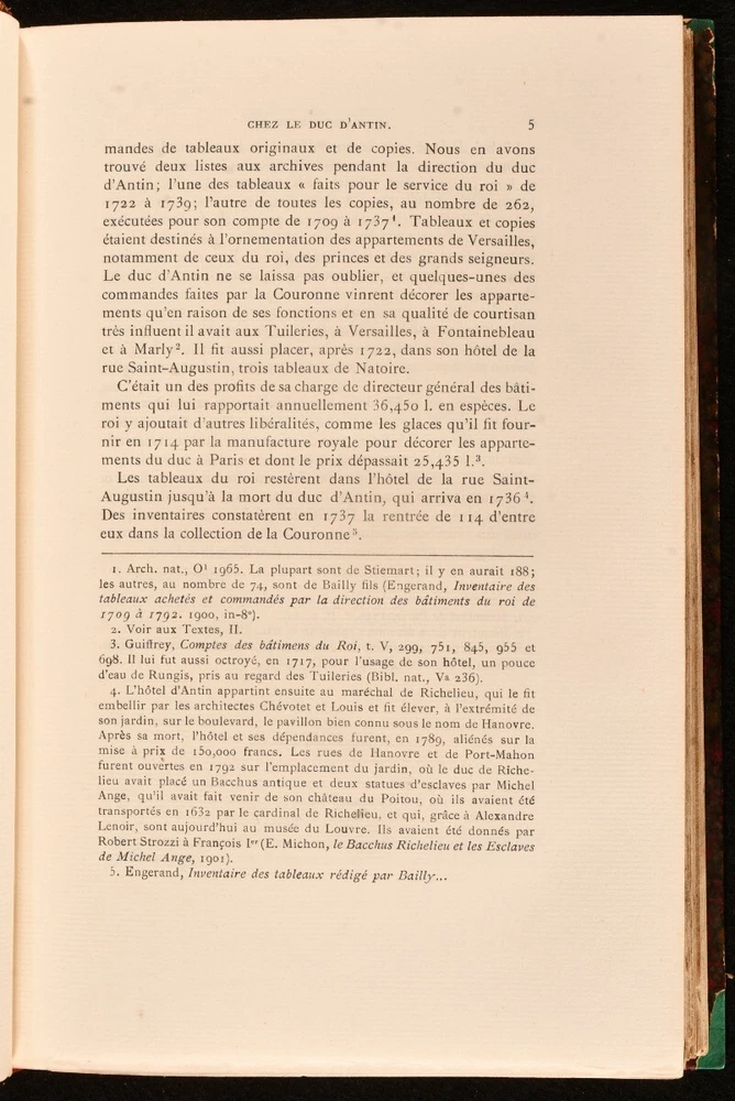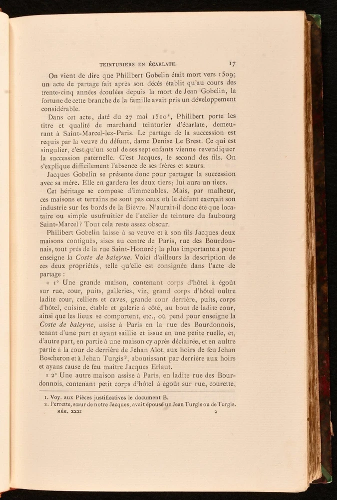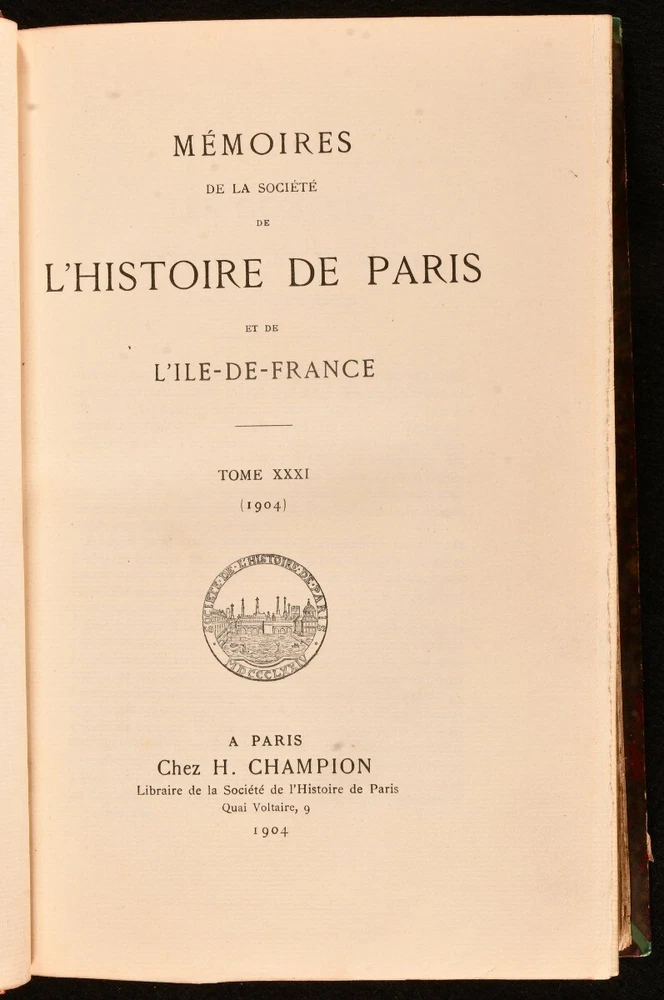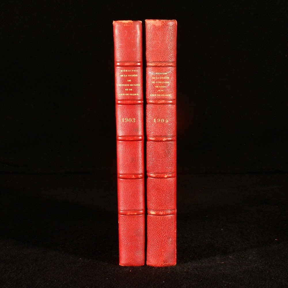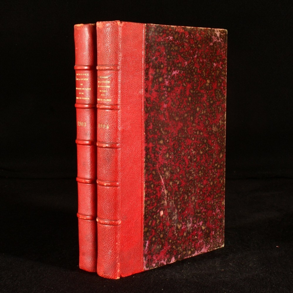 Click here to see our other books! Memoires de la Societe de L'Histoire de Paris et de L'ile-de-France Not Stated 1903-1904 Chez H. Champion : Paris 9.5" by 6" [4], 308, [1]; [4], 309, [1]pp SUMMARY Two volumes of Memoires de la Societe de L'Histoire de Paris et de L'ile-de-France with folding plates. First Edition,Folding Plates,Leather Binding Overall Condition: Very Good This book weighs 2 KG when packed UK Postage: £ 3.99 US Postage: £ 29.99 EU Postage : £ 21.99 European Postage: £ 23.99 Asia Postage: £ 37.99 Worldwide Postage: £ 38.99 DESCRIPTION First editions of these volumes. In the original French. Volumes XXX and XXXI of Memoires de la Societe de L'Histoire de Paris et de L'ile-de-France. These volumes detail the history of Paris and the Island of France. Volume XXX contains a study on the history of the Abbey of Sainte-Genevieve in Paris until the end of the 11th century, the family of Etienne Marcel and Paris in the 14th Century. With one folding plate. Volume XXXI contains essays on Military Paris in the seventeenth century, Les Gobelins, scarlet dyers in the Faubourg Saint-Marcel and President de Lamoignon. With seven folding plates. Collated, complete. Some pages remain unopened. CONDITION Rebound in quarter leather with marbled boards. Externally, smart with some rubbing to the extremities and spines and light marks to the boards. Internally, firmly bound with bright and clean pages. Overall Condition: Very Good GLOSSARY OF TERMS Overall Condition (Dustwrapper condition rating is shown after that for the book itself, where a dustwrapper is present) Fine - Very well preserved copy showing very little wear Very Good Indeed - Only one or two minor faults, really a very attractive copy Very Good - Quite a wide term meaning no major faults but probably several smaller ones often expected given the age of the book, but still a respectable copy Good - Meaning not very good. Some more serious faults as will be described in the condition report under 'condition' Good Only - Meaning one or more faults that could really do with repair Fair - As with good only above but with other faults leaving a compromised copy even after repair Poor - Really bad and possibly seriously incomplete. We only sell books in this condition where their rarity or value makes them attractive none the less. Major defects will be described. GUARANTEE We offer a full money back guarantee on our descriptions. Please ask for details and conditions. We prefer PAYPAL. If you pay via PAYPAL we will post the item off the same or the next working day with the postage you have selected. Please note we cannot accept USD cheques