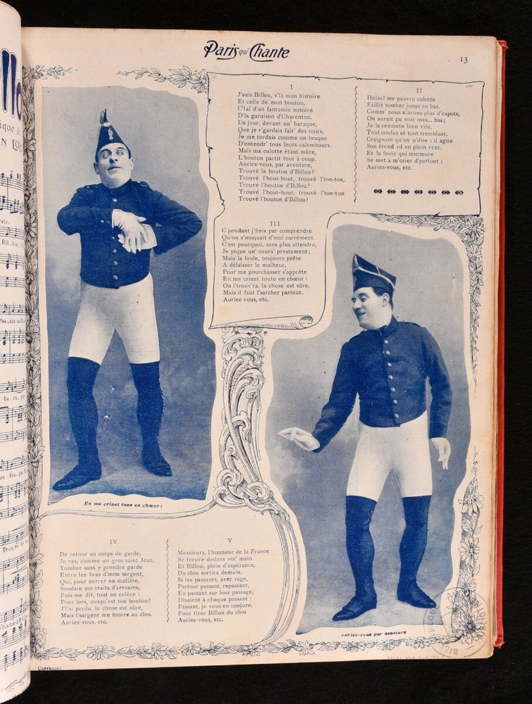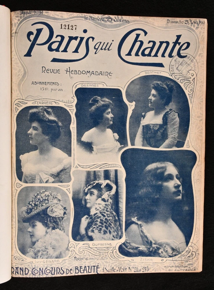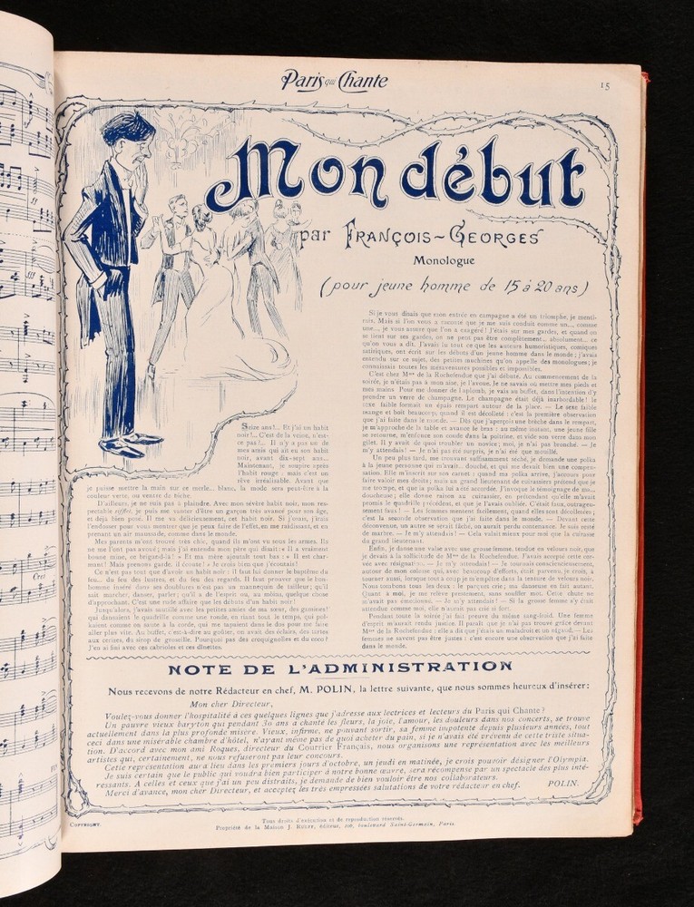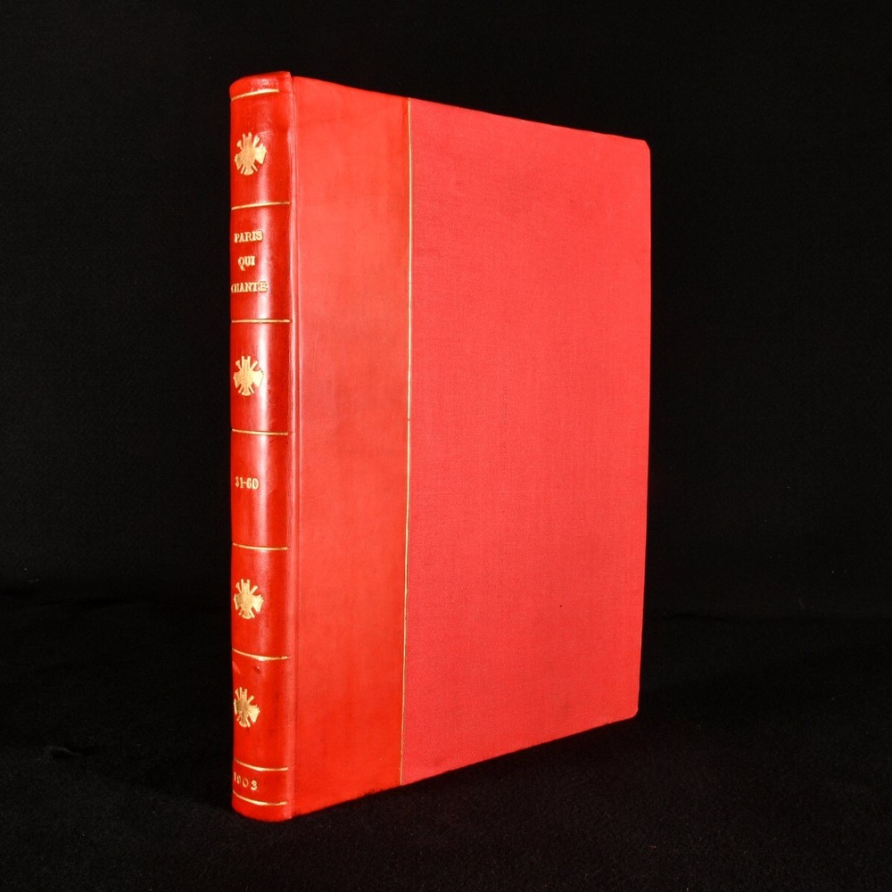 Click here to see our other books! Paris Qui Chante No. 31-60 Various 1903-4 Unknown : Paris 12.5" by 9.5" SUMMARY Twenty-nine issues of this illustrated French weekly magazine of the arts, from August 1903 to March 1904, bound in one volume. Colour Plates,First Edition,Illustrated,Leather Binding,Pleasing Copy,Rebound Overall Condition: Very Good Indeed This book weighs 3 KG when packed UK Postage: £ 3.99 US Postage: £ 36.99 EU Postage : £ 25.99 European Postage: £ 27.99 Asia Postage: £ 47.99 Worldwide Postage: £ 69.99 DESCRIPTION The continuous issues from March 1903 to March 1904 (Nos. 31-60) of Paris qui Chante , an illustrated weekly comprising reviews of concerts, theatre, artistic cabarets, music halls. Including musical sheets of the songs. Fully illustrated in text, including one supplement coloured plate to no. 44. The first edition. A charming publication illustrating Parisian nightlife in the early twentieth century, with insights into the cabarets, cafes, salons, clubs, theatres &c that used to liven the streets of the capital and helped built the city's monumental reputation across the world. Including illustrations and advertisements throughout. CONDITION In a quarter calf binding over cloth covered boards. Externally lovely with minor shelf wear only. Internally, firmly bound. The pages are generally very clean with only a touch of age toning, as usual. Richly illustrated in text, with one full page plate in colour to vol. 44. Overall Condition: Very Good Indeed GLOSSARY OF TERMS Overall Condition (Dustwrapper condition rating is shown after that for the book itself, where a dustwrapper is present) Fine - Very well preserved copy showing very little wear Very Good Indeed - Only one or two minor faults, really a very attractive copy Very Good - Quite a wide term meaning no major faults but probably several smaller ones often expected given the age of the book, but still a respectable copy Good - Meaning not very good. Some more serious faults as will be described in the condition report under 'condition' Good Only - Meaning one or more faults that could really do with repair Fair - As with good only above but with other faults leaving a compromised copy even after repair Poor - Really bad and possibly seriously incomplete. We only sell books in this condition where their rarity or value makes them attractive none the less. Major defects will be described. GUARANTEE We offer a full money back guarantee on our descriptions. Please ask for details and conditions. We prefer PAYPAL. If you pay via PAYPAL we will post the item off the same or the next working day with the postage you have selected. Please note we cannot accept USD cheques