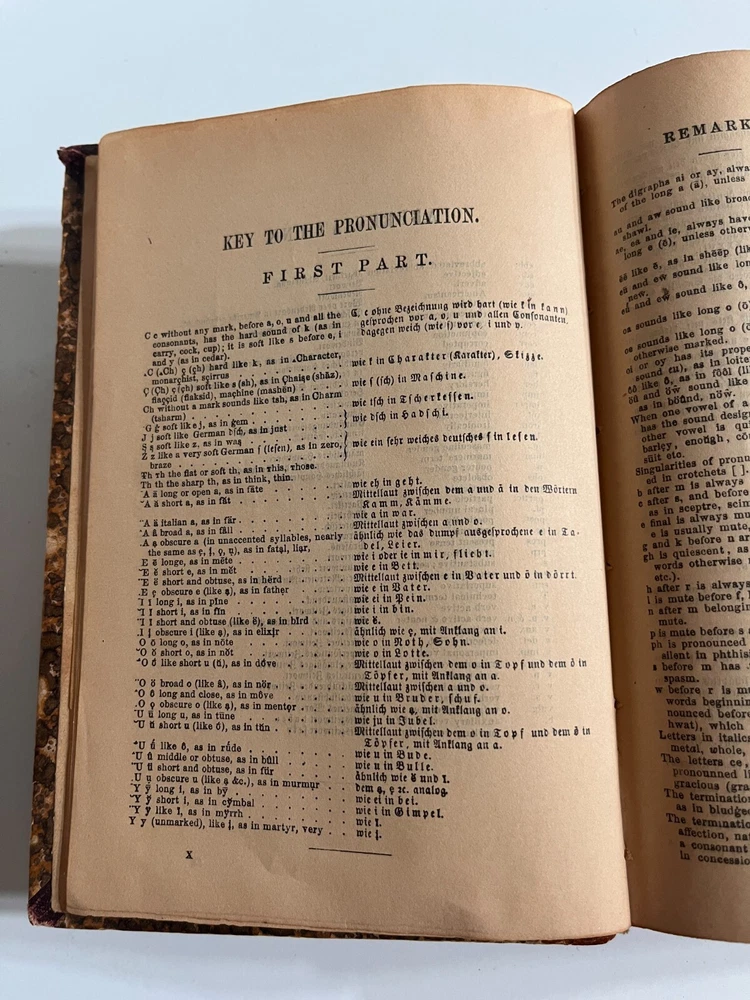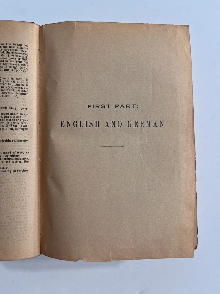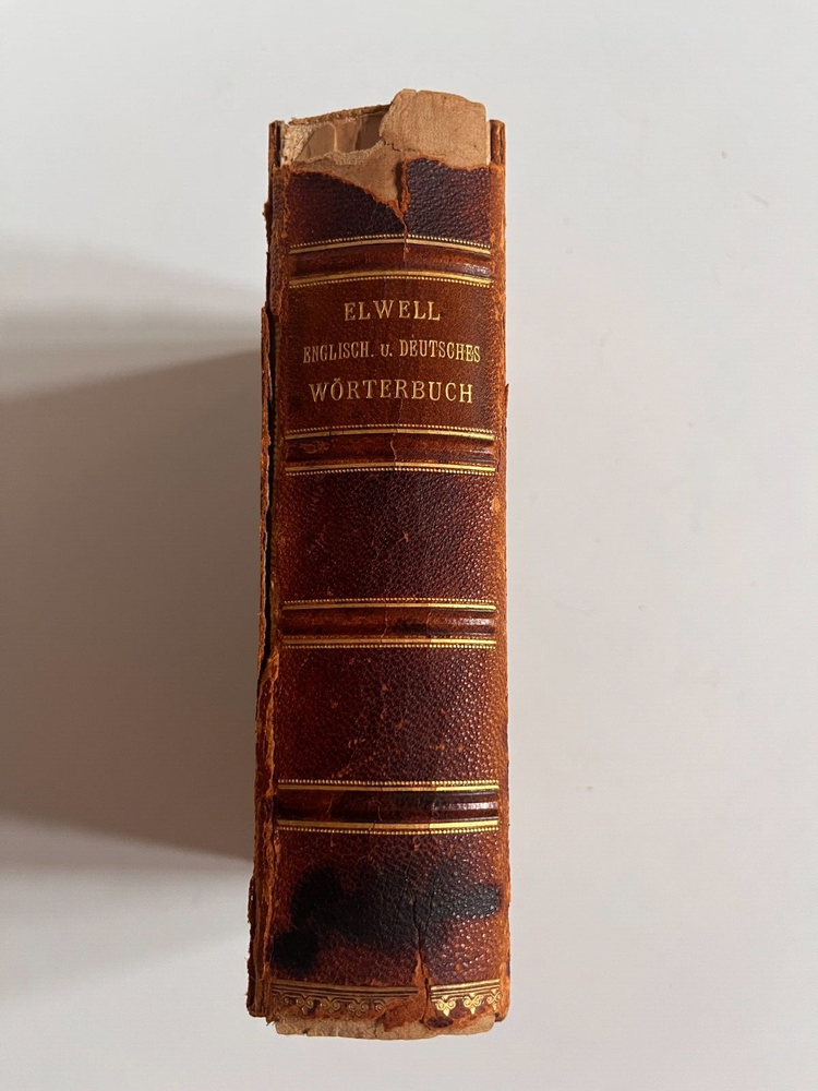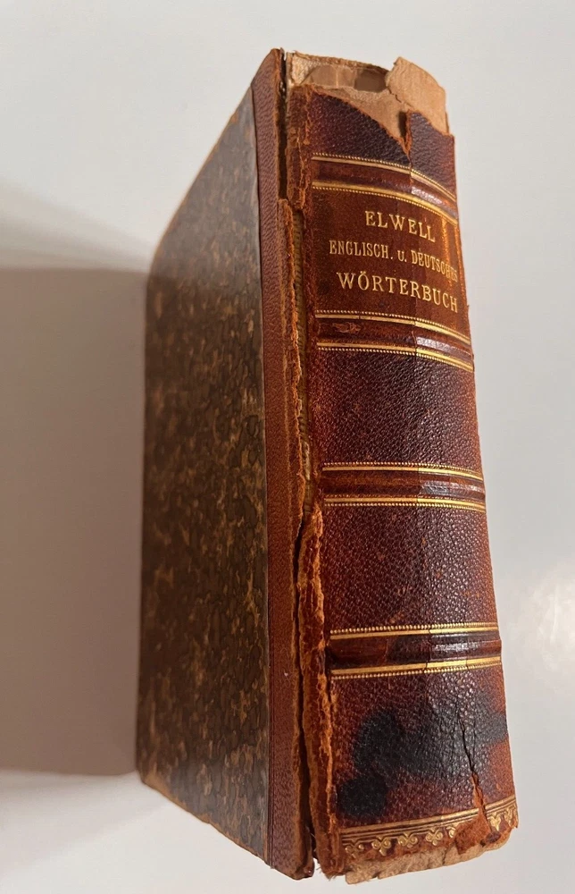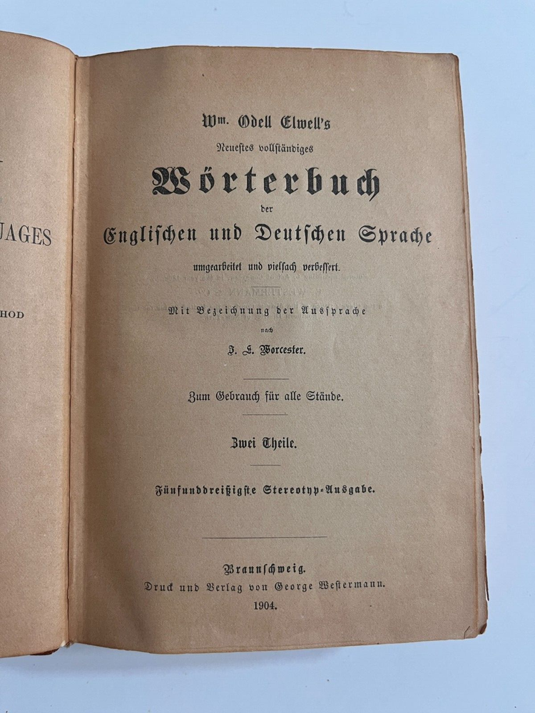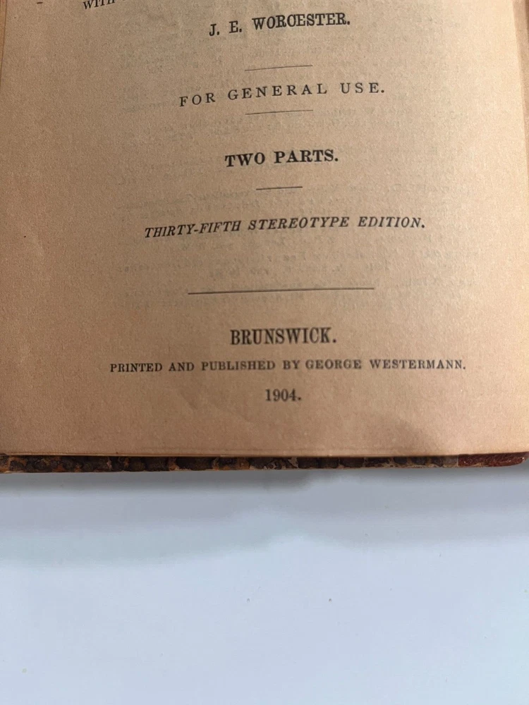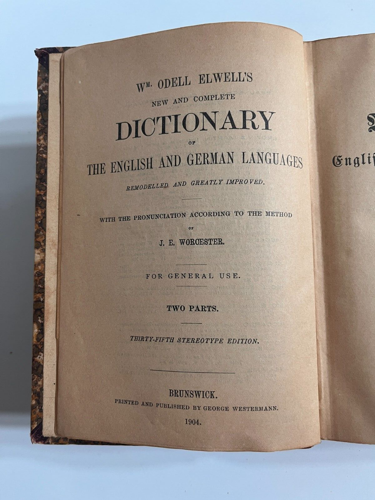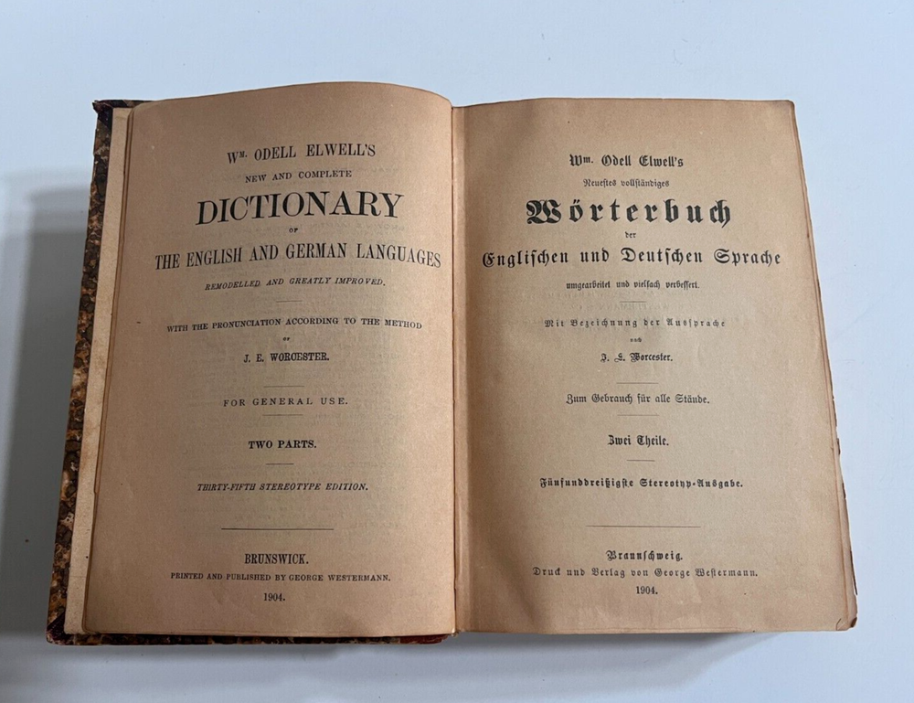 This is a rare and collectible book titled "Ewell's Dictionary of English and German Languages" published in 1904. The leather bound book has gold lettering on the spine and marbled hardback covers. It has both translations - English to German & German to English. The dictionary is a must-have for collectors and enthusiasts alike, featuring English and German language translations with pronunciation guides. The book has a rich history, printed in Brunswick, Germany and authored by Wm. Odell Ewell. It is a valuable addition to any reference collection and a testament to the quality of language resources in early 20th century Europe! ~ 7" X 5" 860 pages ~ (see all photos and item condition description) PLEASE ASK ANY QUESTIONS YOU MIGHT HAVE.