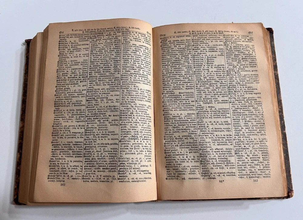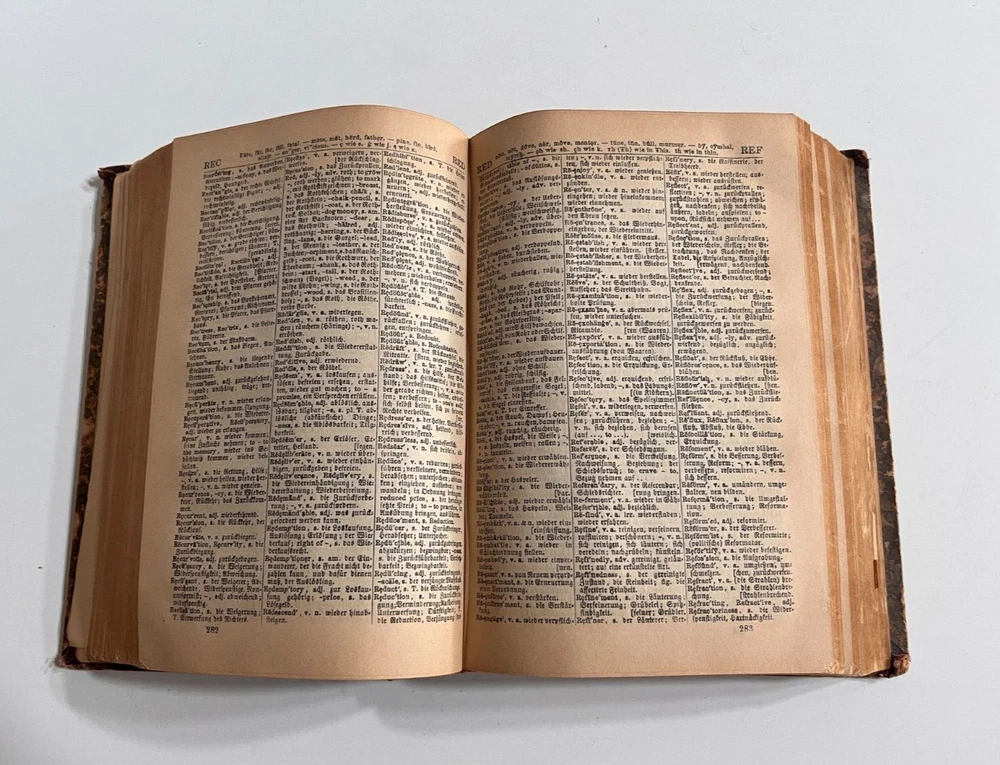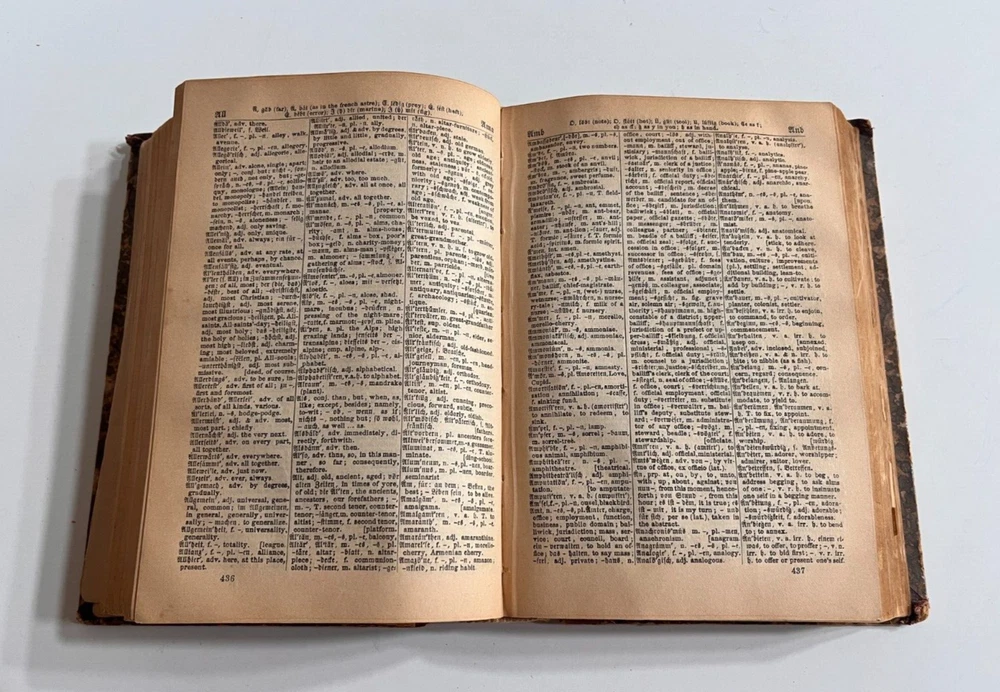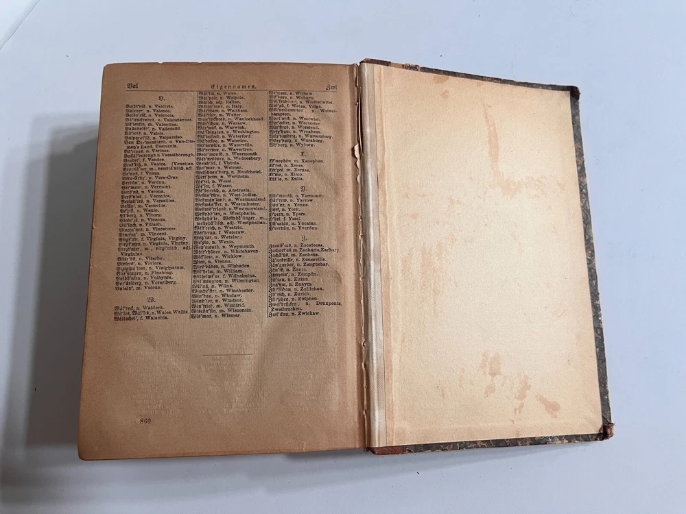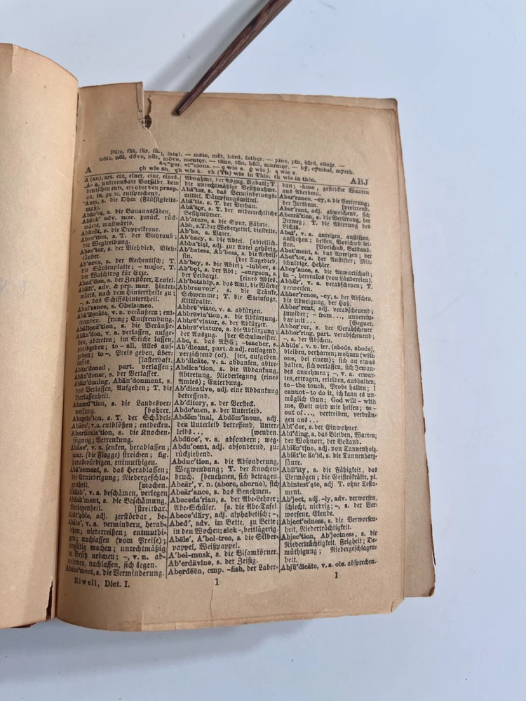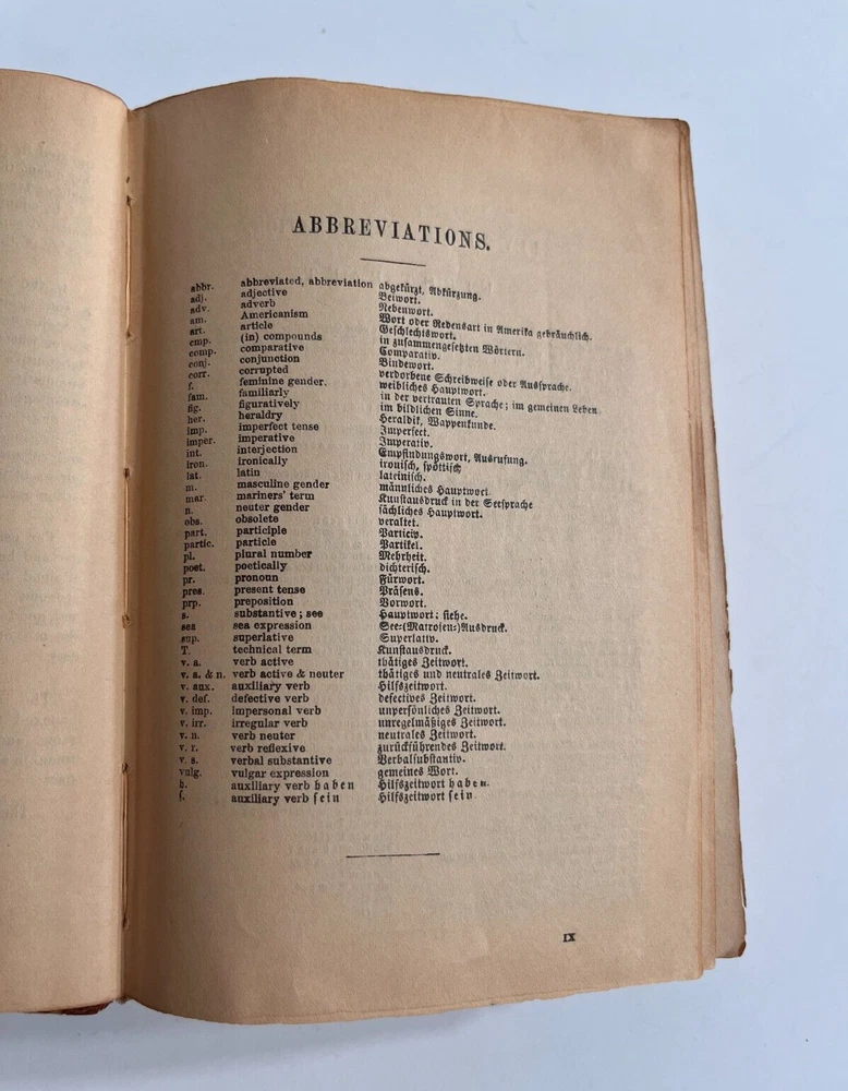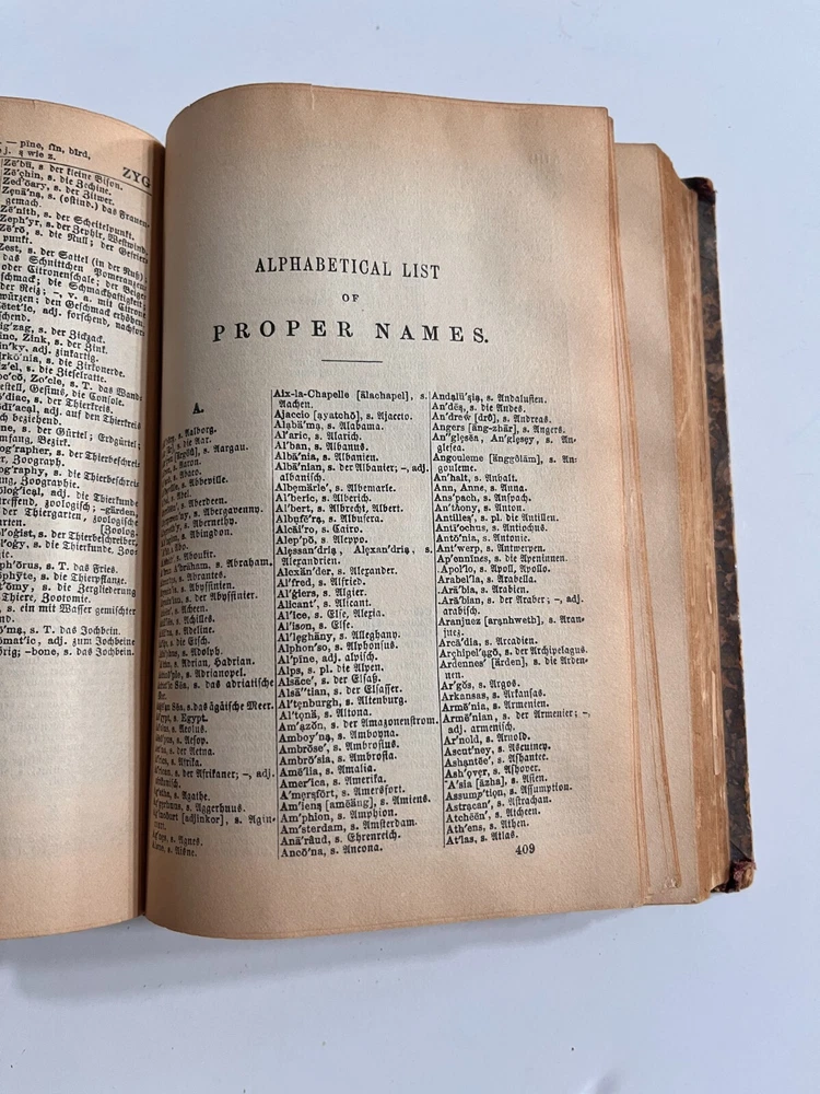 This is a rare and collectible book titled "Ewell's Dictionary of English and German Languages" published in 1904. The leather bound book has gold lettering on the spine and marbled hardback covers. It has both translations - English to German & German to English. The dictionary is a must-have for collectors and enthusiasts alike, featuring English and German language translations with pronunciation guides. The book has a rich history, printed in Brunswick, Germany and authored by Wm. Odell Ewell. It is a valuable addition to any reference collection and a testament to the quality of language resources in early 20th century Europe! ~ 7" X 5" 860 pages ~ (see all photos and item condition description) PLEASE ASK ANY QUESTIONS YOU MIGHT HAVE.