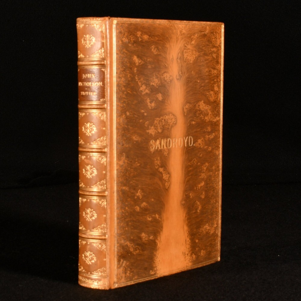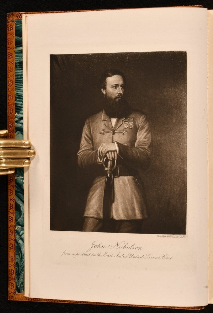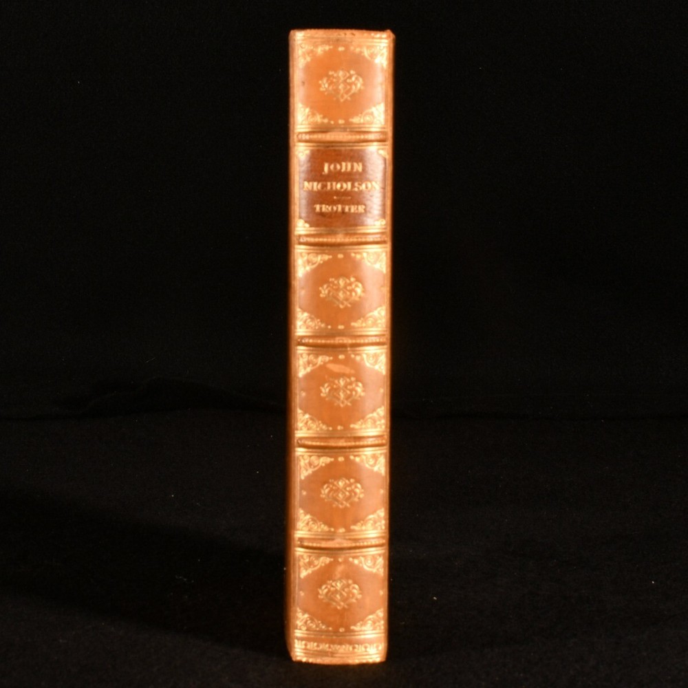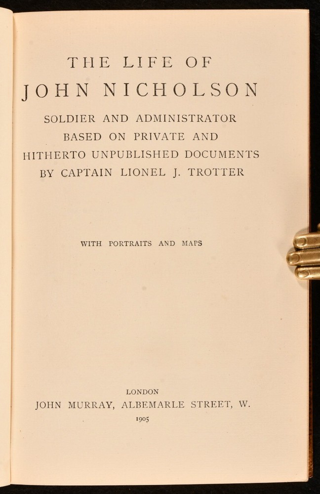 Click here to see our other books! The Life of John Nicholson Soldier and Administrator Captain Lionel J. Trotter 1905 John Murray : London 7.5" by 5" x, [2], 333pp SUMMARY A wonderfully bound copy of a fascinating account of the soldier John Nicholson. Folding Maps,Illustrated,Leather Binding,Prize Binding Overall Condition: Fine This book weighs 0.5 KG when packed UK Postage: £ 3.99 US Postage: £ 15.99 EU Postage : £ 13.99 European Postage: £ 14.99 Asia Postage: £ 18.99 Worldwide Postage: £ 19.99 DESCRIPTION A re-issued copy of this work. Beautifully bound in full calf prize binding for Sandroyd School. This biography of John Nicholson, a soldier and administrator, is based on private documents by Captain Lionel J. Trotter. John Nicholson or 'The Heroic Nicholson was an Anglo-Irish officer in the British Army who rose to prominence during his career in British India and this volume discusses his life and time as a soldier and officer in India. With three folding maps and two plates. Collated, complete. CONDITION In full calf prize binding for Sandroyd. Externally, excellent. Prize bookplate to the front pastedown dated 1906. Internally, firmly bound with bright and clean pages. Overall Condition: Fine GLOSSARY OF TERMS Overall Condition (Dustwrapper condition rating is shown after that for the book itself, where a dustwrapper is present) Fine - Very well preserved copy showing very little wear Very Good Indeed - Only one or two minor faults, really a very attractive copy Very Good - Quite a wide term meaning no major faults but probably several smaller ones often expected given the age of the book, but still a respectable copy Good - Meaning not very good. Some more serious faults as will be described in the condition report under 'condition' Good Only - Meaning one or more faults that could really do with repair Fair - As with good only above but with other faults leaving a compromised copy even after repair Poor - Really bad and possibly seriously incomplete. We only sell books in this condition where their rarity or value makes them attractive none the less. Major defects will be described. GUARANTEE We offer a full money back guarantee on our descriptions. Please ask for details and conditions. We prefer PAYPAL. If you pay via PAYPAL we will post the item off the same or the next working day with the postage you have selected. Please note we cannot accept USD cheques