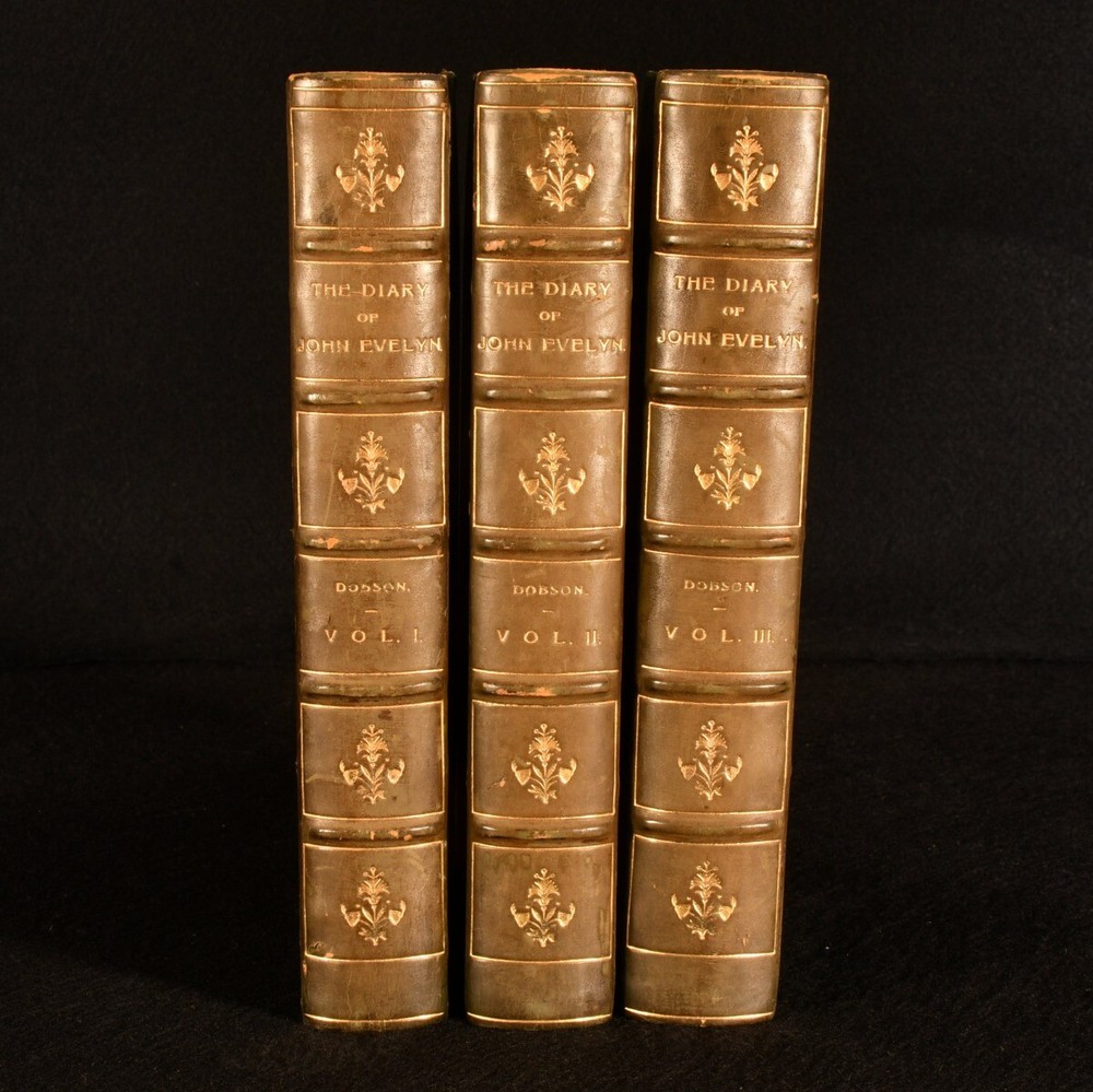 Click here to see our other books! The Diary of John Evelyn John Evelyn; Austin Dobson 1906 Macmillan and Co., Limited : London 9" by 5.5" lxxiv, 355; vi, 398; vi, 479pp. SUMMARY A complete, three volume set of Austin Dobson's compilation of John Evelyn's diaries, smartly bound in half calf. Folding Plates,Illustrated,Leather Binding,Uncommon Overall Condition: Very Good Indeed This book weighs 3 KG when packed UK Postage: £ 3.99 US Postage: £ 36.99 EU Postage : £ 25.99 European Postage: £ 27.99 Asia Postage: £ 47.99 Worldwide Postage: £ 69.99 DESCRIPTION The Dobson Edition. Complete in three volumes. Uniformly bound in a lovely half calf with cloth boards. This work features the diary of John Evelyn, an English writer, gardener, and minor government official who is best known for this diary. Evelyn's diary was extensive, spanning from 1641 to 1697 and covering many historic events such as the execution of Charles I, Oliver Cromwell's rise and death, the Great Plague of London and the Great Fire of London. Edited, with an introduction and notes by English poet and essayist, Austin Dobson. Profusely illustrated throughout, with eighteen plates and a frontispiece to volume I, twenty-four plates and a frontispiece to volume II and fourteen plates and a frontispiece to volume II. Includes maps, portraits and views, some of which are folding. Collated, complete. With the pictorial bookplate of Alexander Stone, a Scottish banker and philanthropist, and the namesake of the Sir Alexander Stone building at Glasgow University. An additional bookplate of Henry T Pearson to the front paste down. CONDITION Bound in half calf with cloth boards. Externally, very smart indeed, with light rubbing to the extremities and spines and the odd mark to boards. Slight fading to the spines. Bookplates to the front paste down and front endpaper. Light spotting to the fore edge. Internally, firmly bound. Pages are generally bright and clean, with the odd spot. Numbered stamp to the front blank. The occasional orn tissue guard. Plate bound to page 97 instead of 113 as stated, in volume III. Overall Condition: Very Good Indeed GLOSSARY OF TERMS Overall Condition (Dustwrapper condition rating is shown after that for the book itself, where a dustwrapper is present) Fine - Very well preserved copy showing very little wear Very Good Indeed - Only one or two minor faults, really a very attractive copy Very Good - Quite a wide term meaning no major faults but probably several smaller ones often expected given the age of the book, but still a respectable copy Good - Meaning not very good. Some more serious faults as will be described in the condition report under 'condition' Good Only - Meaning one or more faults that could really do with repair Fair - As with good only above but with other faults leaving a compromised copy even after repair Poor - Really bad and possibly seriously incomplete. We only sell books in this condition where their rarity or value makes them attractive none the less. Major defects will be described. GUARANTEE We offer a full money back guarantee on our descriptions. Please ask for details and conditions. We prefer PAYPAL. If you pay via PAYPAL we will post the item off the same or the next working day with the postage you have selected. Please note we cannot accept USD cheques