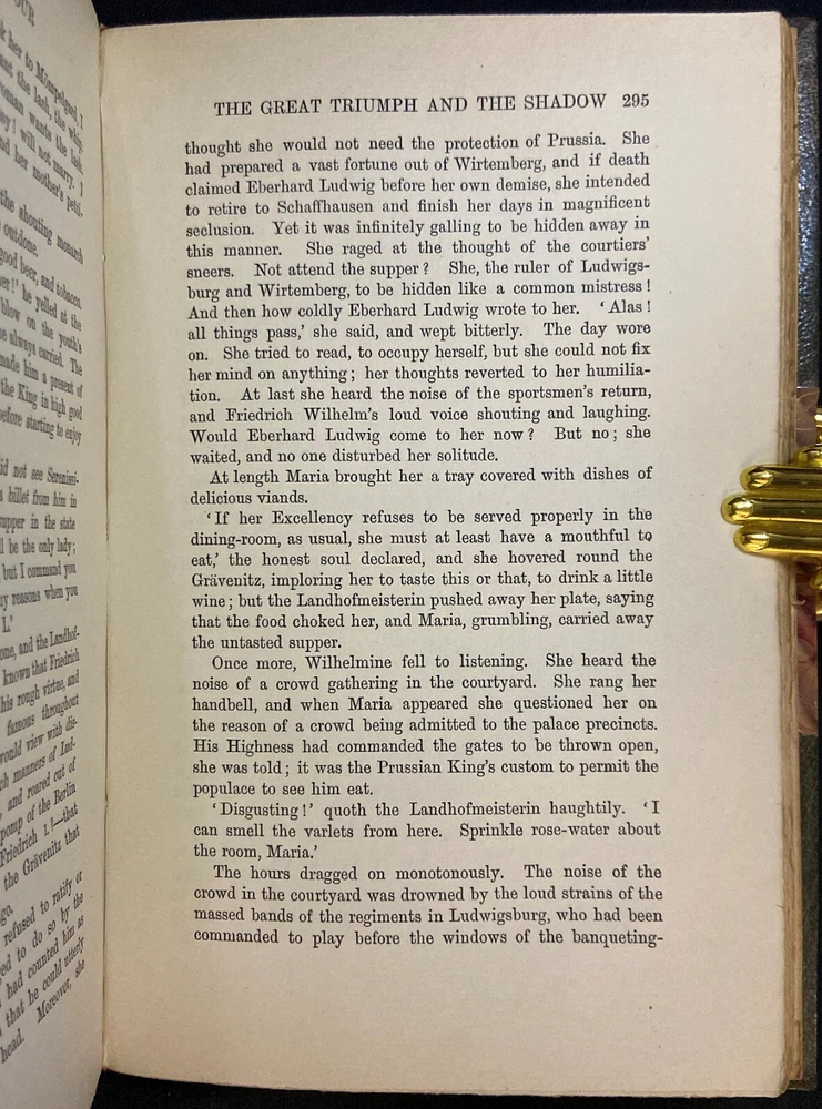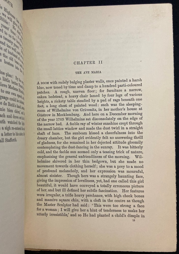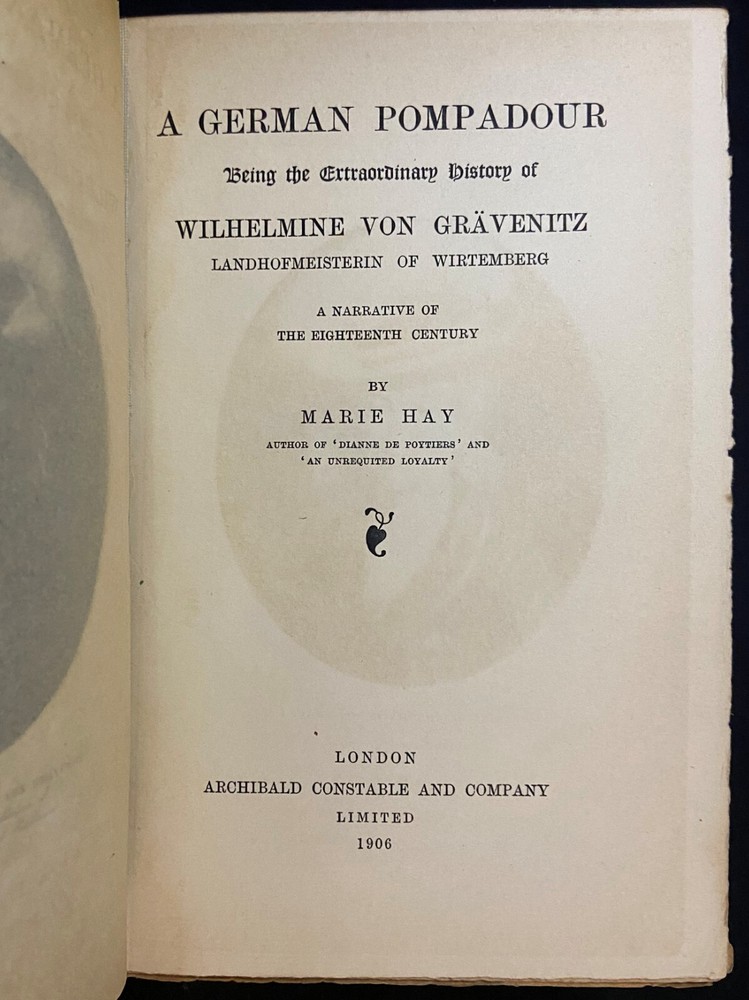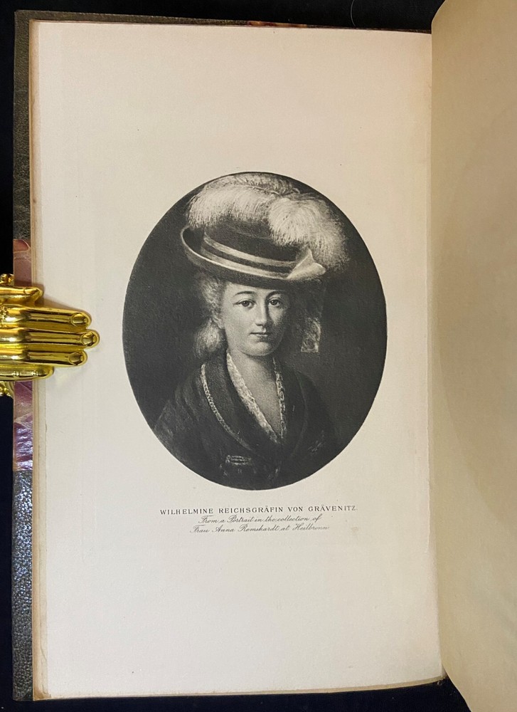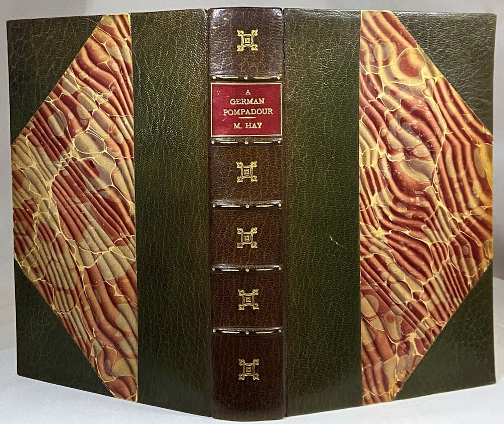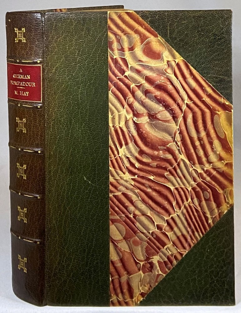 Nice leather bound 1906 copy of "A German Pompadour. Being the Extraordinary History of Wilhelmine von Gravenitz, Landhofmeisterin of Wirtemberg. A Narrative of the Eighteenth Century. " The book is overall in very good condition with just some minor signs of wear and age. The covers only have some light wear. The binding is good and strong. The interior is lightly toned from age but is mostly nice and clean, though there may be the occasional light bit of foxing or grubbiness. Along with that there may be the very occasional page with some other minor imperfection such as tiny chip or tear, creased page corner, minor stain or marking, etc. Generally though, it's a very nice copy. The book measures approximately 9 inches by 6 inches and is 358 pages long with a black and white frontispiece portrait. Please look at the photos to further note the condition.