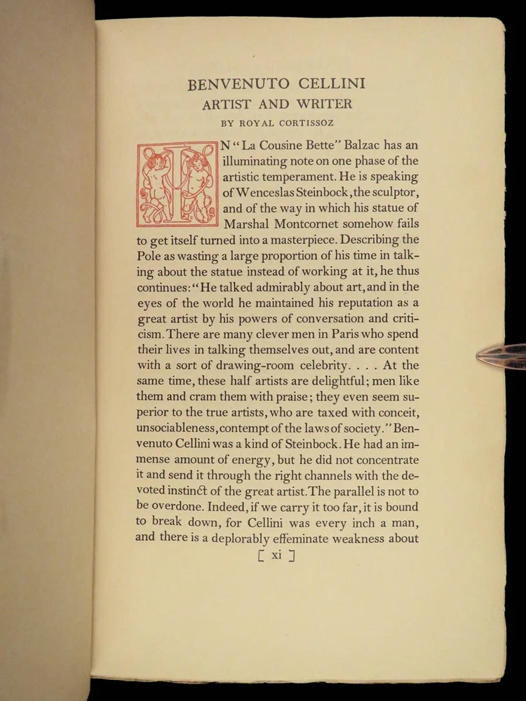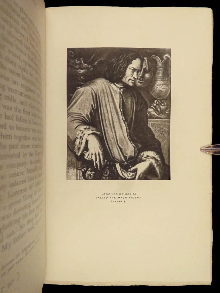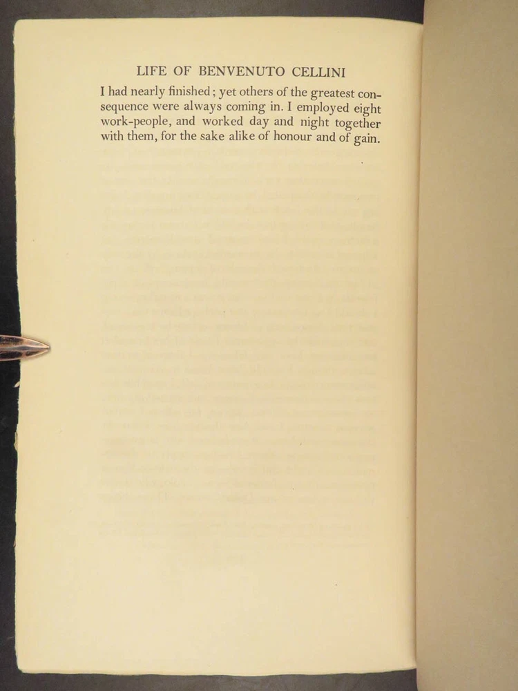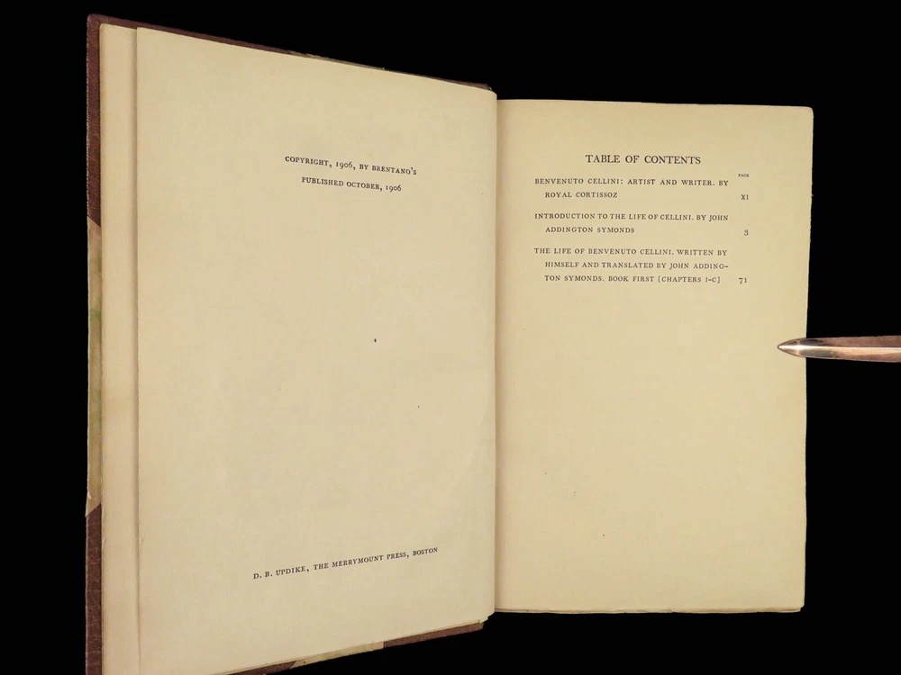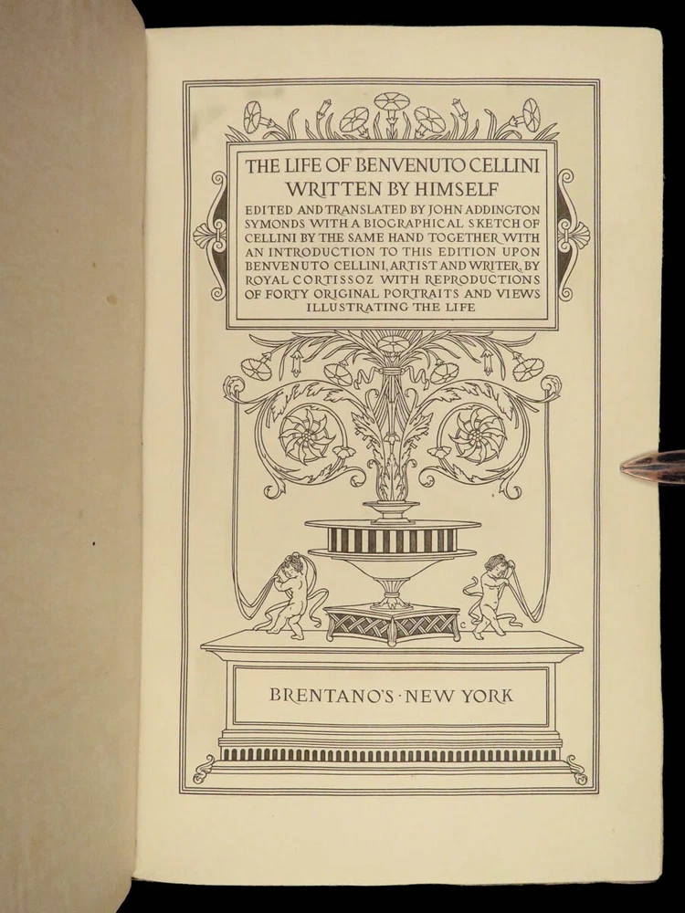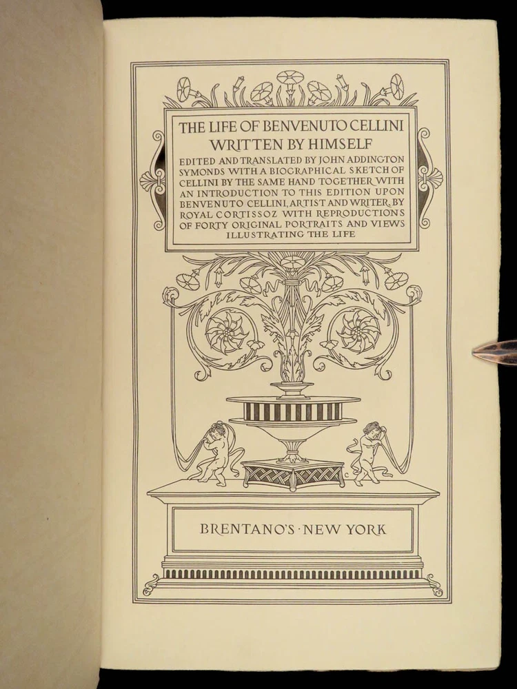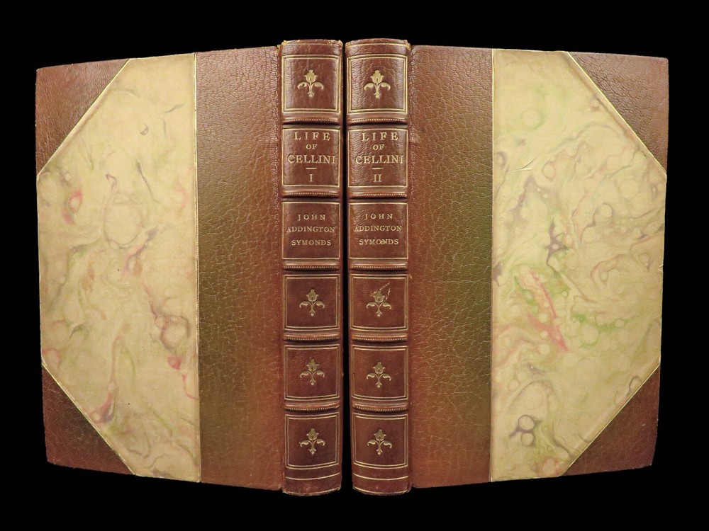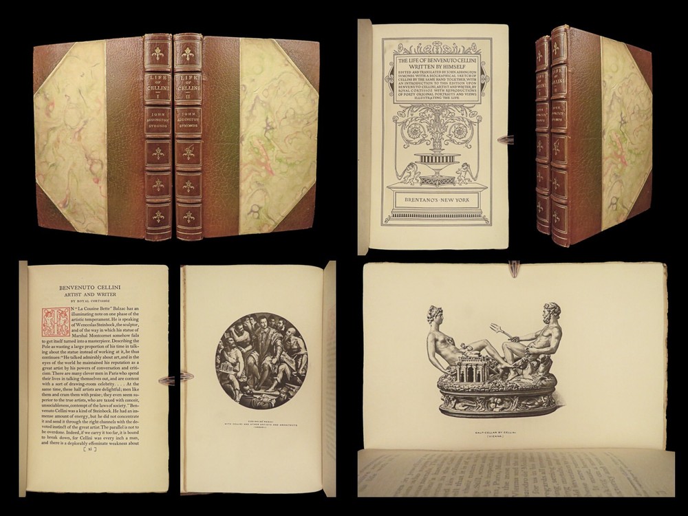 1906 Benvenuto Cellini FAMOUS Memoirs Autobiography Supernatural Visions Demons “ The Life of Benvenuto Cellini ,” as told by himself and interpreted by John Addington Symonds, unravels the tapestry of the Italian Renaissance through the eyes of the acclaimed goldsmith and sculptor. This autobiography, brimming with dynamic accounts of artistic triumphs and personal trials, sheds light on the era’s cultural and social intricacies. It details Cellini’s encounters with notable figures, his fervent devotion to craftsmanship, and his unfiltered personal experiences, ranging from artistic creation to turbulent adventures. This edition, adorned with 41 original engravings, offers a multifaceted view of a man who exemplifies the Renaissance’s intricate blend of artistry, ambition, and human complexity. Item number: #41665 Price: $499 CELLINI, Benvenuto; SYMONDS, John Addington (Editor; Transl.) The Life of Benvenuto Cellini Written by Himself. Edited and Translated by John Addington Symonds with a Biographical Sketch of Cellini by the Same Hand Together with an Introduction to this Edition Upon Benvenuto Cellini, Artist and Writer, by Royal Cortissoz with Reproductions of Forty Original Portraits and Views Illustrating the Life. New York: Brentano’s, ©1906. First Edition Thus. Details : · Collation: Complete; 2 volumes o Vol. I – xxix, [1], 359, [1] o Vol. II – viii, 386, [2] o 41 illustrations · Edition Note(s): o Copyright: “Published October, 1906” · Language: English · Binding: Leather; tight and secure · Size : ~9.5in X 6.25in (24cm x 16cm) Our Guarantee: Very Fast. Very Safe. Free Shipping Worldwide. Customer satisfaction is our priority! Notify us with 7 days of receiving, and we will offer a full refund without reservation! 41665