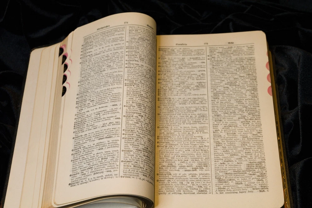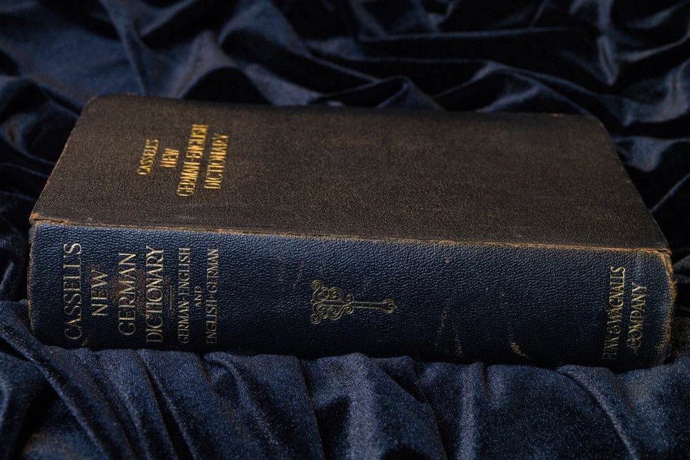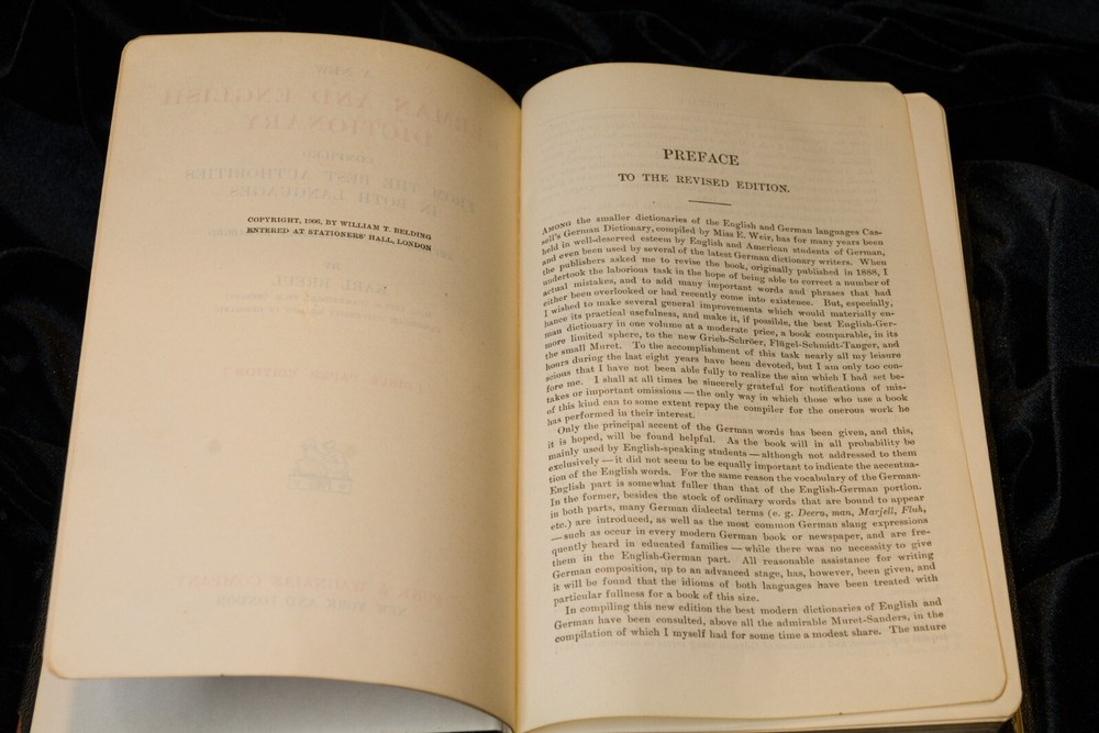 This is a beautiful and rare 1906 edition of Cassell's New German English Dictionary. It is bound in leather with gold gilded lettering and a Bible paper cover. The dictionary is a valuable resource for those studying German and is an original copy, not a facsimile. The book is also a reference to the German language and culture, making it a great addition to any antique or collectible book collection.