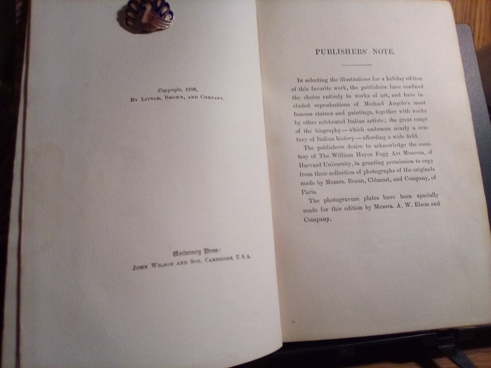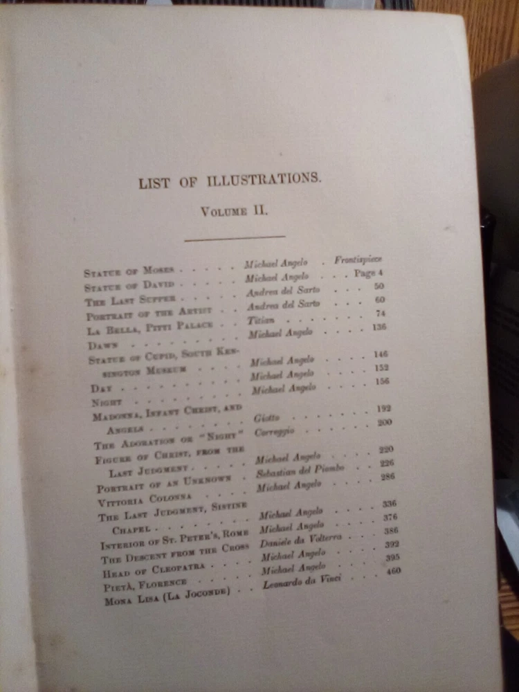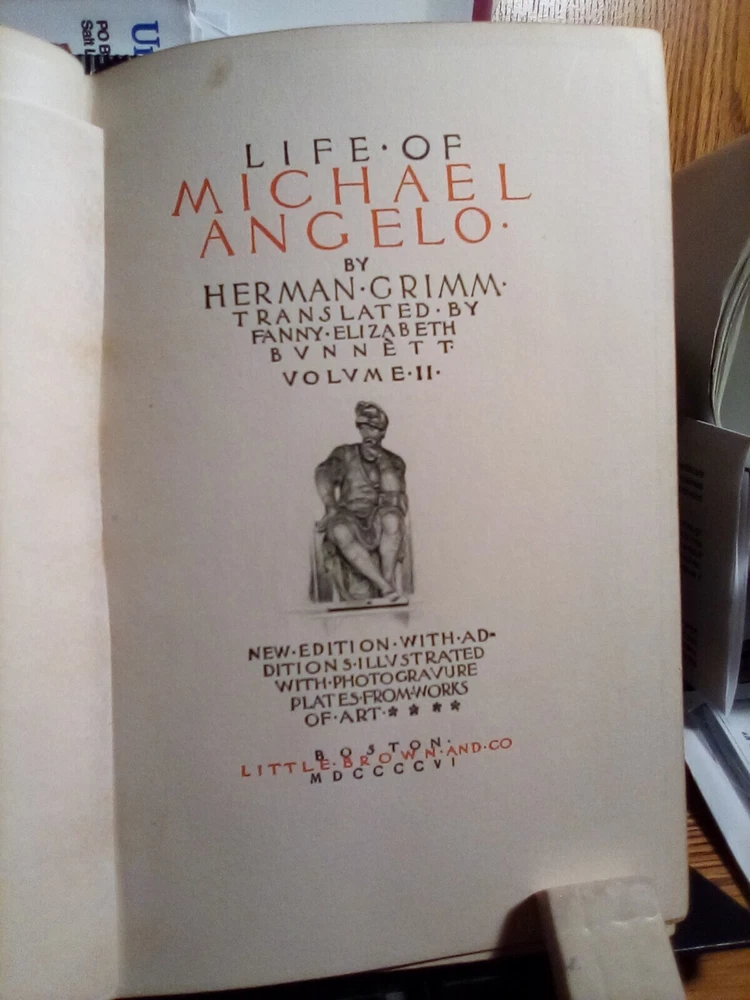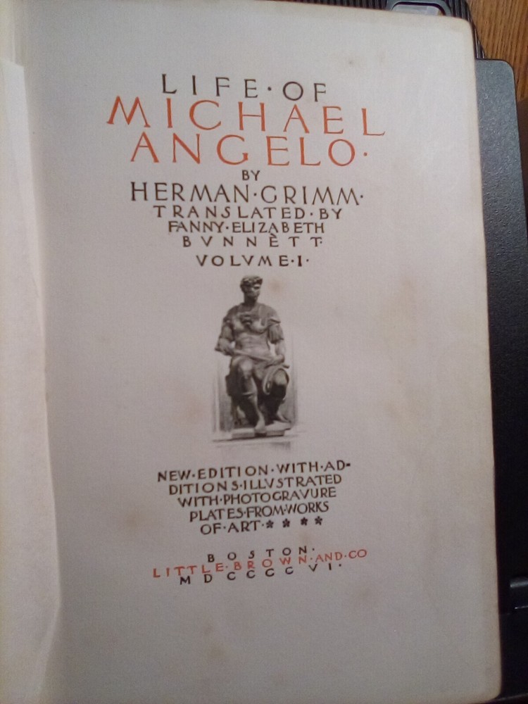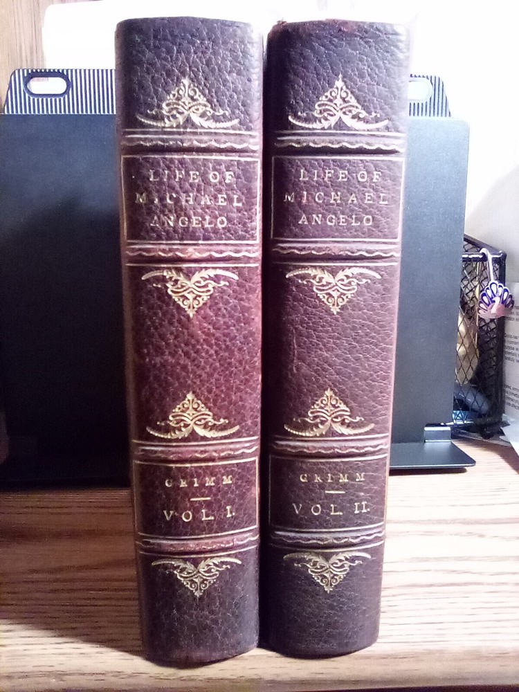 "Life of Michaelangelo" by Herman Grimm, Translated by Fanny Elizabeth Bunnett. Two Volume Set bound in quarter leather. This is the New Edition with additions, illustrated with photogravure plates from works of art, published by Little Brown, Boston, in 1906. These copies are each 5" X 8", 558 pages and 536 pages, illustrated and in good condition.