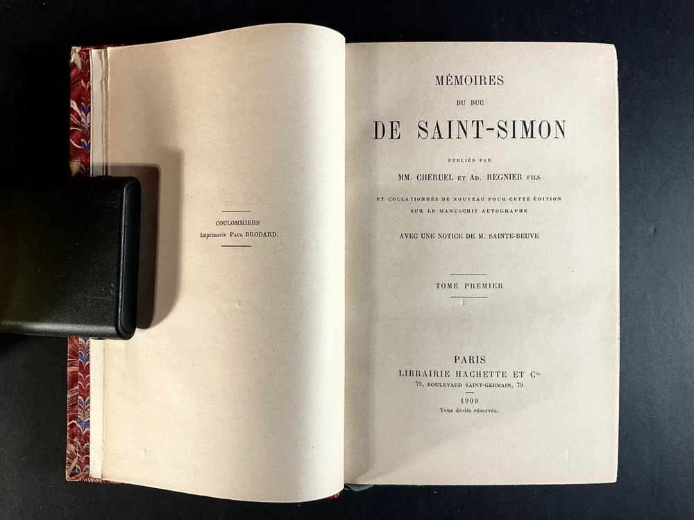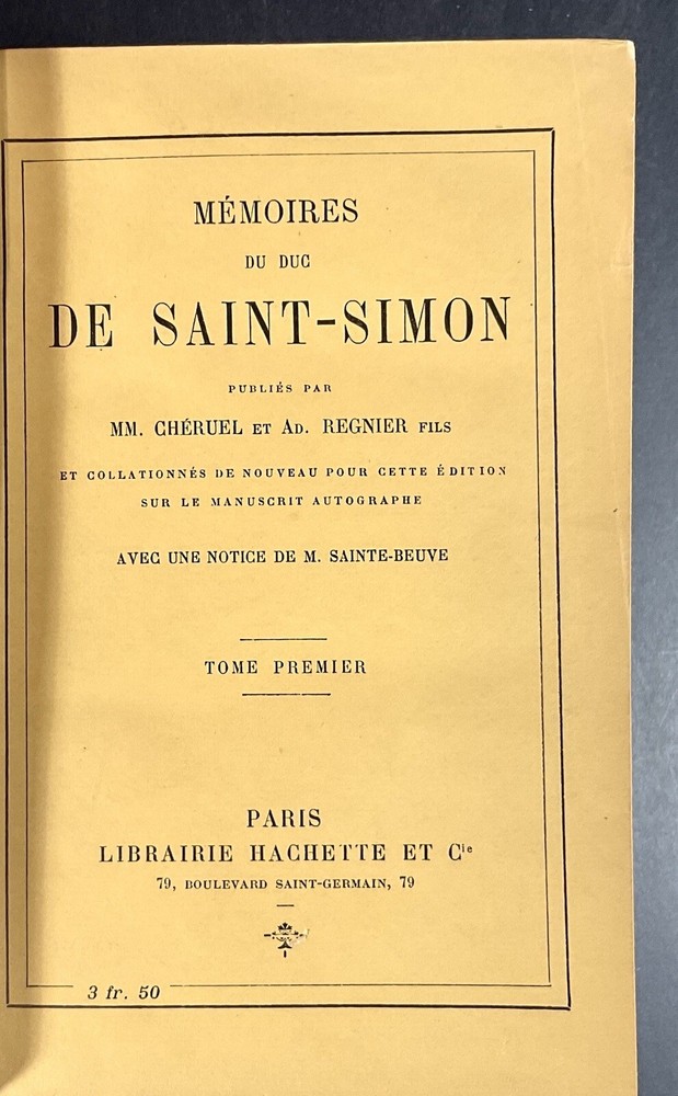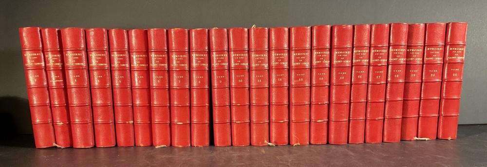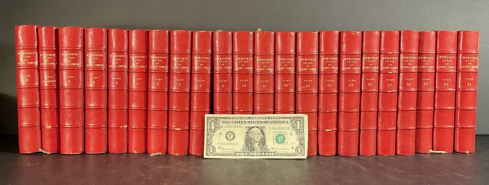 Here are 21 original antique books + ‘Table Alphabetique’ , all ‘Memoires Du Duc De Saint- Simon. Author is Par M. Paul Guerin. This volume set has 1-21 and has an additional alphabetic table to make the total number of 22 bound original books. All written in French, these books are in excellent antique condition, with intact firmly bound pages that have had one family ownership. Embed, leather binding, and would be wonderful as a display as well as to be read. Again, all these volumes have been very low here for and work kept in a closed bookcase to preserve the integrity of these books. . The measurement of each volume is approximately 7“ x 5“.