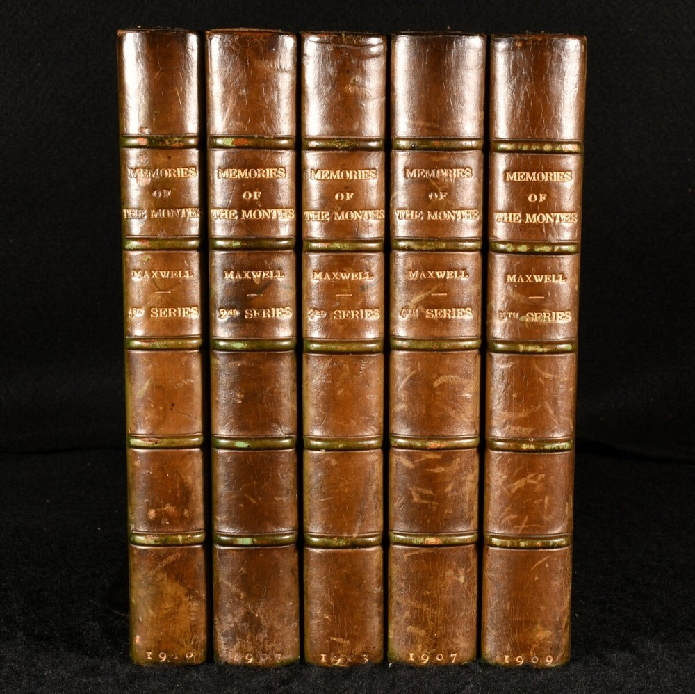 Click here to see our other books! Memories of the Months Sir Herbert Maxwell 1909-1910 Edward Arnold : London 8" by 5" SUMMARY A smartly bound collection of Sir Herbert Maxwell's memoirs. First Edition,Leather Binding Overall Condition: Very Good Indeed This book weighs 5 KG when packed UK Postage: £ 4.49 US Postage: £ 42.99 EU Postage : £ 27.99 European Postage: £ 45.99 Asia Postage: £ 74.99 Worldwide Postage: £ 129.99 DESCRIPTION Comprising the first five series of this work which was eventually seven series total. At the time of publication these five series were all published. With the bookplate of one Ethel Beatrice Edgar to the front pastedown of all volumes. The first volume is a seventh impression, second volume is a third impression, third volume is a second impression, fourth volume is a first edition and the fifth volume is also a first edition. With illustrated frontispieces to all volumes. Sir Herbert Maxwell was a conservative politician who was known for his novels, essays, art, and angling. He had many antiquarian interests and was the President of the Society of Antiquaries, Scotland. He led a fascinating life, some of which is documented in these memoirs. CONDITION In uniform half calf bindings, with paper covered boards. Externally, smart. Minor fading and several marks to the spines. Bookplate to the front pastedown of all volumes. Internally, all volumes are firmly bound. Pages are bright. Scattered spotting to the first and last few pages in addition to the occasional plate. Overall Condition: Very Good Indeed GLOSSARY OF TERMS Overall Condition (Dustwrapper condition rating is shown after that for the book itself, where a dustwrapper is present) Fine - Very well preserved copy showing very little wear Very Good Indeed - Only one or two minor faults, really a very attractive copy Very Good - Quite a wide term meaning no major faults but probably several smaller ones often expected given the age of the book, but still a respectable copy Good - Meaning not very good. Some more serious faults as will be described in the condition report under 'condition' Good Only - Meaning one or more faults that could really do with repair Fair - As with good only above but with other faults leaving a compromised copy even after repair Poor - Really bad and possibly seriously incomplete. We only sell books in this condition where their rarity or value makes them attractive none the less. Major defects will be described. GUARANTEE We offer a full money back guarantee on our descriptions. Please ask for details and conditions. We prefer PAYPAL. If you pay via PAYPAL we will post the item off the same or the next working day with the postage you have selected. Please note we cannot accept USD cheques