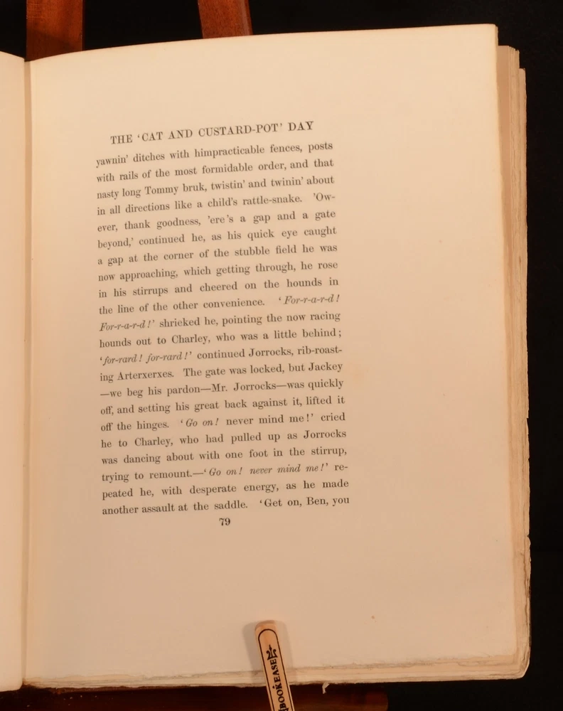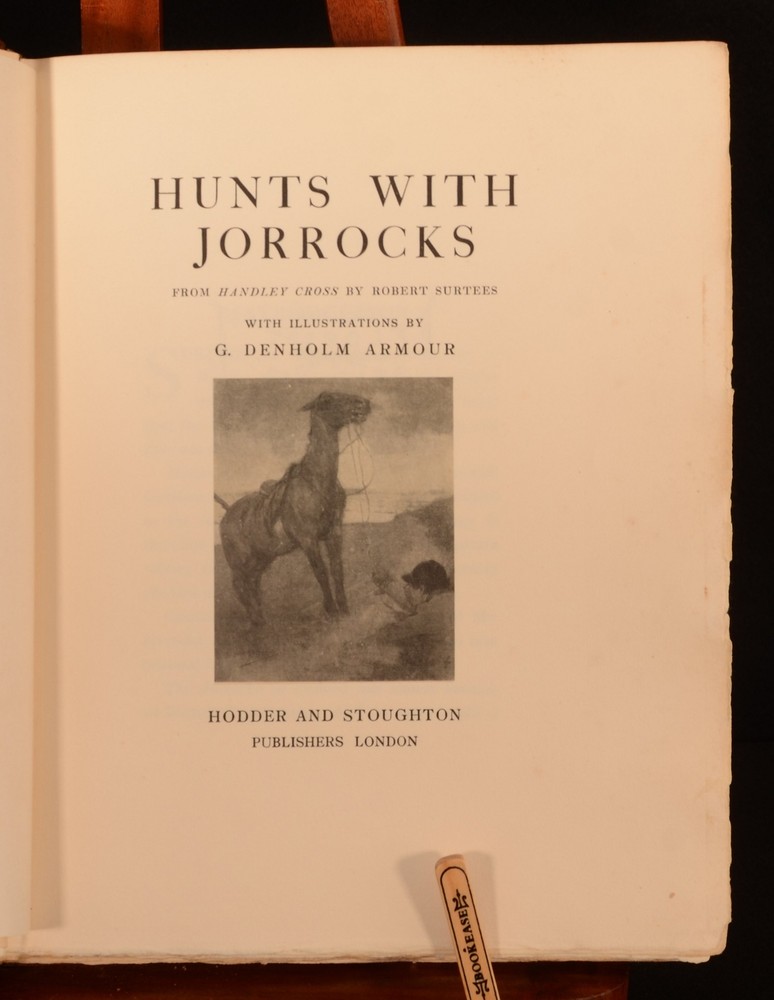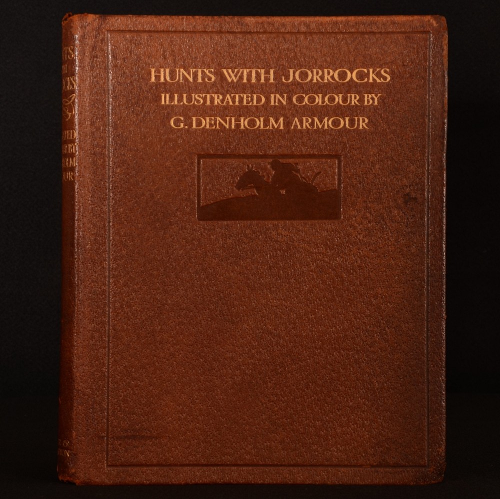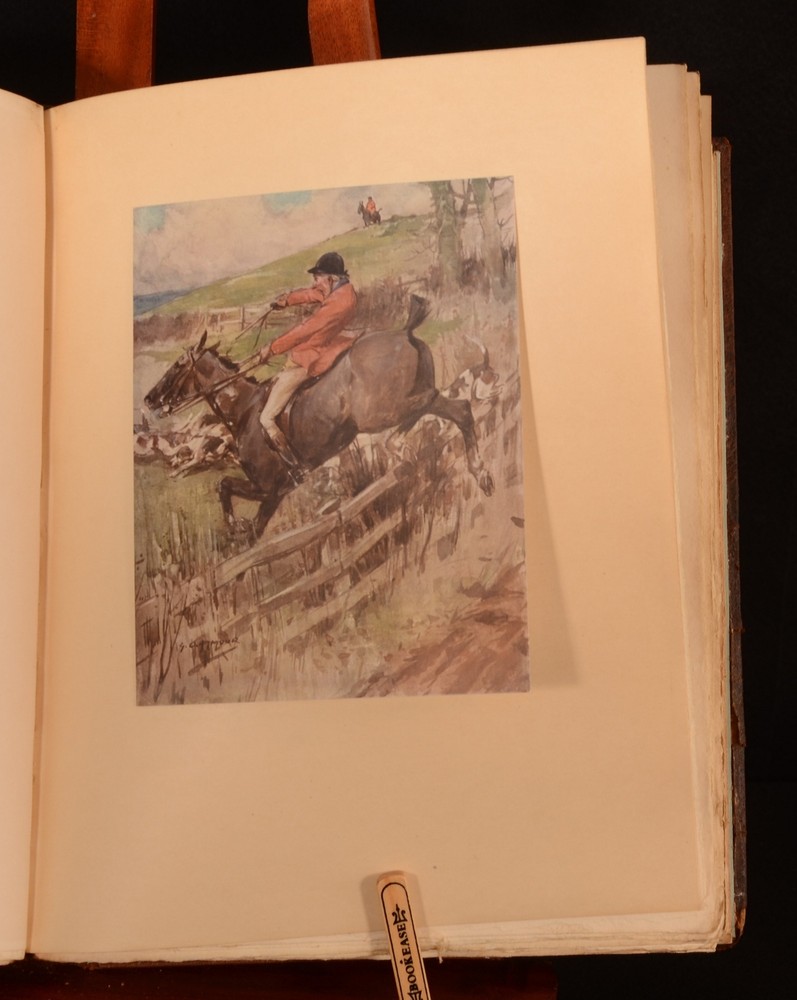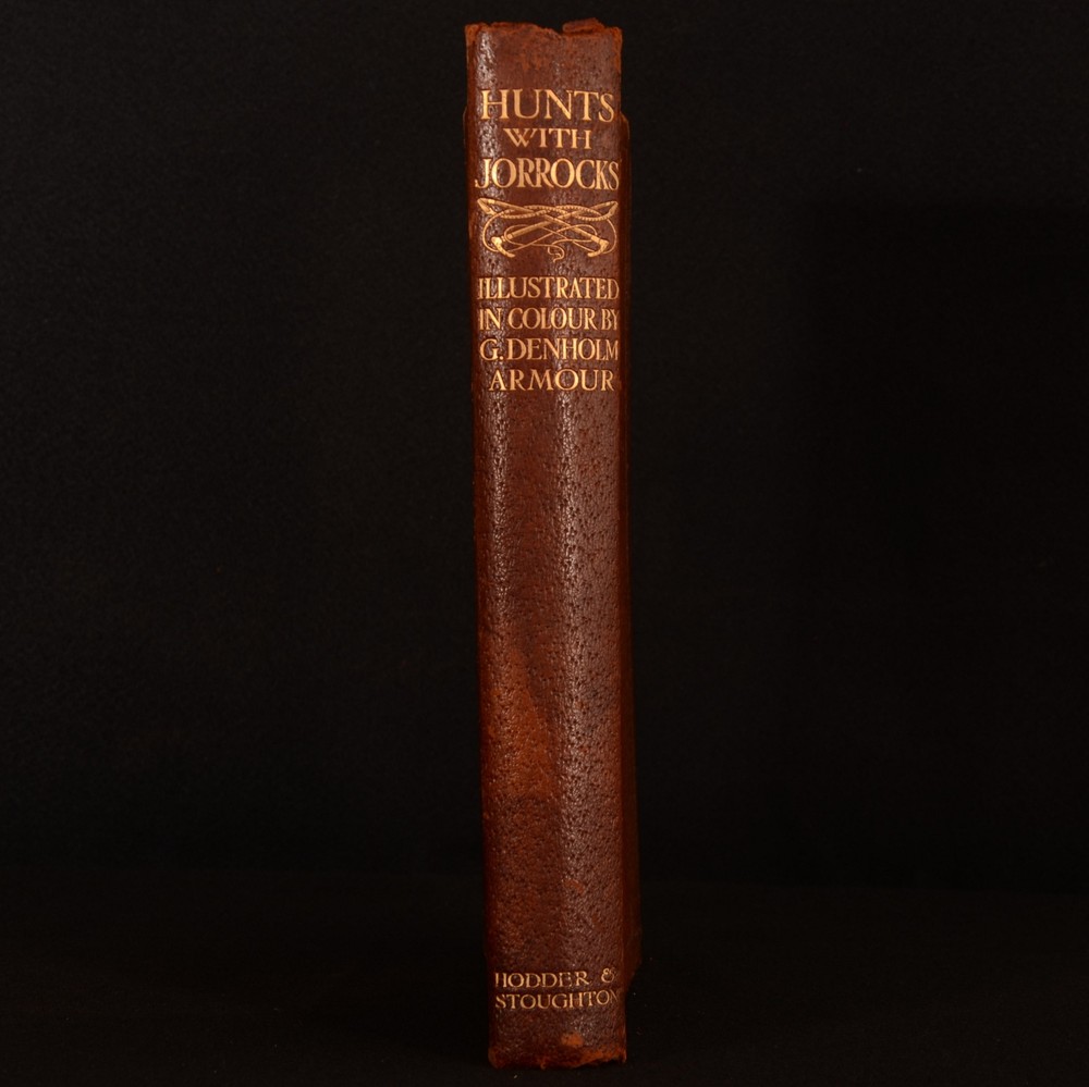 Click here to see our other books! Hunts with Jorrocks Robert Surtees 1908 Hodder and Stoughton : London 11.5" by 9.5" [8pp] 215pp [plus plates] SUMMARY An uncommon first thus edition copy of this work by Robert Smith Surtees, copiously illustrated throughout and signed by the renowned British artist George Denholm Armour. Colour Plates,First Edition,Illustrated,Leather Binding,Publishers' Original Binding,Signed,Uncommon Overall Condition: Very Good This book weighs 2 KG when packed UK Postage: £ 3.99 US Postage: £ 29.99 EU Postage : £ 21.99 European Postage: £ 23.99 Asia Postage: £ 37.99 Worldwide Postage: £ 38.99 DESCRIPTION This edition was limited to three hundred and fifty copies, numbered and signed by the artist. This copy is numbered 'No. 198', and signed by Armour to the colophon. Collated, complete with twenty five tipped in coloured plates by Armour, and several black and white illustrations throughout the text. Robert Smith Surtees was an English editor, novelist and sporting writer best known for his contributions to the first English sporting periodical to devote itself to every type of sport, 'The Sporting Magazine'. Surtees launched his own sporting magazine entitled the 'New Sporting Magazine' in 1831, contributing the comic papers which appeared as 'Jorrocks' Jaunts and Jollities' in 1838. Jorrocks, the eponymous, vulgar and artful sporting cockney grocer was a great success with the public and is often considered as one of the great comic characters of English Literature, appearing in many of Surtees works such as this text, 'Hunts with Jorrocks'. Featuring a tipped in bookplate of a 'John Hicks Graves, of Bradenham'. CONDITION In the publisher's original full leather binding, with gilt and blind stamped detail to the front board. Externally, slight rubbing to extremities and head and tail of spine, resulting in slight loss to leather. Prior owner's bookplate tipped to front pastedown. Ink inscription by artist to limited edition colophon. Internally firmly bound. Pages rough cut to extremities, but bright and clean. The odd light spot to the occasional page. Mark to lower fore edge of page 15, not affecting text. Overall Condition: Very Good GLOSSARY OF TERMS Overall Condition (Dustwrapper condition rating is shown after that for the book itself, where a dustwrapper is present) Fine - Very well preserved copy showing very little wear Very Good Indeed - Only one or two minor faults, really a very attractive copy Very Good - Quite a wide term meaning no major faults but probably several smaller ones often expected given the age of the book, but still a respectable copy Good - Meaning not very good. Some more serious faults as will be described in the condition report under 'condition' Good Only - Meaning one or more faults that could really do with repair Fair - As with good only above but with other faults leaving a compromised copy even after repair Poor - Really bad and possibly seriously incomplete. We only sell books in this condition where their rarity or value makes them attractive none the less. Major defects will be described. GUARANTEE We offer a full money back guarantee on our descriptions. Please ask for details and conditions. We prefer PAYPAL. If you pay via PAYPAL we will post the item off the same or the next working day with the postage you have selected. Please note we cannot accept USD cheques