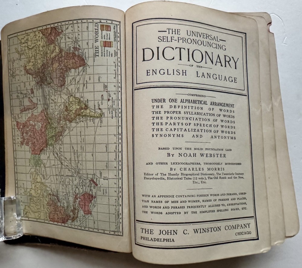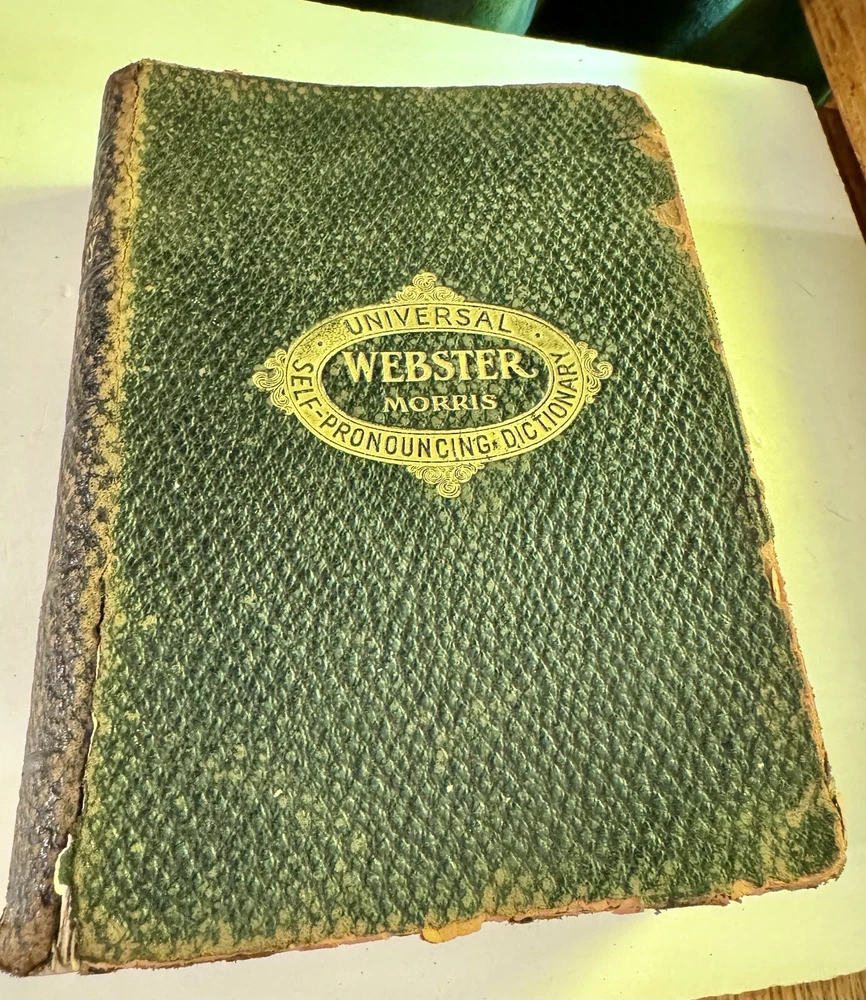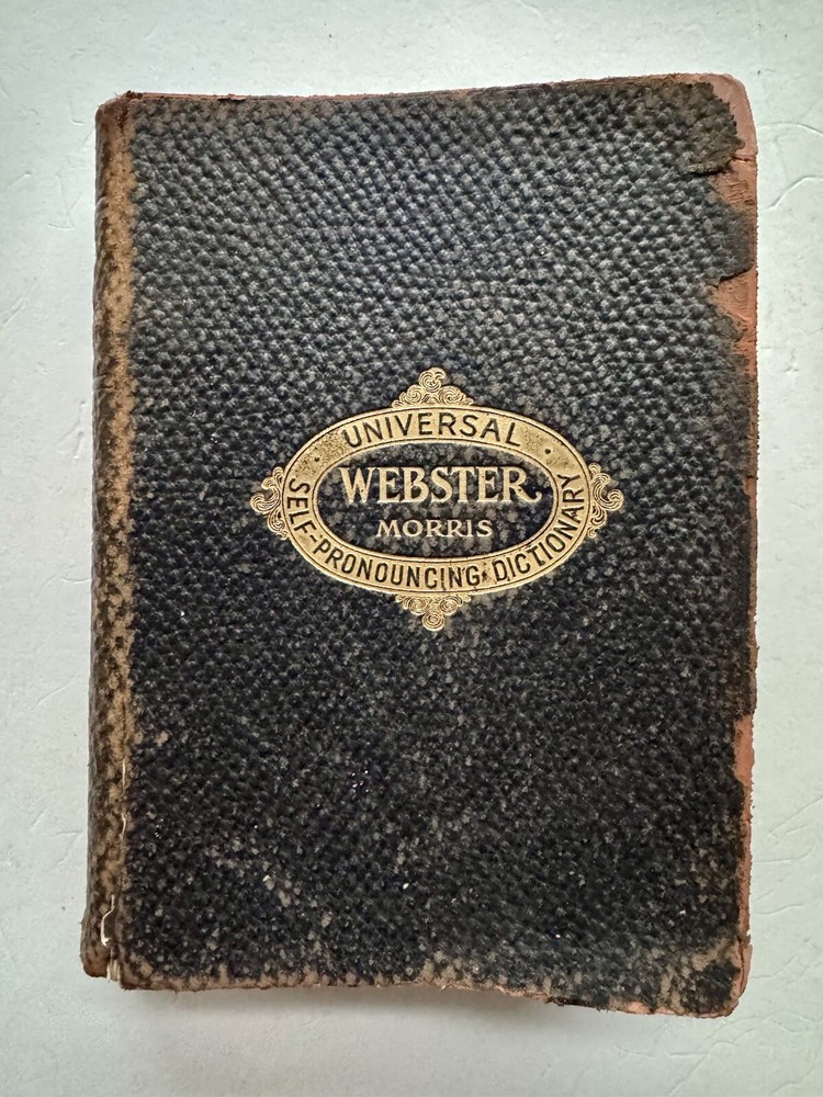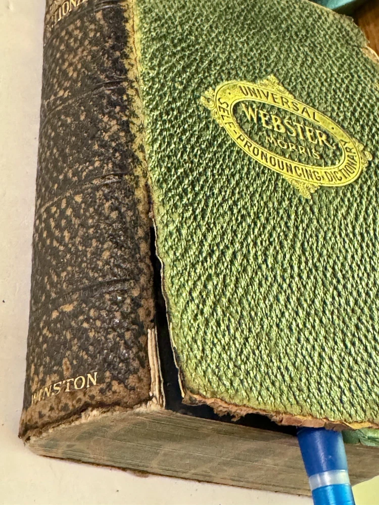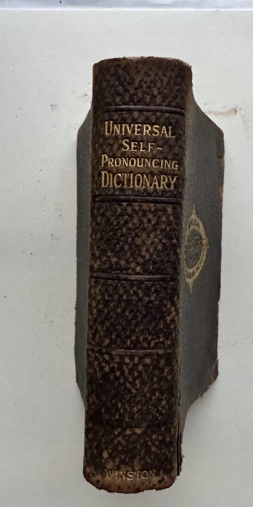 Antique leather bound 1000 page dictionary published in 1908. Leather binding has edge wear and is fragile. Piece broke off corner. Tear along spine front. Rear cover small piece of old tape. Name & date (1910) written inside. No other markings. Pebbled leather flexible cover. Small broken-off piece included. (See all photos)