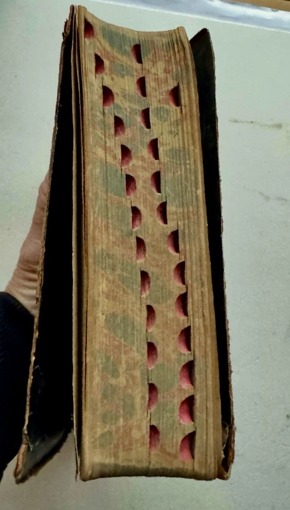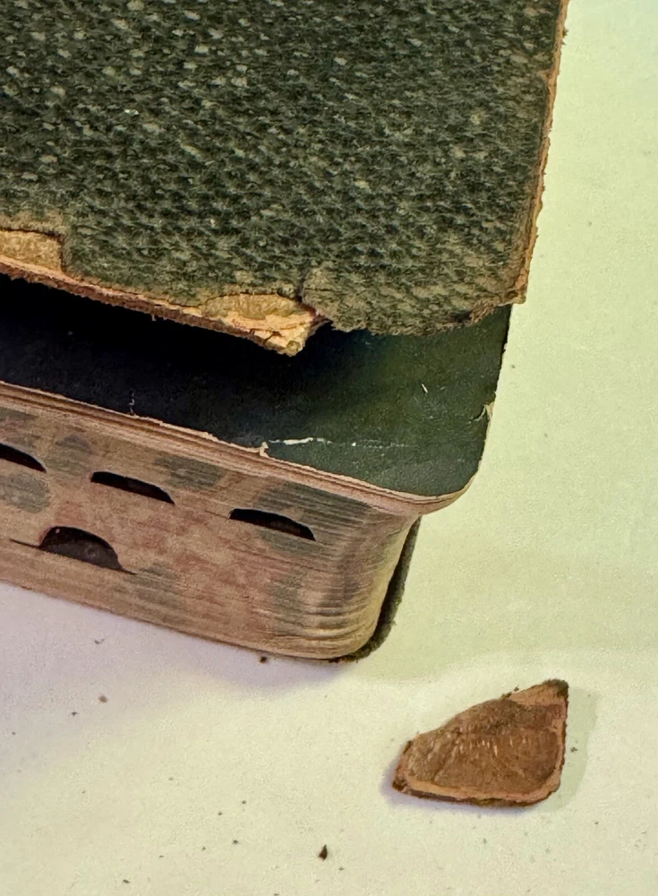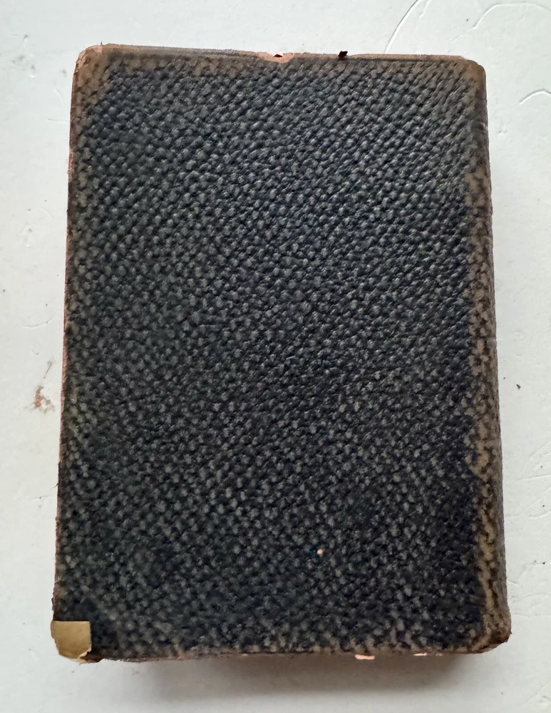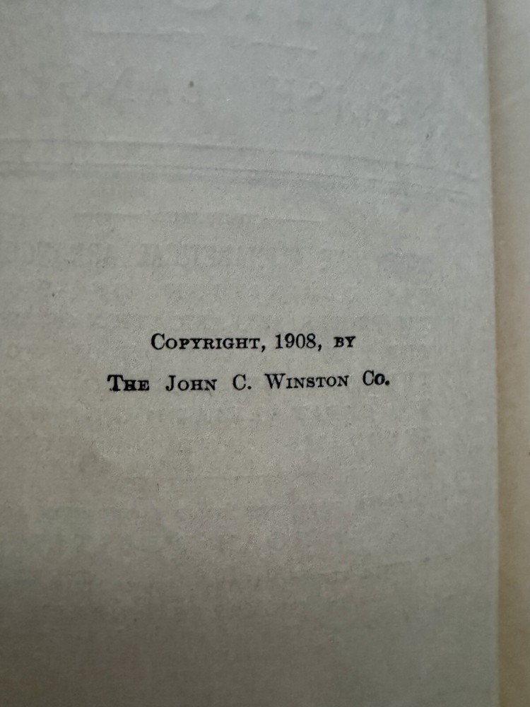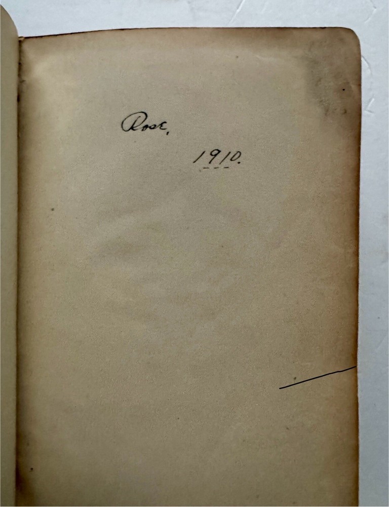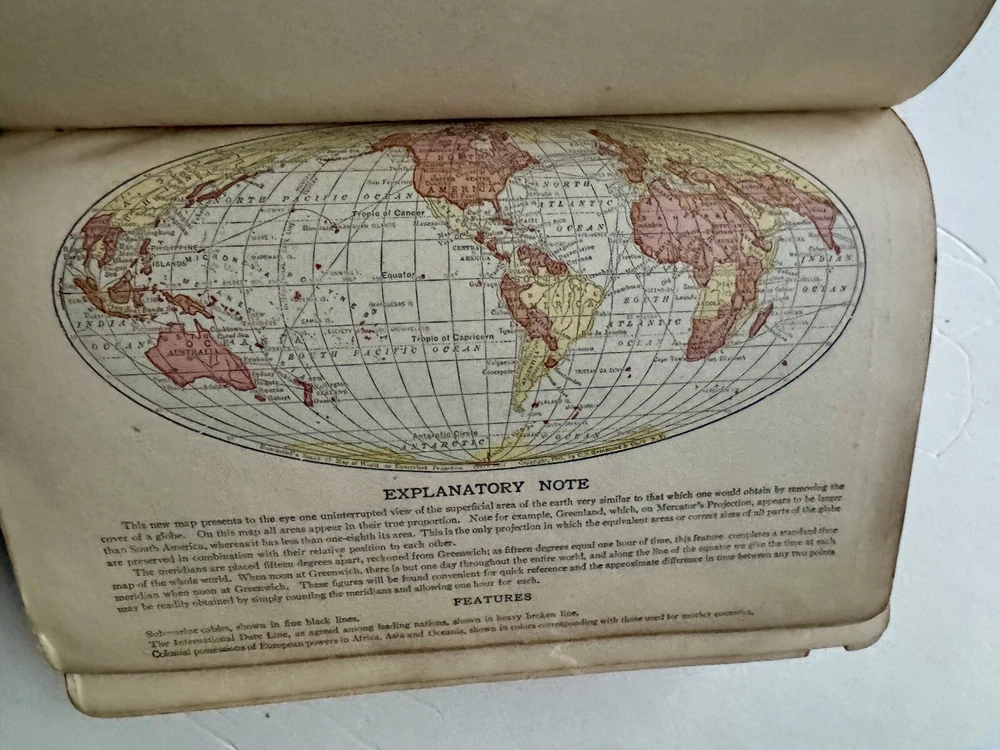 Antique leather bound 1000 page dictionary published in 1908. Leather binding has edge wear and is fragile. Piece broke off corner. Tear along spine front. Rear cover small piece of old tape. Name & date (1910) written inside. No other markings. Pebbled leather flexible cover. Small broken-off piece included. (See all photos)