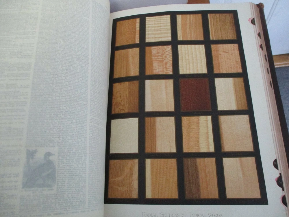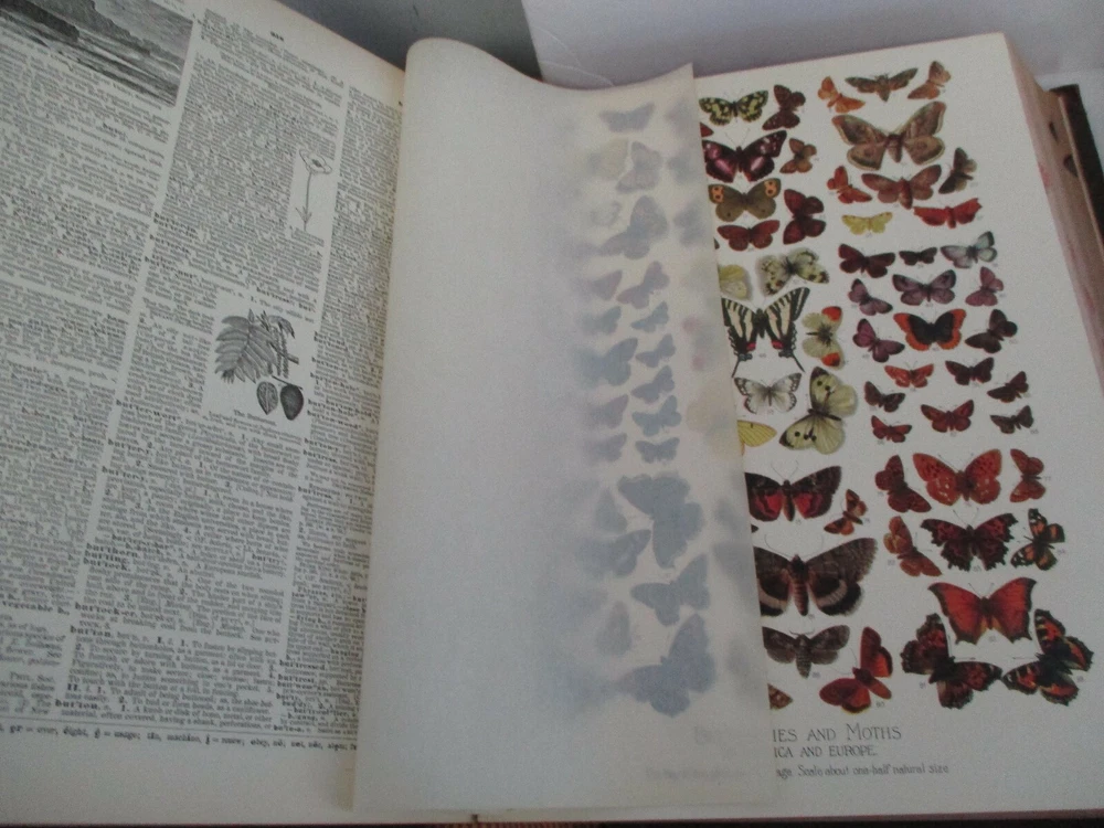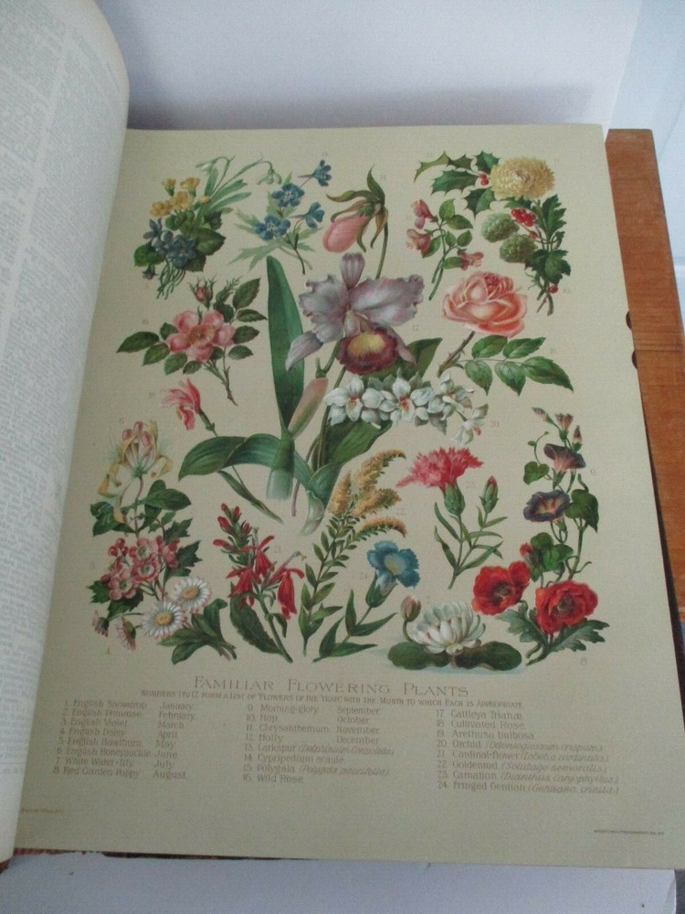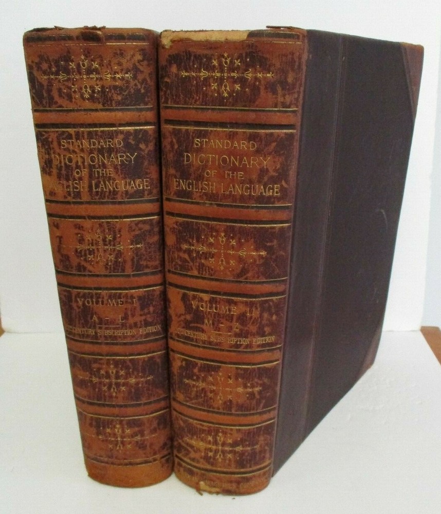 Revised and enlarged edition prepared by more than 200 specialists and other scholars. Publisher's agent's stamp and tickets attached to front endpaper. Each volume measures 12 1/2" x 9 3/4" with 3/4 leather bindings, raised spine bands, gilt spine titling, marbled page edges & endpapers, 2441 pages in total, addenda, appendix, language key, foreign words and phrases, standard atlas of the world with condensed cyclopedia, etc. Many b+w text illustrations and color +b+w plates, and color maps. Thank you