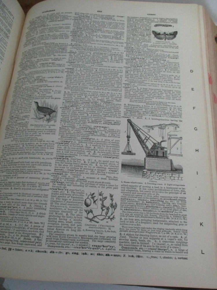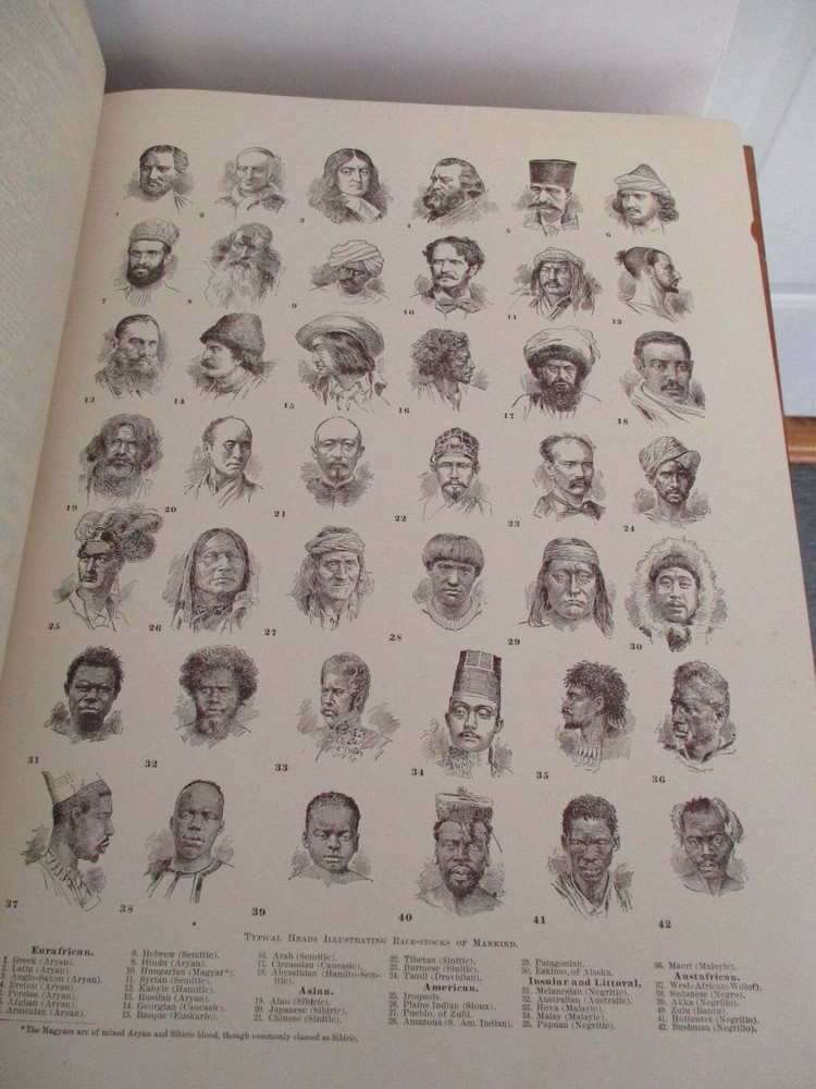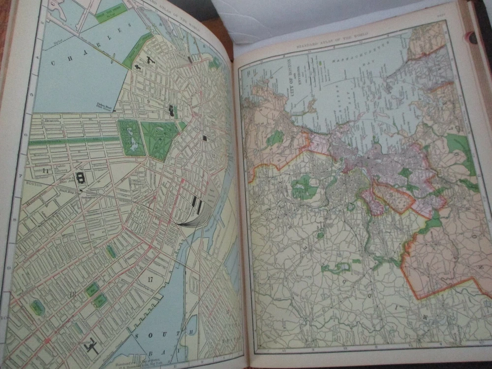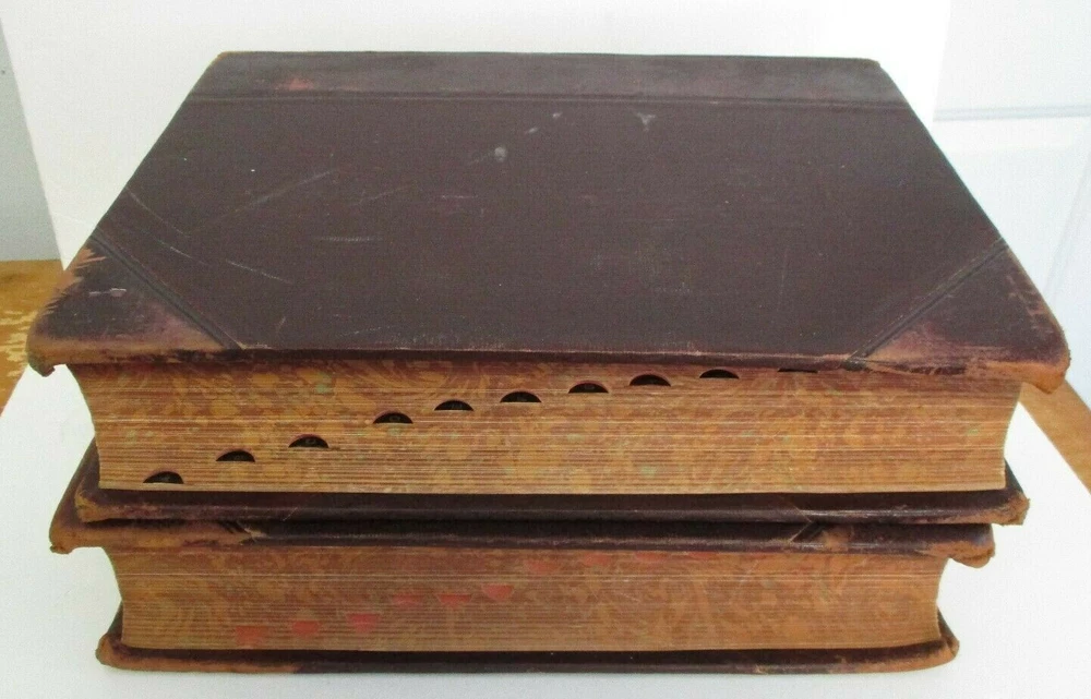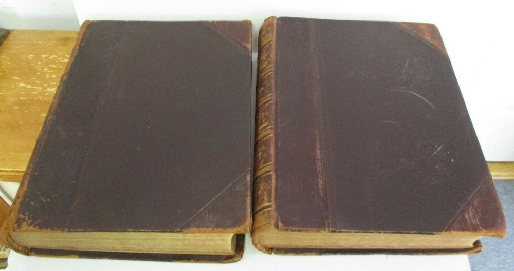Revised and enlarged edition prepared by more than 200 specialists and other scholars. Publisher's agent's stamp and tickets attached to front endpaper. Each volume measures 12 1/2" x 9 3/4" with 3/4 leather bindings, raised spine bands, gilt spine titling, marbled page edges & endpapers, 2441 pages in total, addenda, appendix, language key, foreign words and phrases, standard atlas of the world with condensed cyclopedia, etc. Many b+w text illustrations and color +b+w plates, and color maps. Thank you